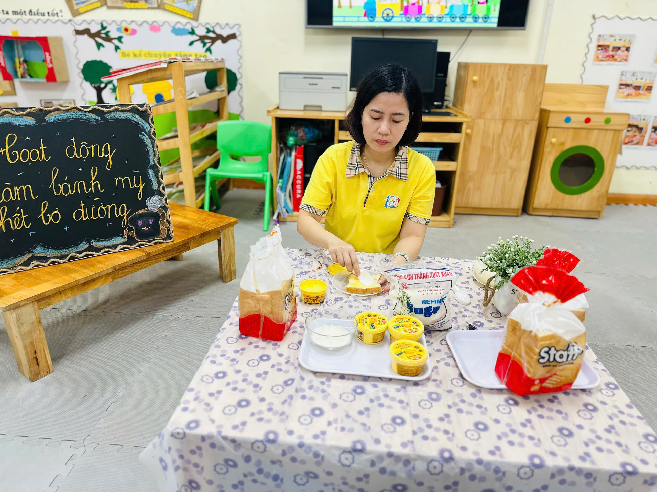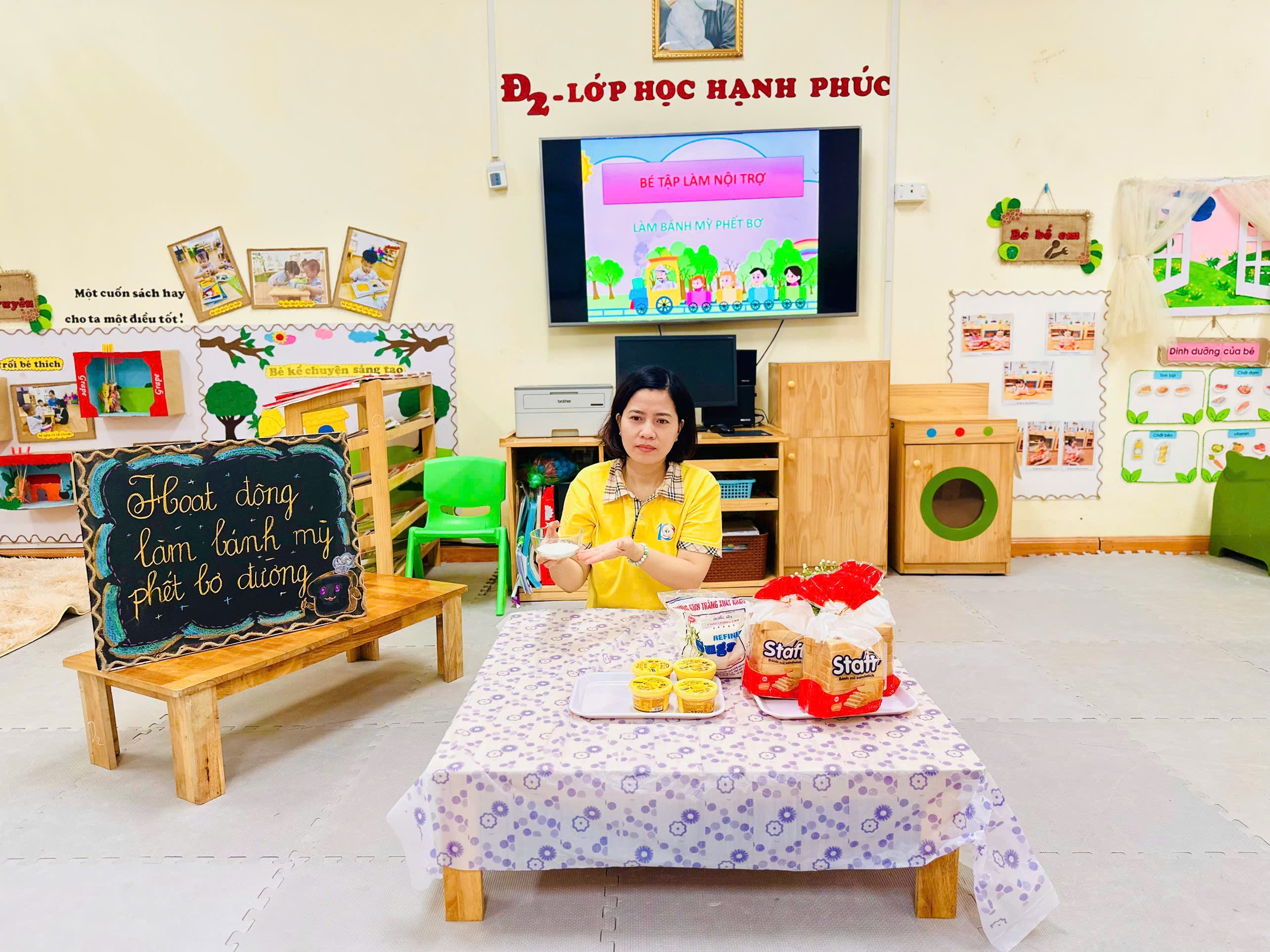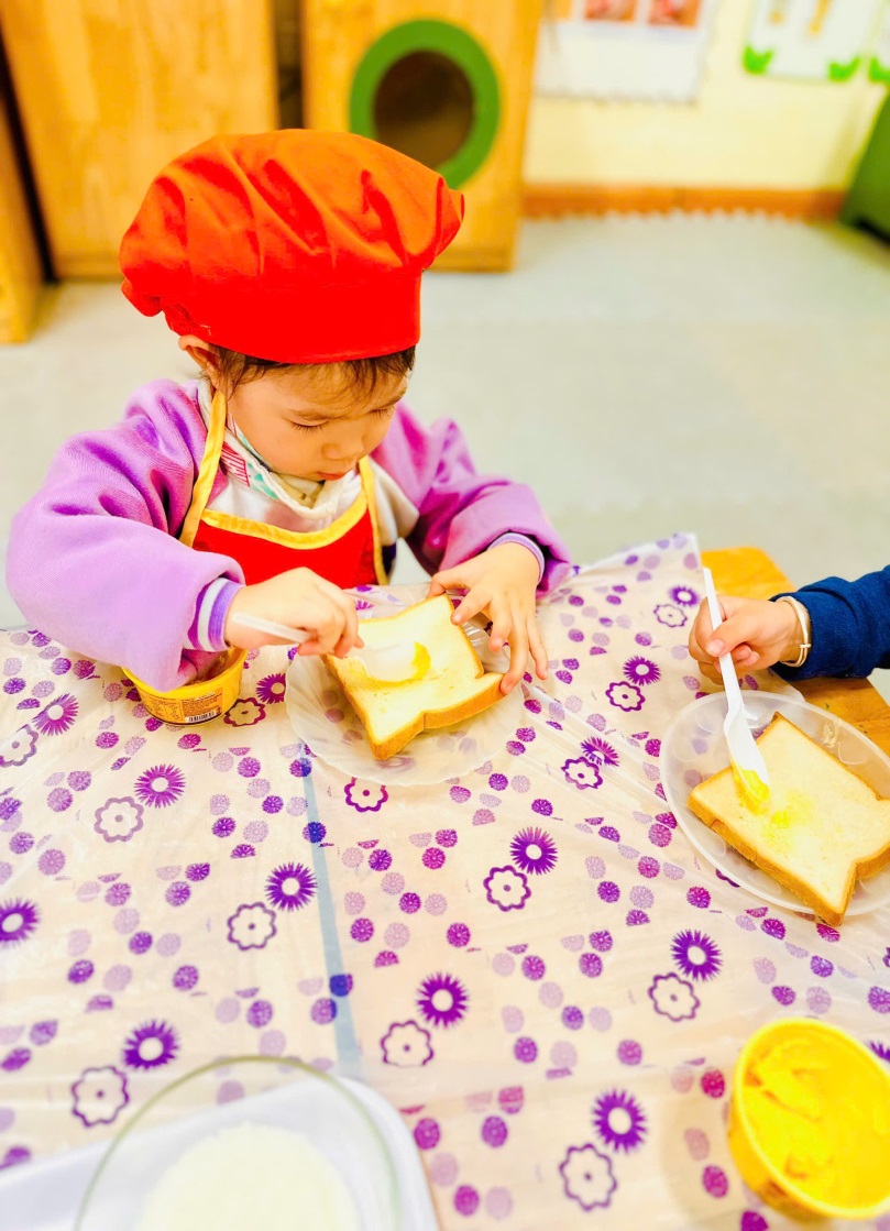Hôm nay, các bạn nhỏ của lớp chúng mình đã có một buổi trải nghiệm thật vui và đầy hào hứng với hoạt động “Bé tập làm nội trợ – Bé làm bánh mì phết bơ”. Đây là một trong những hoạt động giúp trẻ rèn kỹ năng tự phục vụ, phát triển sự khéo léo của đôi tay và tạo hứng thú trong việc ăn uống.
