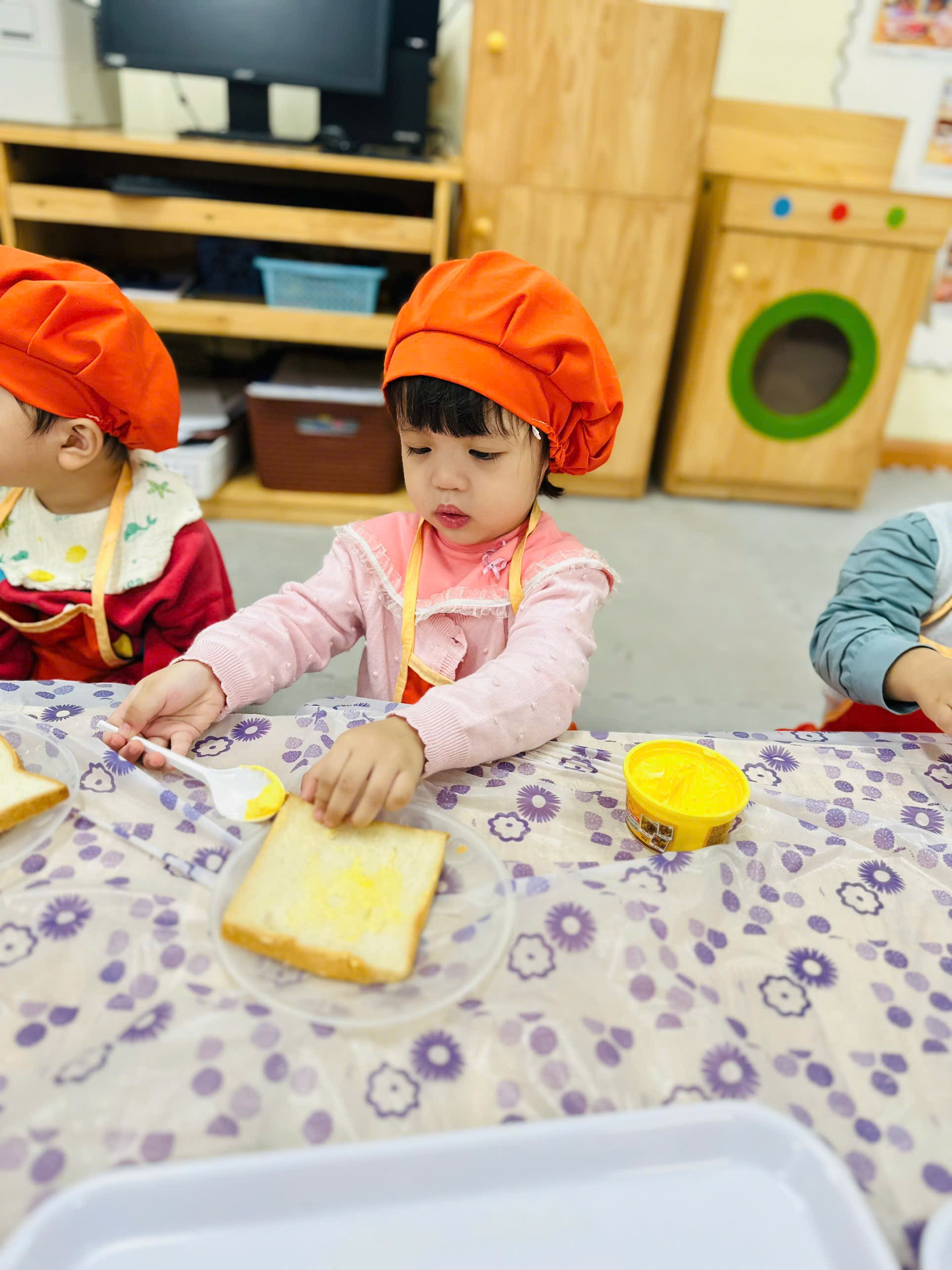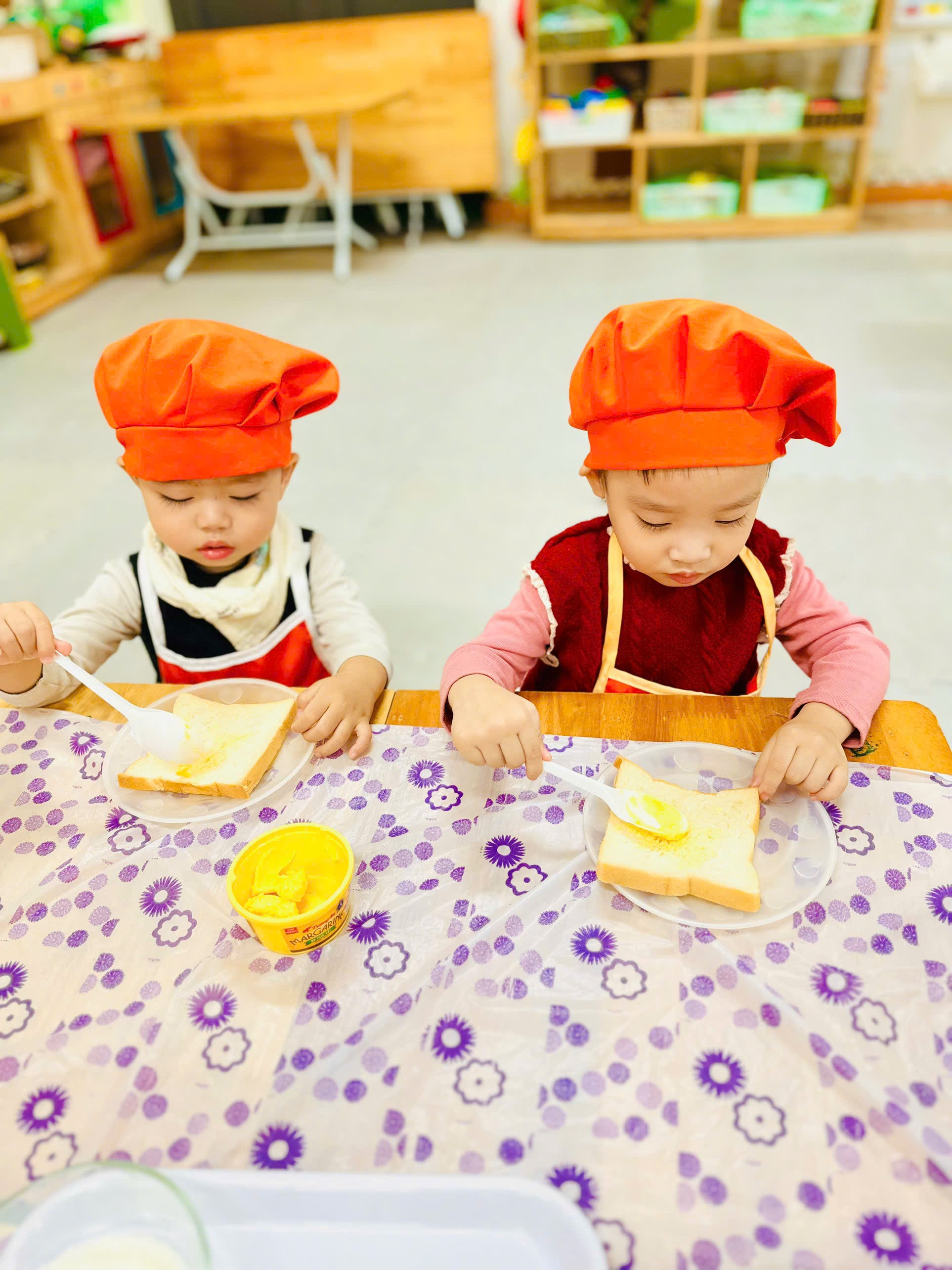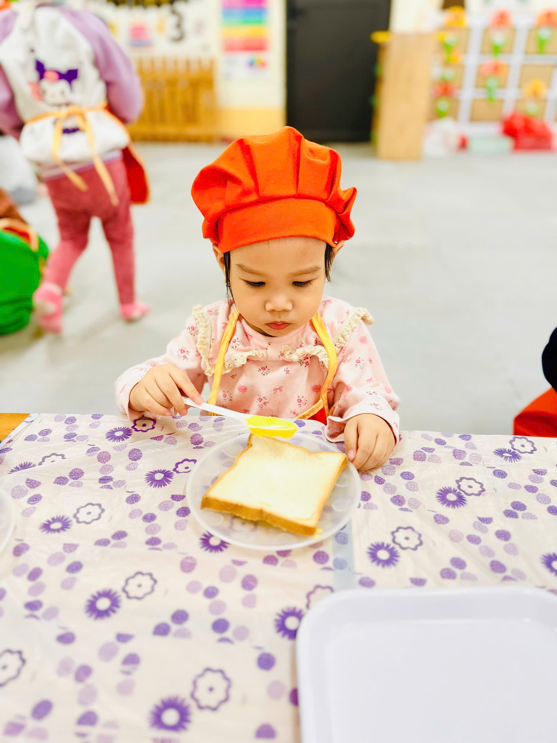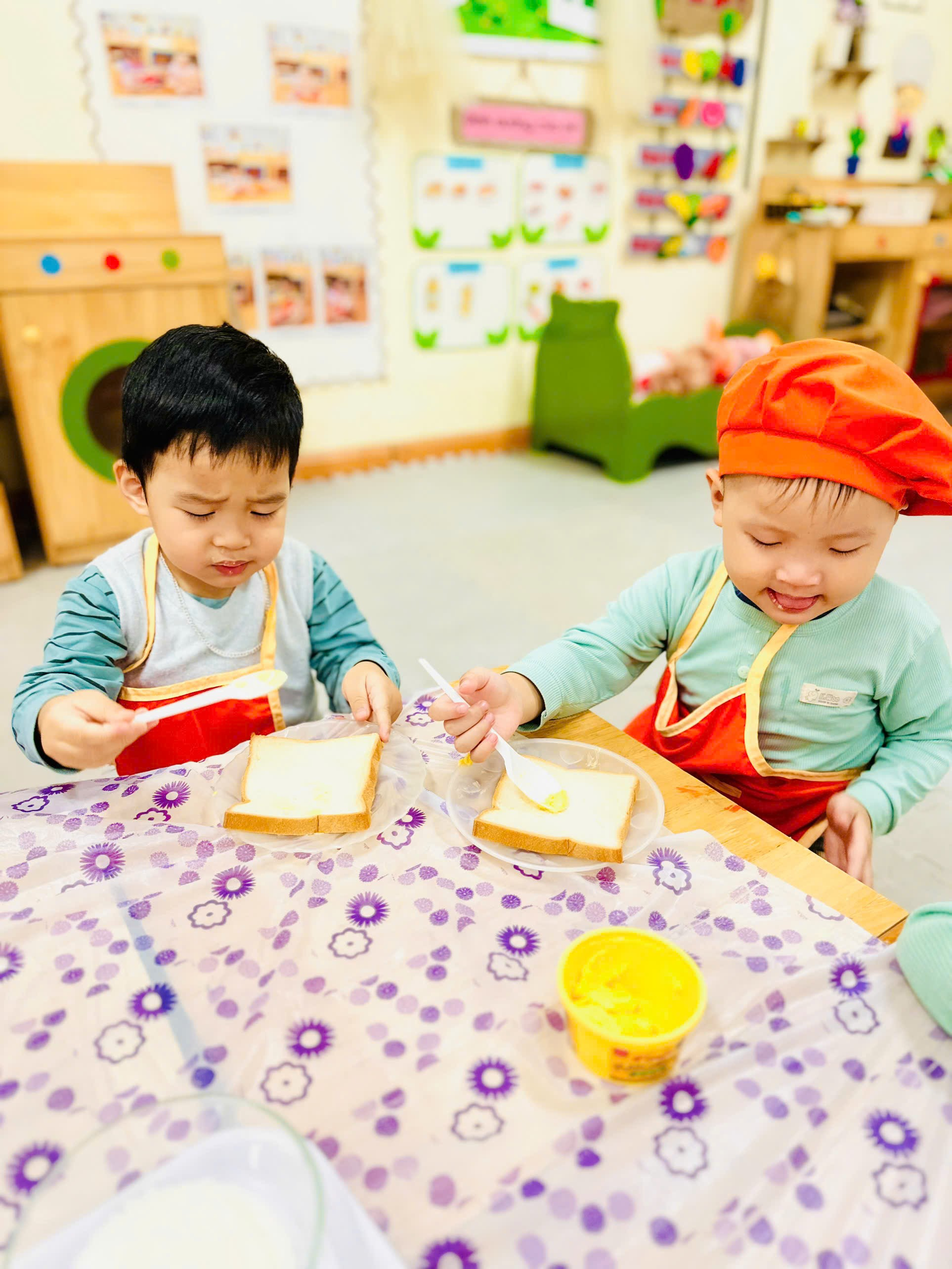 Dưới sự hướng dẫn của cô, các bé rất thích thú khi tự tay cầm dao phết, nhẹ nhàng quét lớp bơ mềm lên mặt bánh mì. Bạn nào cũng cố gắng thật khéo, vừa làm vừa cười tít mắt. Một số bé còn thích trang trí miếng bánh theo cách riêng của mình.
