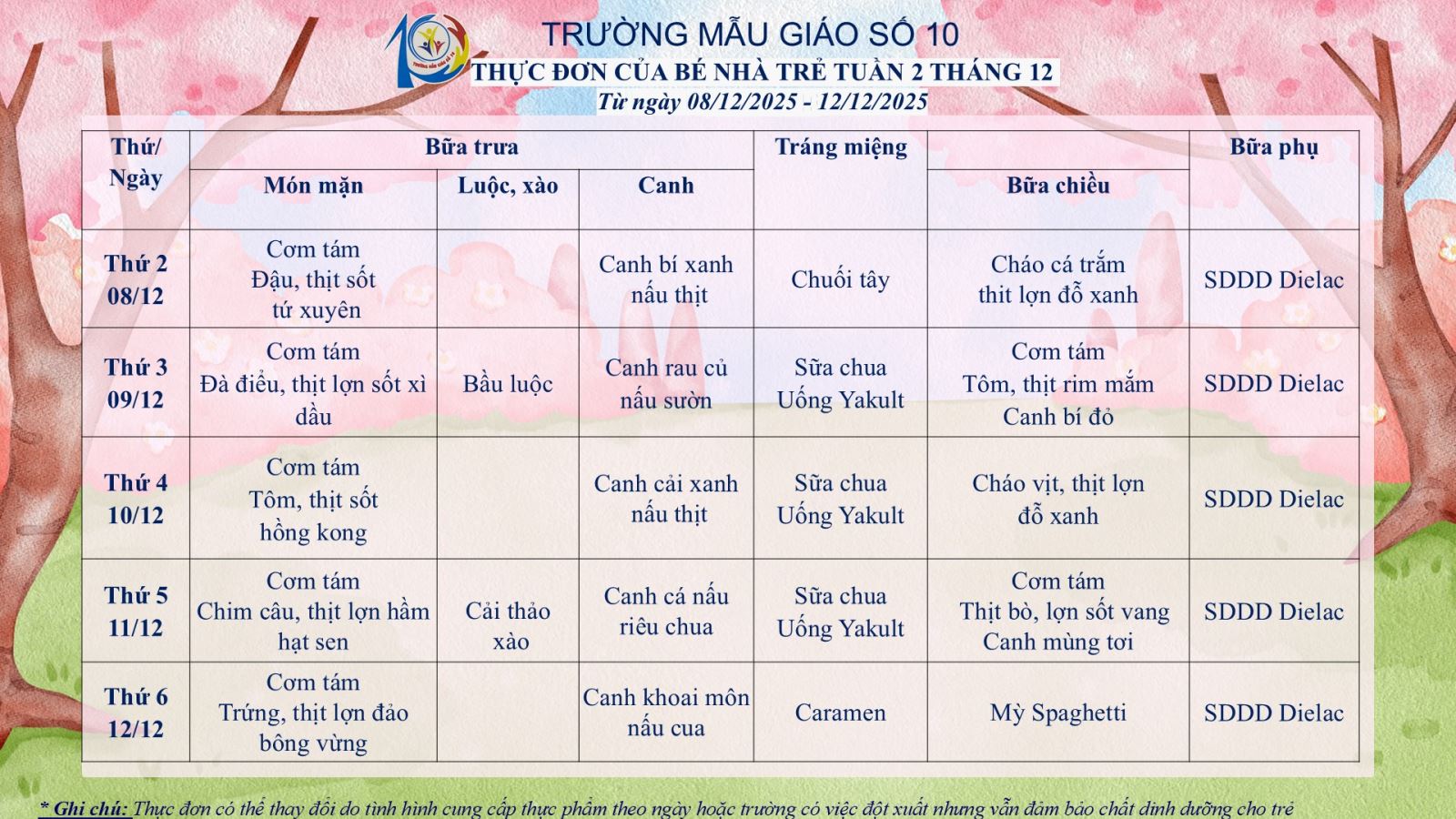Thực đơn tuần 2 tháng 12 cho trẻ mẫu giáo - Trường Mẫu Giáo Số 10