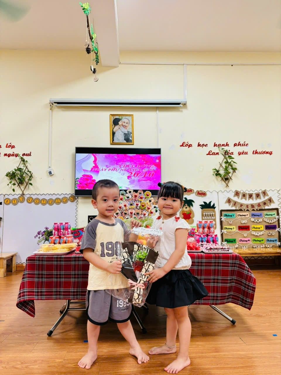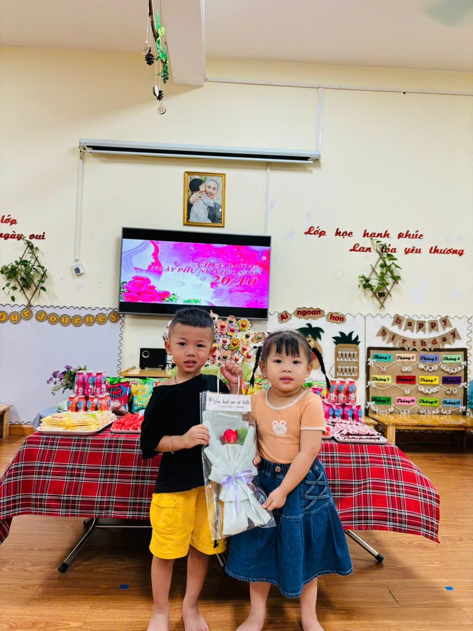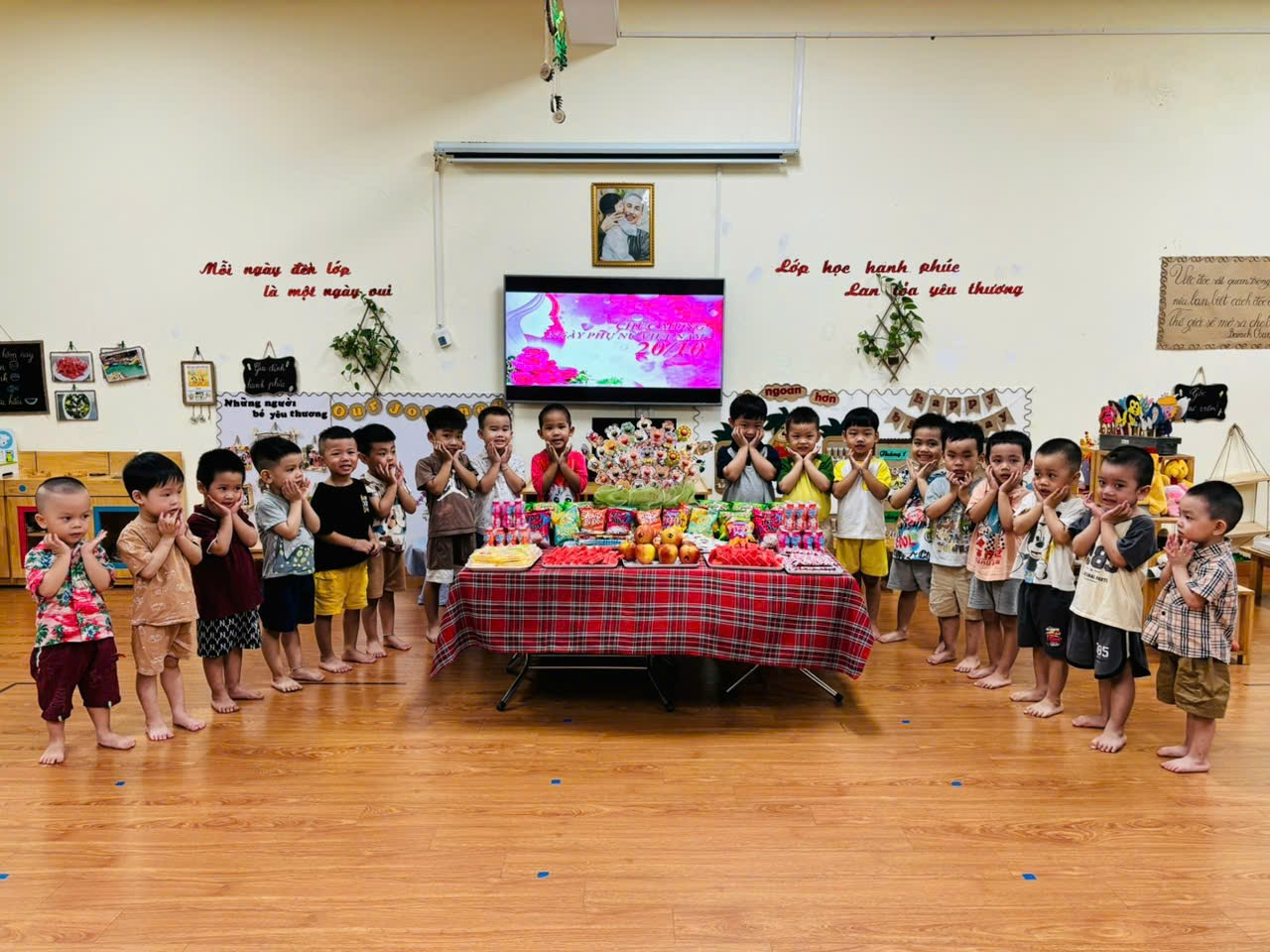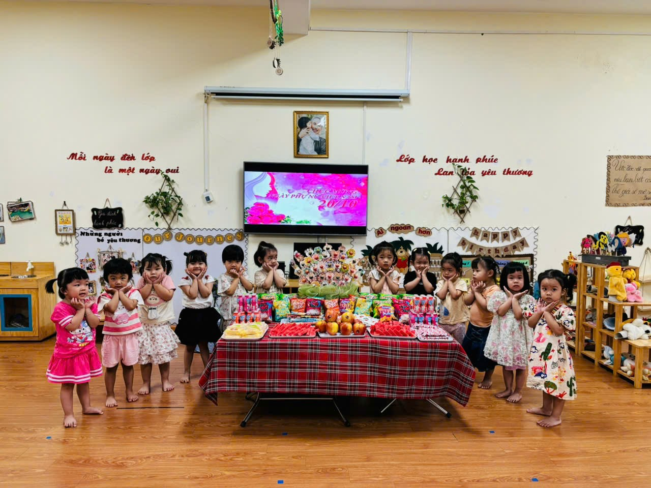 Các con còn được tham gia liên hoan mừng Ngày Phụ nữ Việt Nam với mâm cỗ có các loại bánh kẹo, bim bim, thạch, dưa hấu,… Các con rất vui vẻ phấn khởi khi được ăn liên hoan với các bạn cùng lớp.