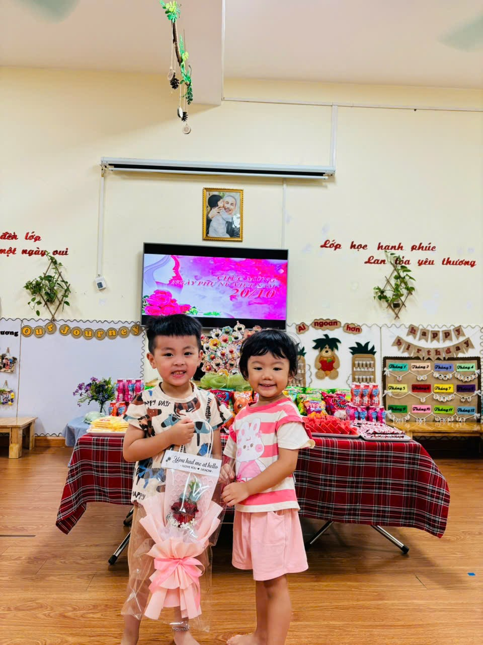 Ngoài ra ở lớp các bạn con trai đã dành những bó hoa xinh đẹp để tặng cho các bạn gái trong lớp, các bạn đã rất vui khi nhận được những nón quà này.