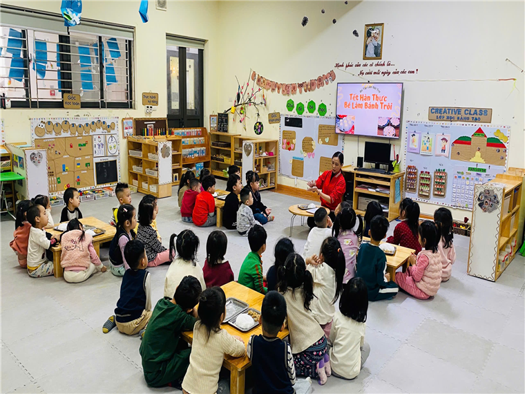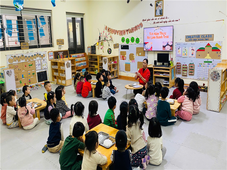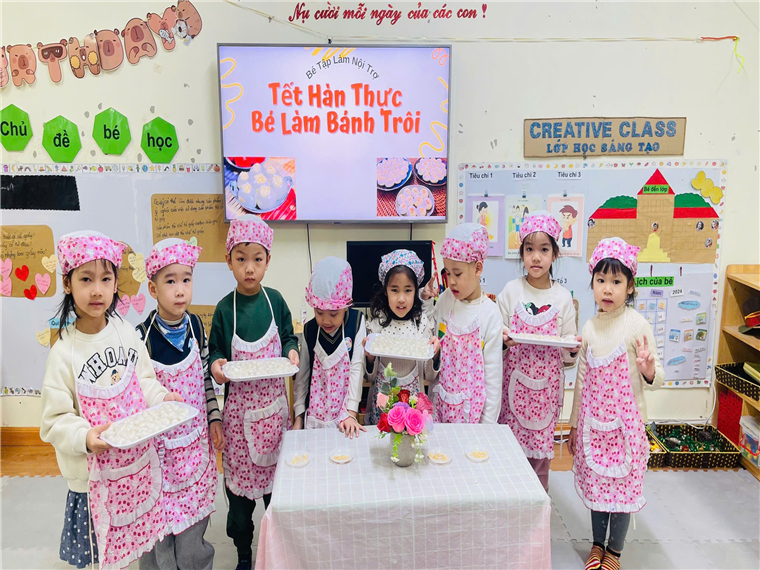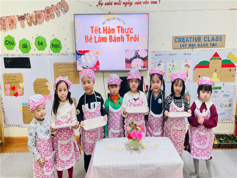 Hôm nay, bài học của các bé không chỉ đơn giản là những câu ca điệu múa, bài thơ… mà lại thơm nồng mùi bột nếp, đường mật mía: bài học về cách làm bánh trôi.. Ở mỗi lớp cô giáo đã kể cho các con nghe về sự tích ngày tết Hàn thực . Được nghe cô giới thiệu rất kĩ về nguyên liệu, cách làm bánh trôi, nên khi thực hành nặn bánh, chẳng bạn nào bỡ ngỡ. Gì chứ xoay tròn, ấn bẹt chúng mình được học mãi trong tiết nặn rồi, nên thao tác ngắt bột, ấn đường, xoay tròn để cho ra sản phẩm là những viên bánh trôi trắng phau, tròn vo chẳng khó khăn tẹo nào.