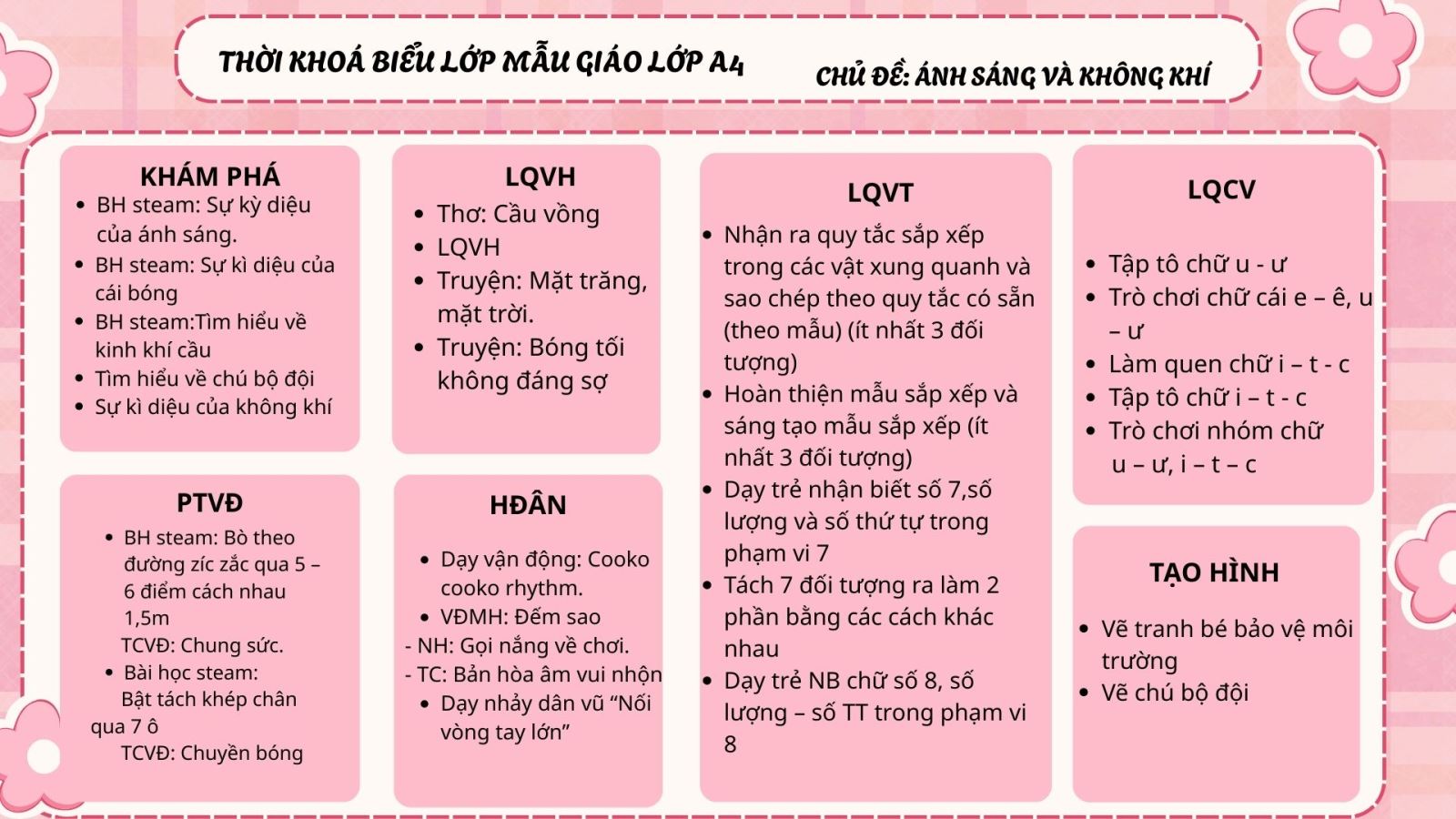 Thời khóa biểu lớp MGL A4 : Chủ đề Ánh sáng và không khí