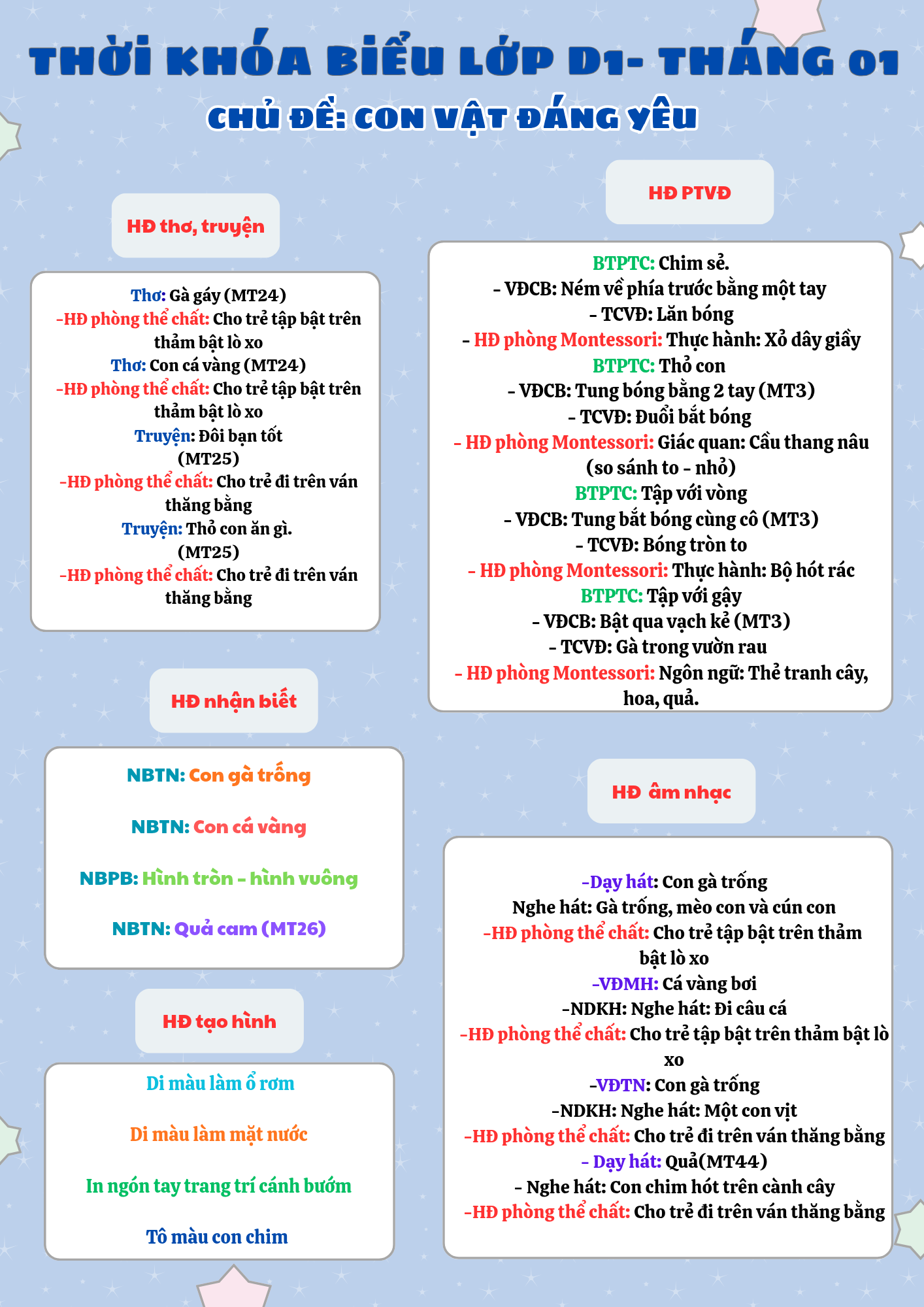 THỜI KHÓA BIỂU LỚP NHÀ TRẺ D1 - CHỦ ĐỀ : NHỮNG CON VẬT ĐÁNG YÊU
