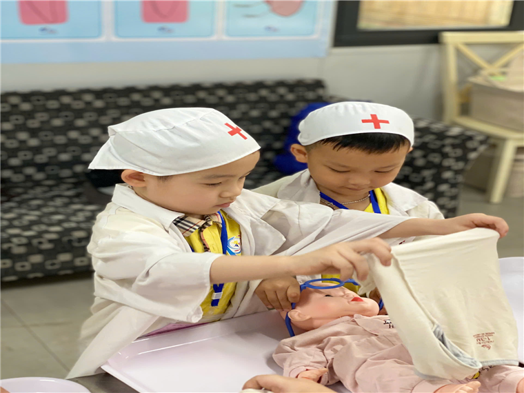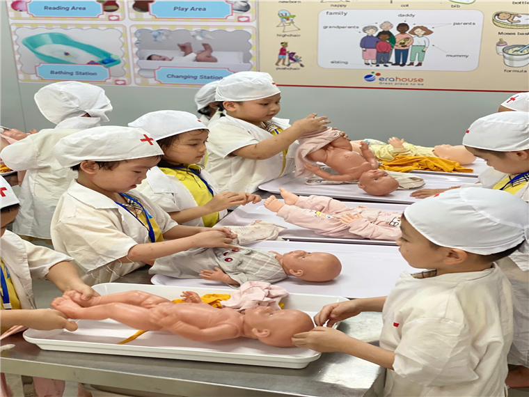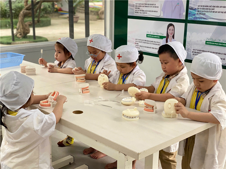 Con được chơi trượt cỏ nữa chứ, ai cũng thi nhau trượt vài lần mà chẳng thấy chán. Tập làm bác sĩ, những chú lính cứu hỏa, nặn gốm..