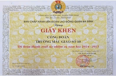 Trường Mẫu giáo Số 10 không chỉ là điểm sáng trong chất lượng giáo dục mầm non mà còn là đơn vị hoạt động tích cực trong công tác công đoàn. Trong năm học 2024-2025, Công đoàn nhà trường đã có những đóng góp tích cực, được ghi nhận với Giấy khen "Hoàn thành xuất sắc nhiệm vụ năm học 2024-2025". Thành tích này không chỉ phản ánh sự tận tâm của tập thể cán bộ, giáo viên, mà còn là minh chứng cho những hoạt động thiết thực mà Công đoàn nhà trường đã triển khai nhằm chăm lo đời sống đoàn viên, tạo động lực phấn đấu và góp phần nâng cao chất lượng giáo dục mầm non.