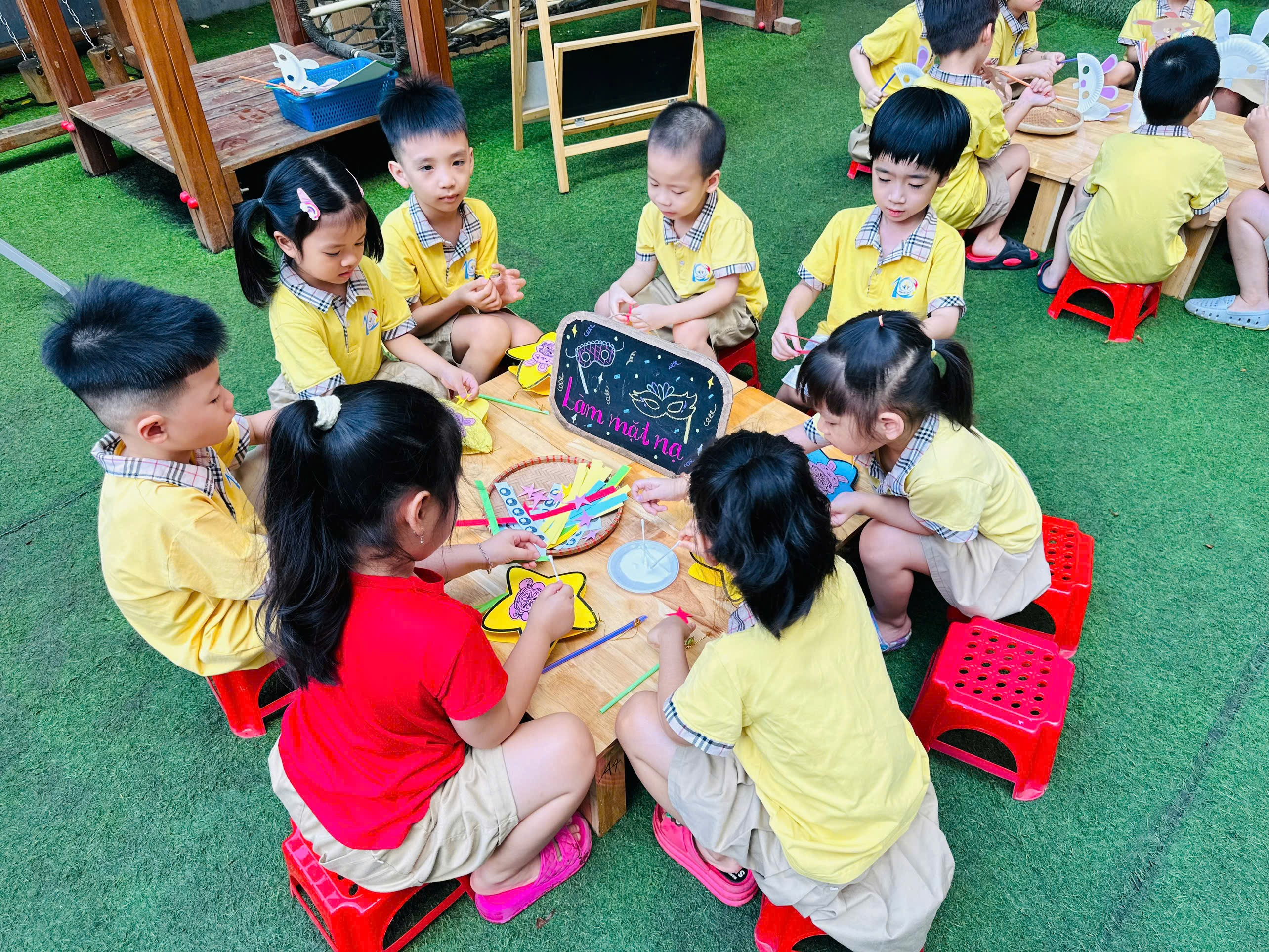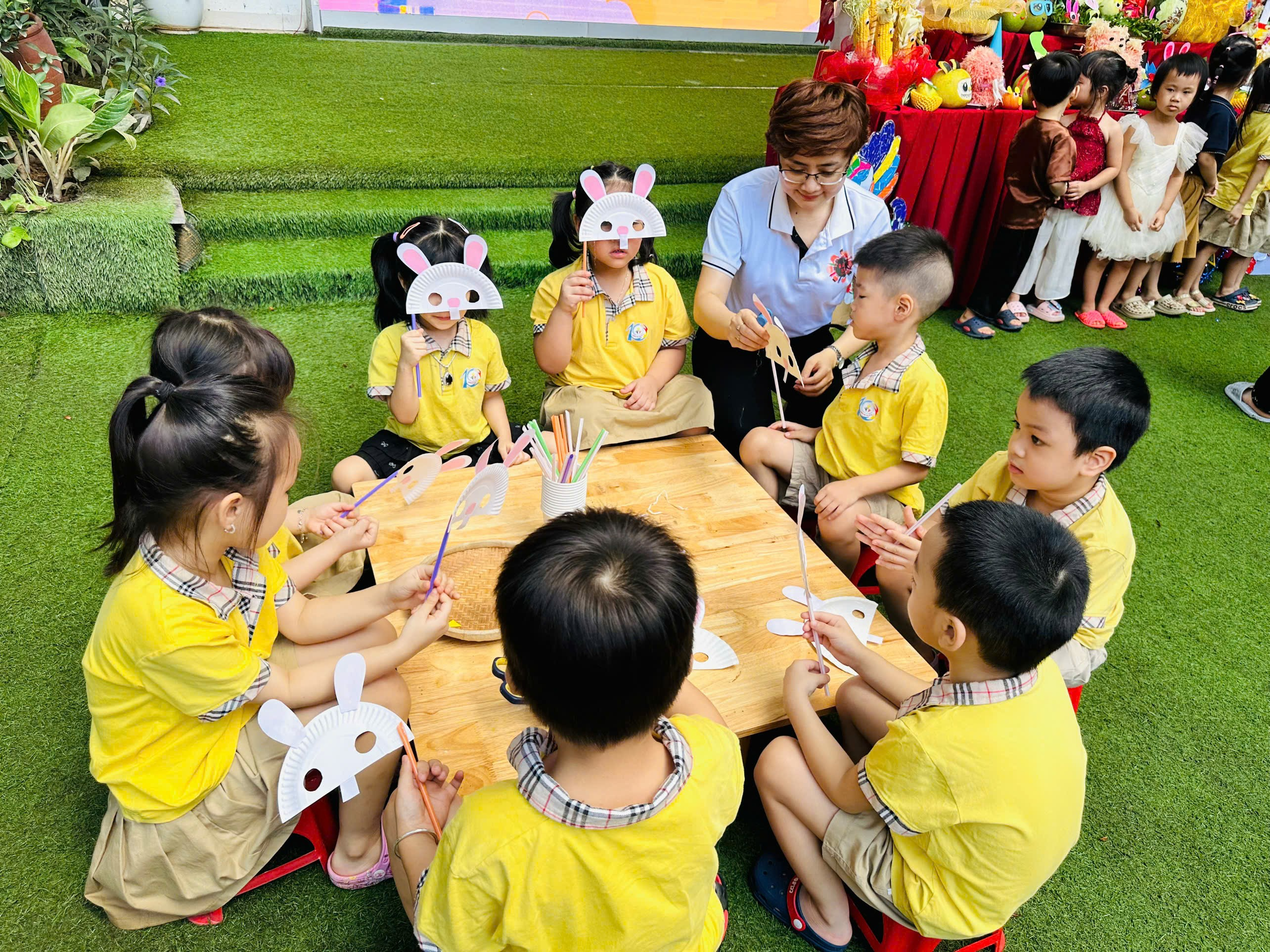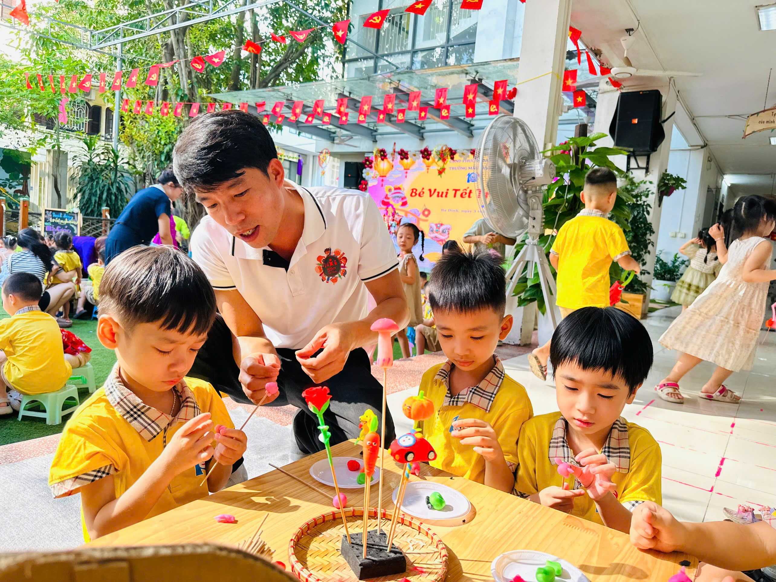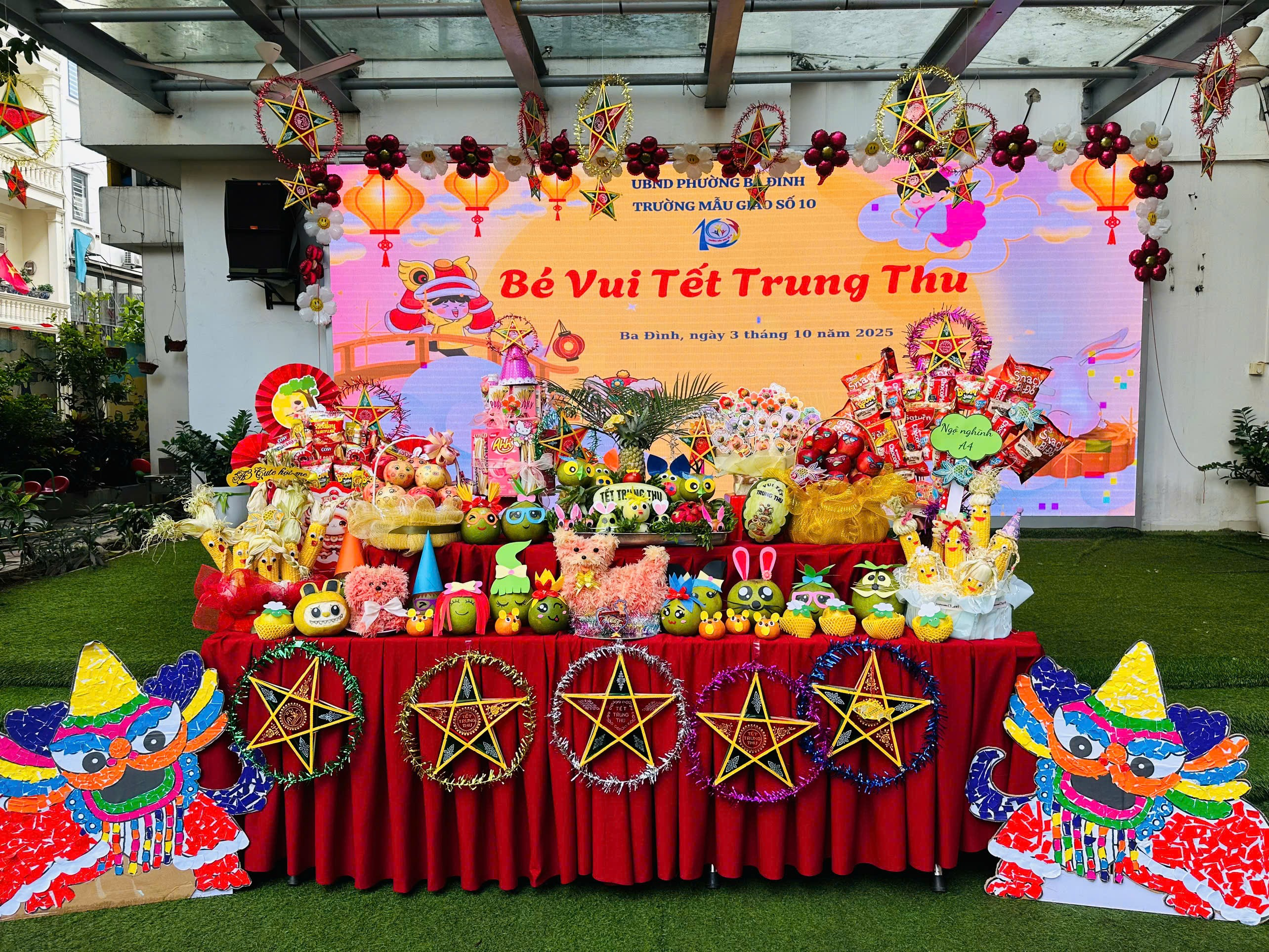 Buổi sáng: Sân trường rực rỡ sắc màu khi các bé cùng nhau bày mâm cỗ Trung thu với đầy ắp hoa quả, bánh kẹo. Không chỉ vậy, các con còn hào hứng tham gia nhiều hoạt động trải nghiệm thú vị: tự tay làm mặt nạ ngộ nghĩnh, sáng tạo đèn lồng lung linh, nặn tò he đầy màu sắc. Những đôi bàn tay nhỏ bé, khéo léo đã mang đến những sản phẩm đáng yêu và đầy tự hào.