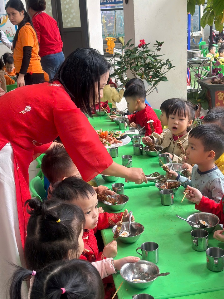 Chuẩn bị cho bữa tiệc của các con các bác, các cô đã lên thực đơn lựa chọn các món ăn hợp với sở thích của các bé và chế biến những món ăn ngon, mầu sắc hấp dẫn, đảm bảo vệ sinh an toàn thực phẩm và phù hợp với khẩu vị của trẻ. Các món ăn không chỉ đảm bảo ngon miệng mà còn phải được trang trí đẹp mắt để thêm phần hấp dẫn với trẻ. Các con đã vô cùng thích thú khi tham gia bữa tiệc vừa được thưởng thức các món ăn ngon và giao lưu với các bạn trong khối.