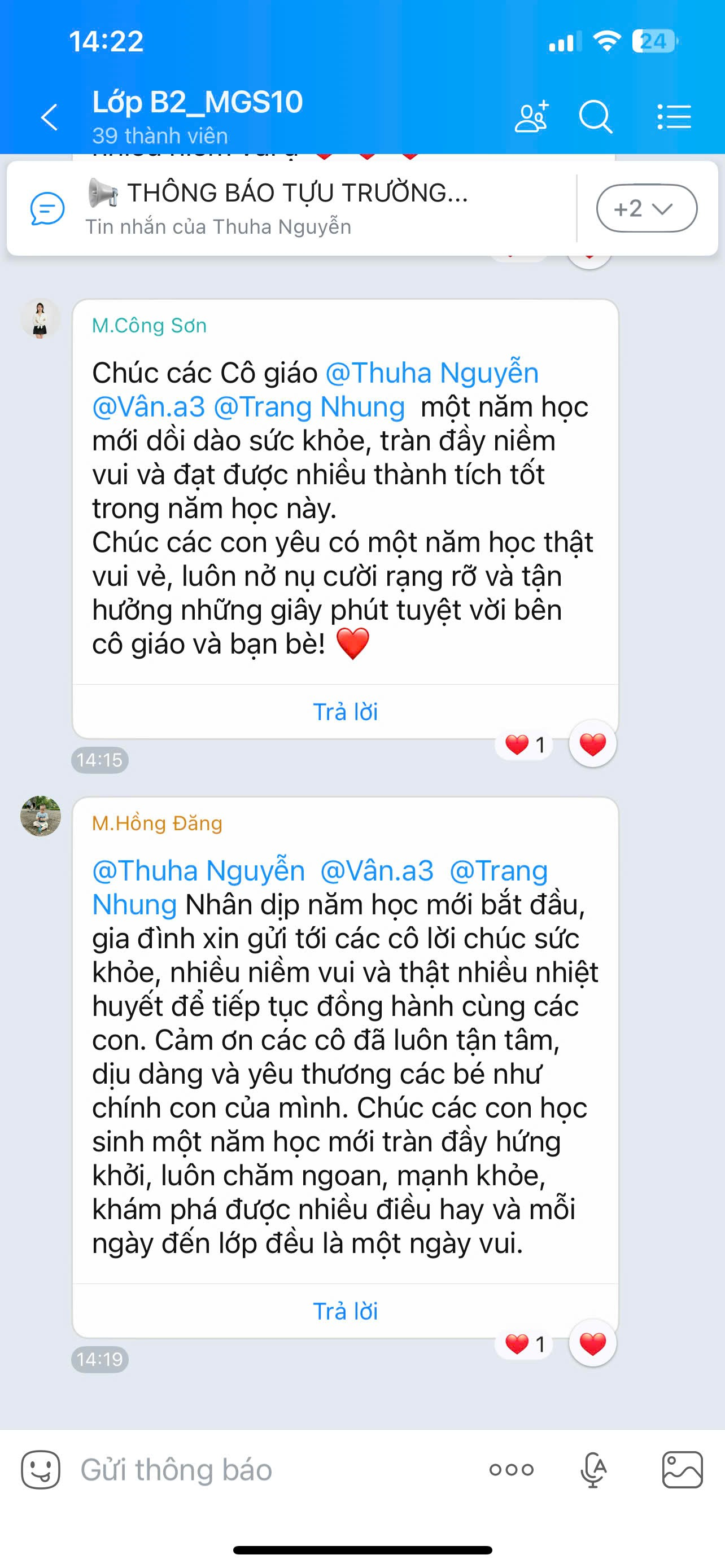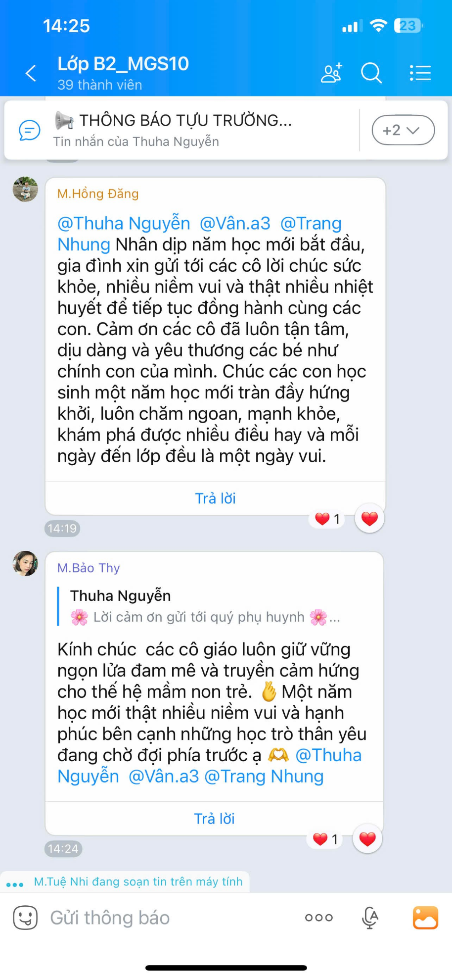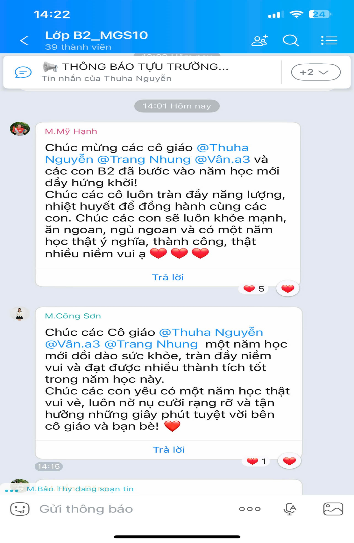 Tập thể cô và trò lớp MGNB2 xin chân thành cảm ơn sự quan tâm, yêu thương của quý phụ huynh đã gửi tới các cô nhân ngày khai giảng. Tình cảm ấy là nguồn động viên lớn lao để cô trò thêm gắn kết, cùng nhau khởi đầu một năm học mới thật nhiều niềm vui, yêu thương và thành công.