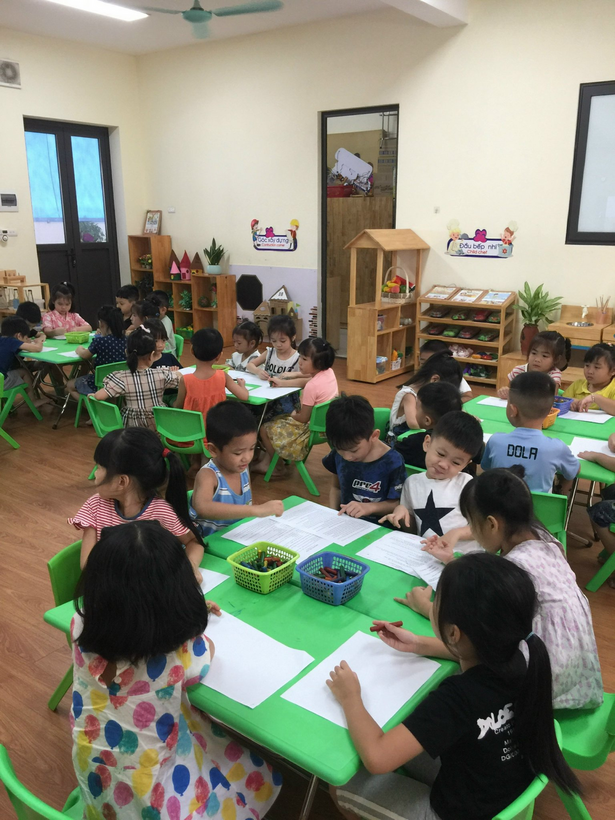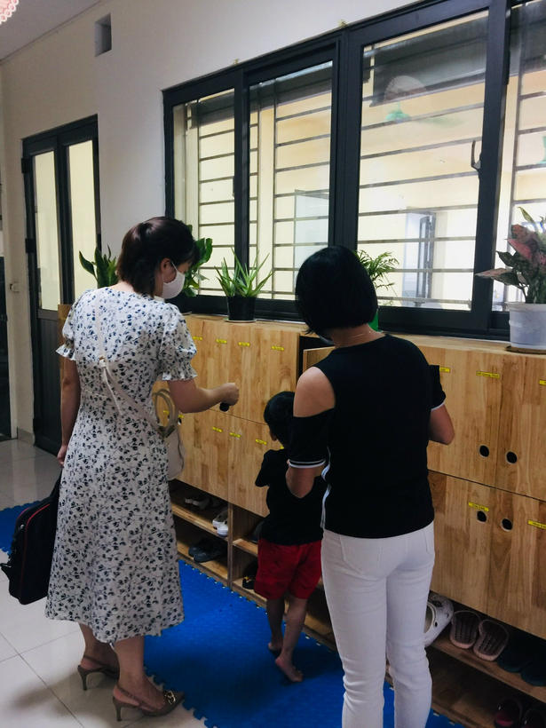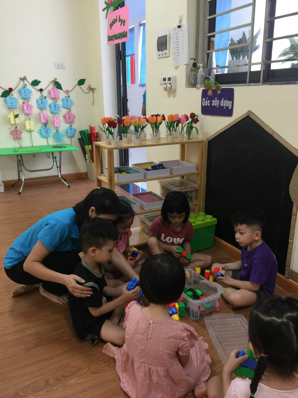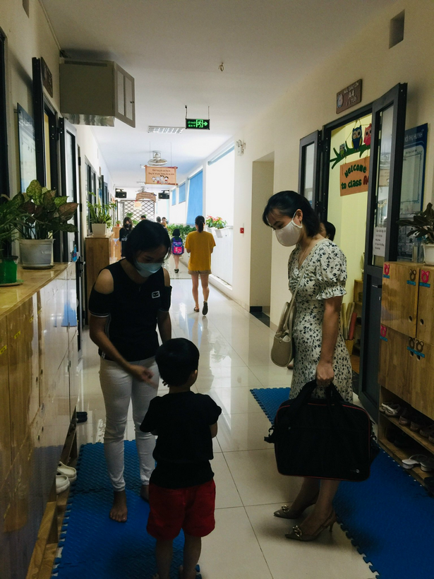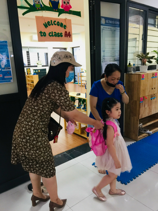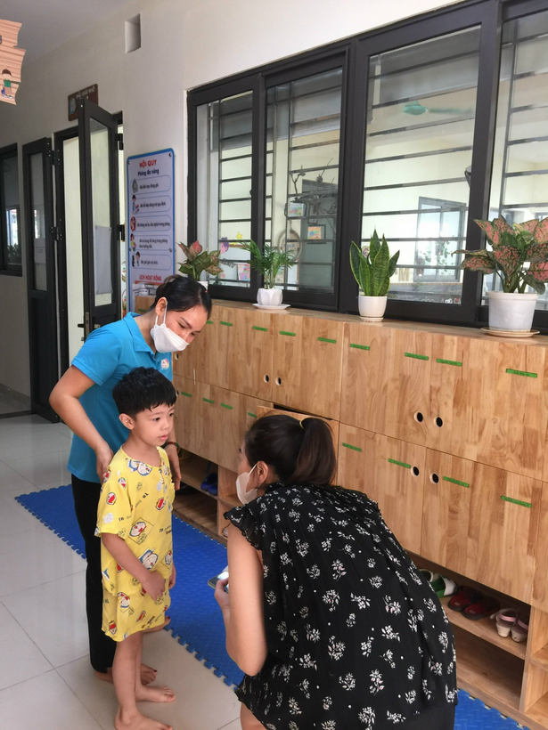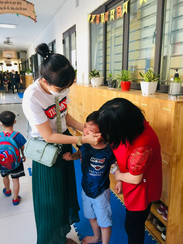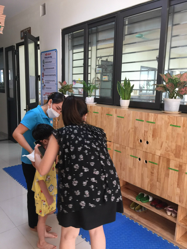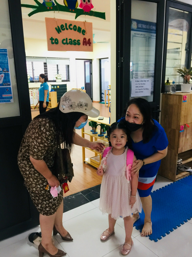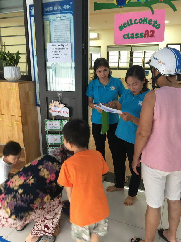 - Hoạt động đón trẻ: Giáo viên trò chuyện cùng phụ huynh, làm quen với trẻ và môi trường lớp mới, cô mới. Qua đó tăng cường sự giao lưu hiểu biết giữa phụ huynh với nhà trường và cô với trẻ. Cô dỗ dành những trẻ còn khóc, tạo sự yên tâm cho trẻ trong những ngày đầu còn lạ lẫm.