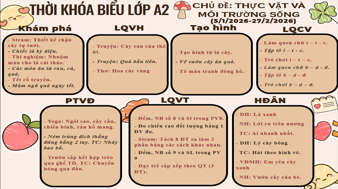 THỜI KHÓA BIỂU LỚP MGL A2 : CHỦ ĐỀ " THỰC VẬT VÀ MÔI TRƯỜNG SỐNG "
