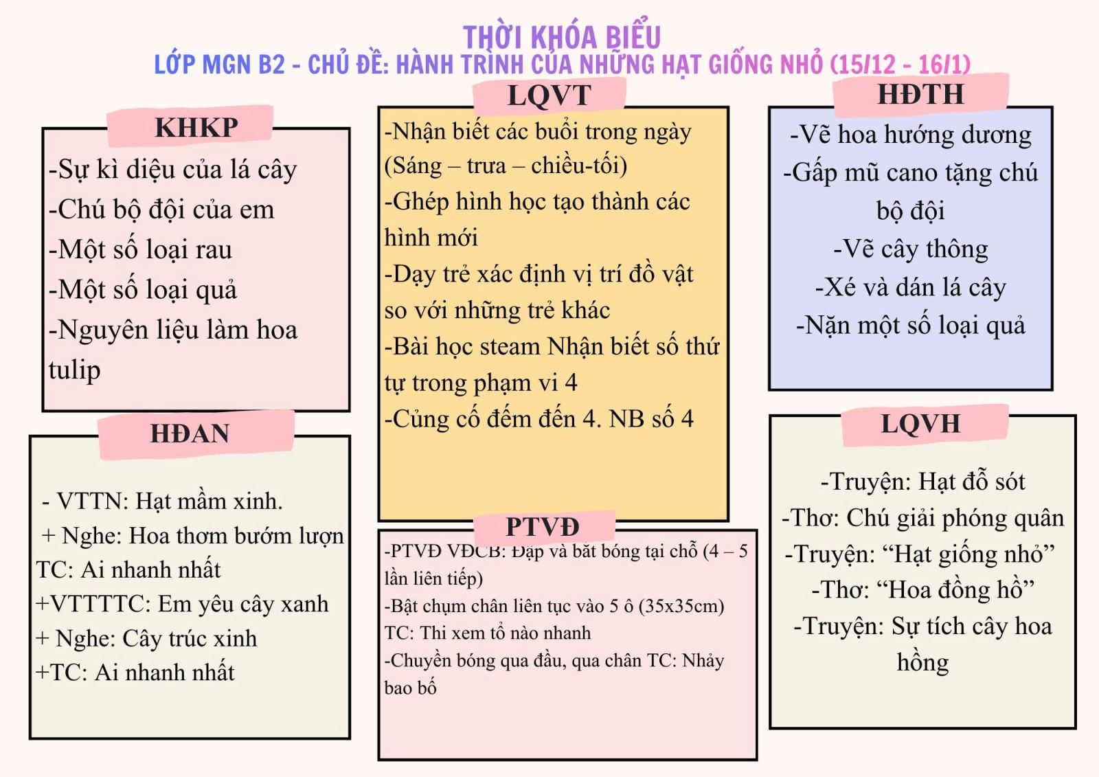 Thời khóa biểu lớp MGN B2 : Chủ đề " Hành trình những hạt giống nhỏ "