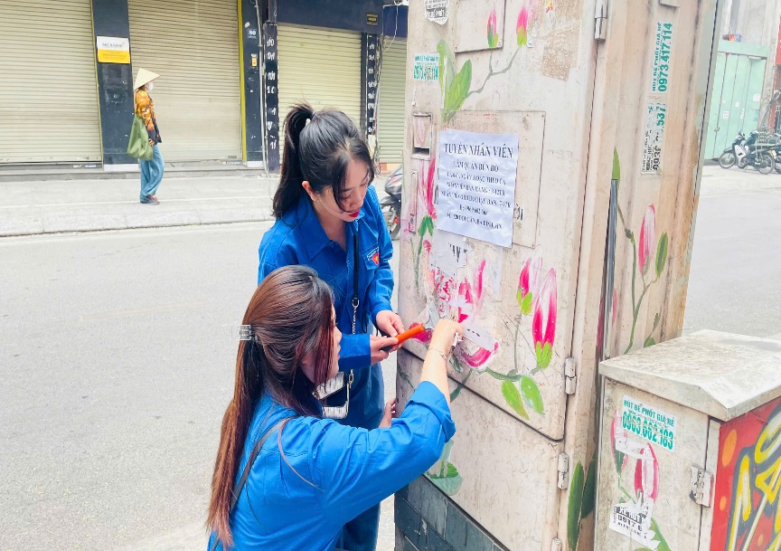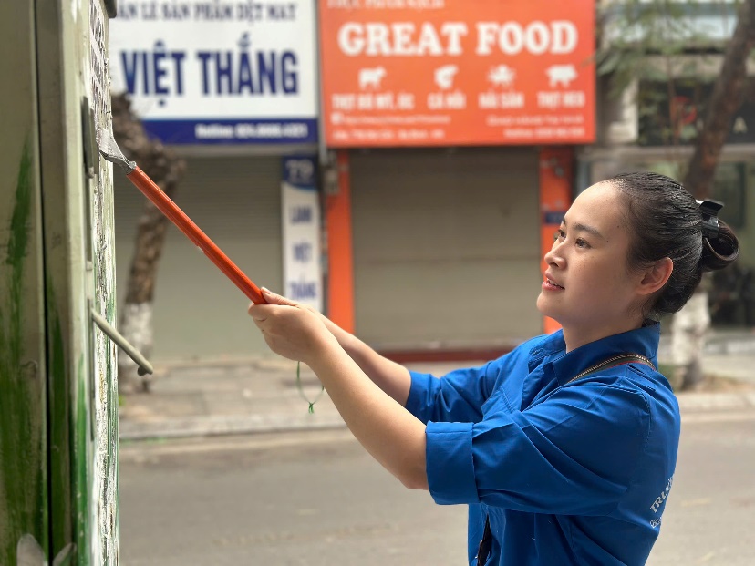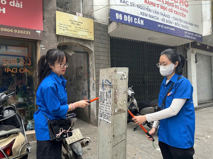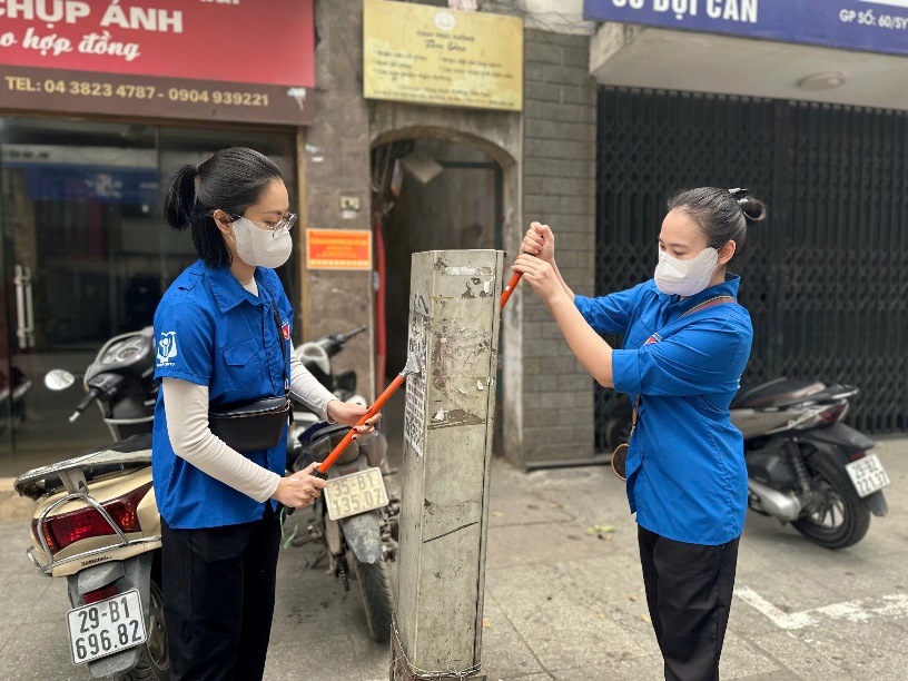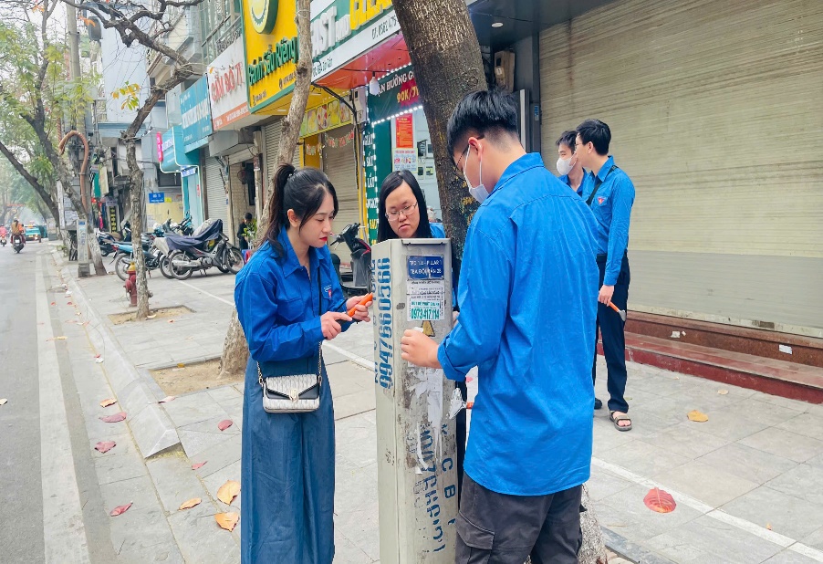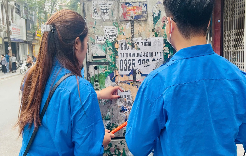 ĐTN trường MG số 10 tích cực cạy các tờ quảng cáo được dán ở booth điện xung quanh dọc đường Đội Cấn
