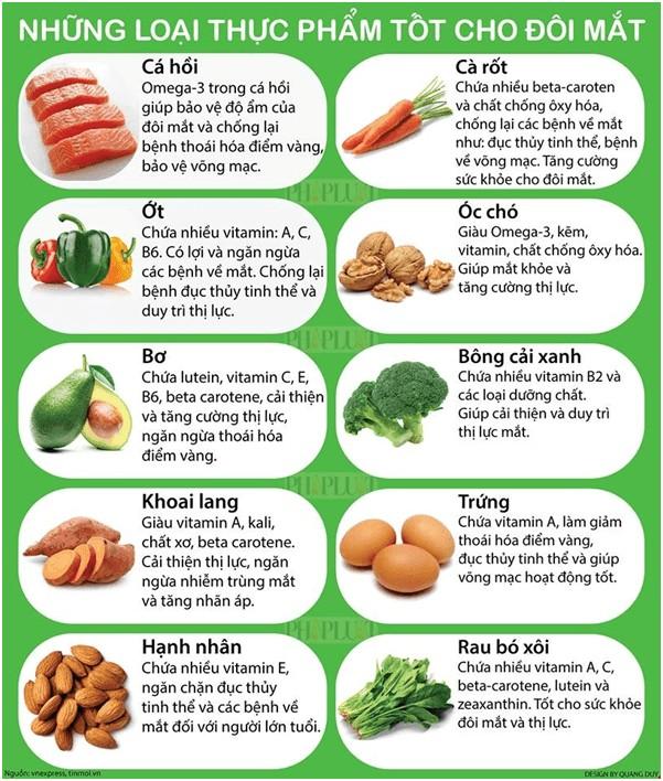 Bổ sung các thực phẩm tốt cho mắt: Các vitamin có vai trò quan trọng giúp cho mắt sáng, tuy nhiên cơ thể không tự tổng hợp được mà cần bổ sung từ nguồn thực phẩm có trong thức ăn hàng ngày. Cần lưu ý bổ sung các thực phẩm có chứa nhiều vitamin A, B, C, D, E và các yếu tố vi lượng như kẽm sẽ giúp cho mắt thêm sáng.