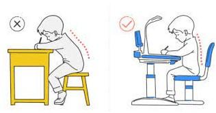 Ngồi đúng tư thế: Nên chọn ghế ngồi và bàn học có thể điều chỉnh được độ cao, ghế có tựa lưng và có thể điều chỉnh được. Ngồi học trong tư thế đầu và lưng thẳng (không nghiêng hay cúi đầu), vai xuôi, chân hơi duỗi tạo góc giữa cẳng chân và đùi. Khi ngồi trước máy tính, trẻ nên ngồi thẳng lưng, vai hóp lại và mông chạm vào cuối ghế. Không ngồi khoanh chân vì điều này sẽ làm hạn chế lưu lượng máu. Bên cạnh đó, cự ly sử dụng màn hình nên cách xa khoảng 50-80cm so với mắt. Ngoài ra, bố mẹ cần chú ý bàn ghế ngồi học của con. Ngồi quá thấp so với bàn học và máy tính sẽ khiến trẻ nhanh bị mỏi mắt.