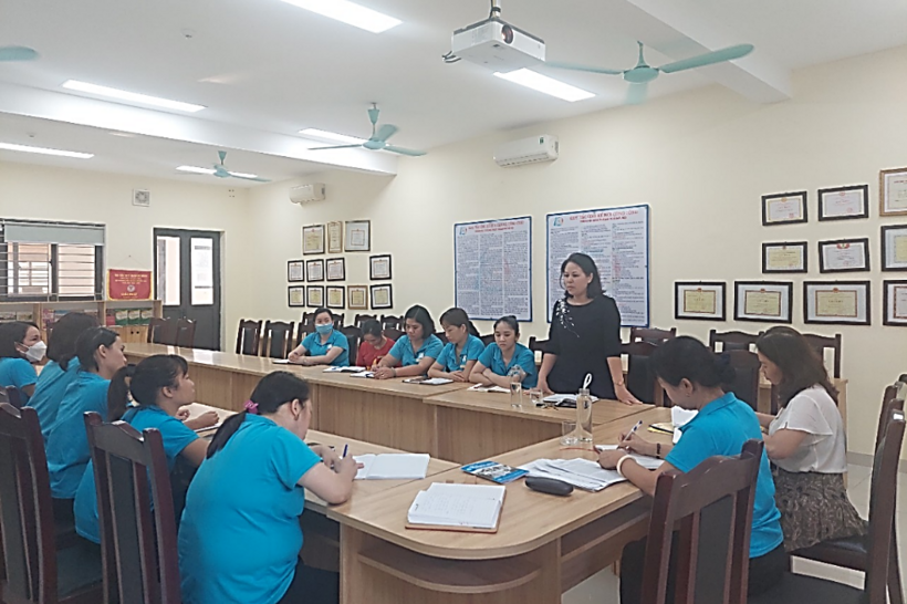 Đồng chí Phạm Hà Phương thay mặt chi ủy chi bộ Mẫu giáo Số 10 phổ biến nội dung về 2 chuyên đề tới các đảng viên trong chi bộ