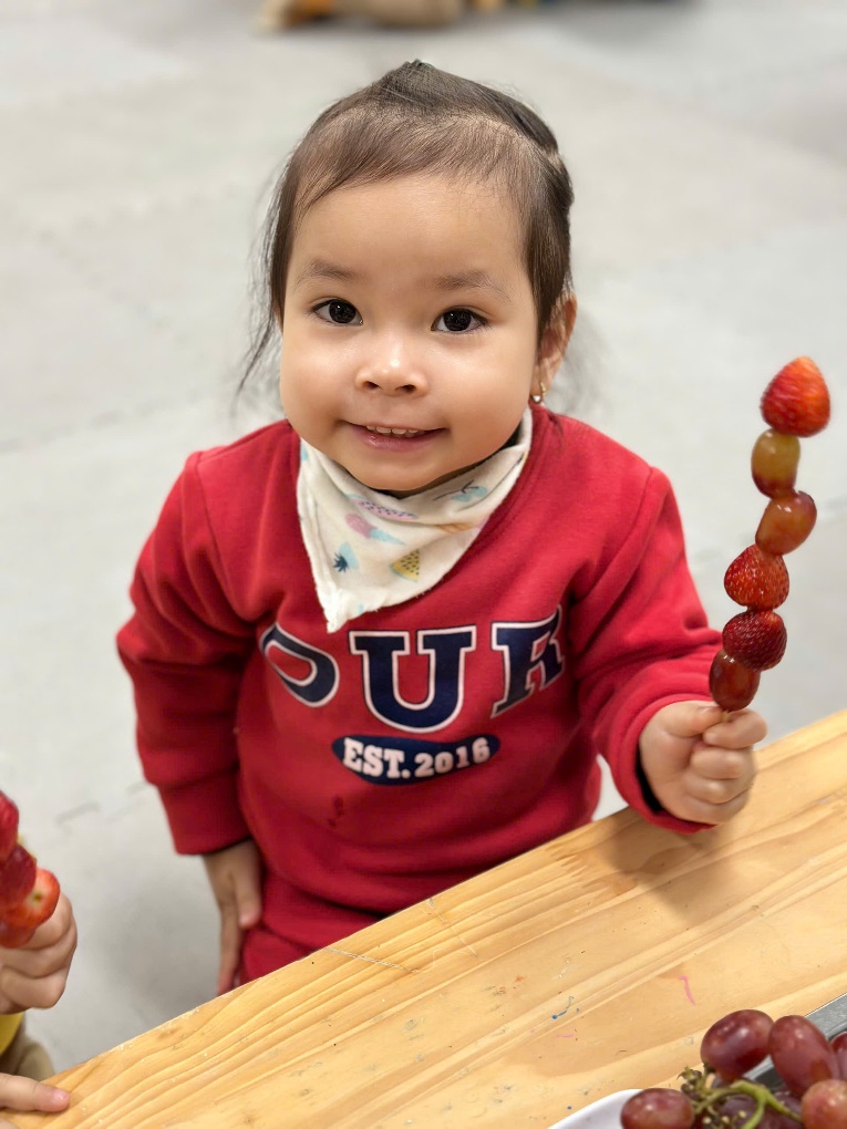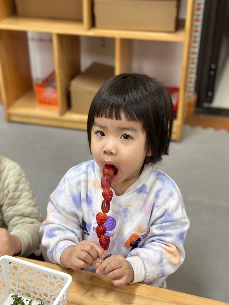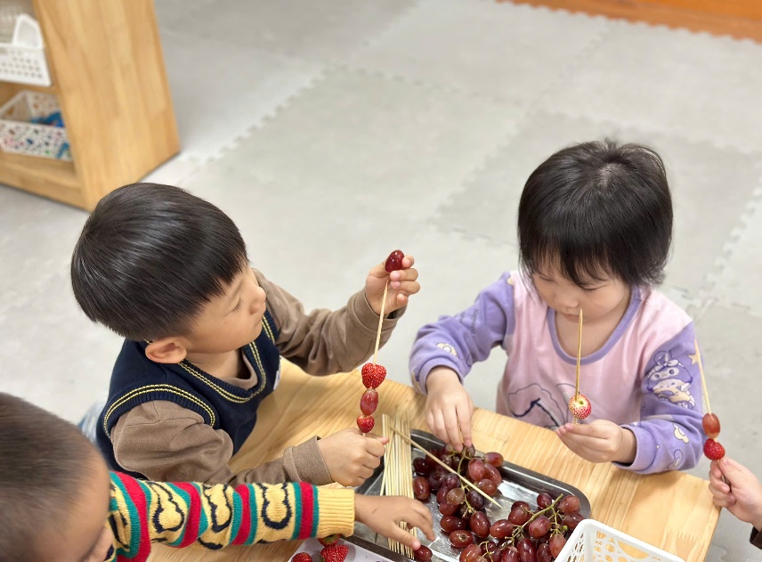 Các bé thích thú với xiên hoa quả tự tay mình tay làm