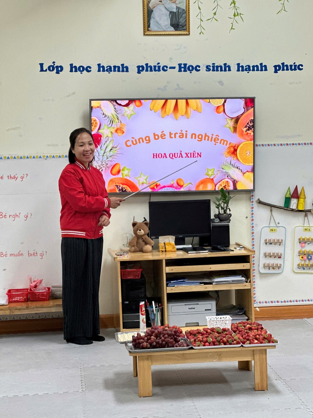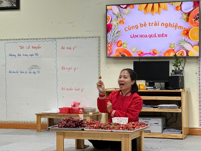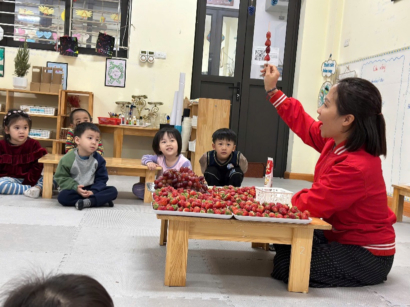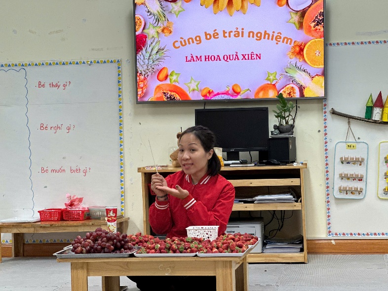 Cô Đặng Hà hướng dẫn các bạn nhỏ xiên hoa quả sắp xếp theo quy tắc: 1 quả dâu-1 quả nho.