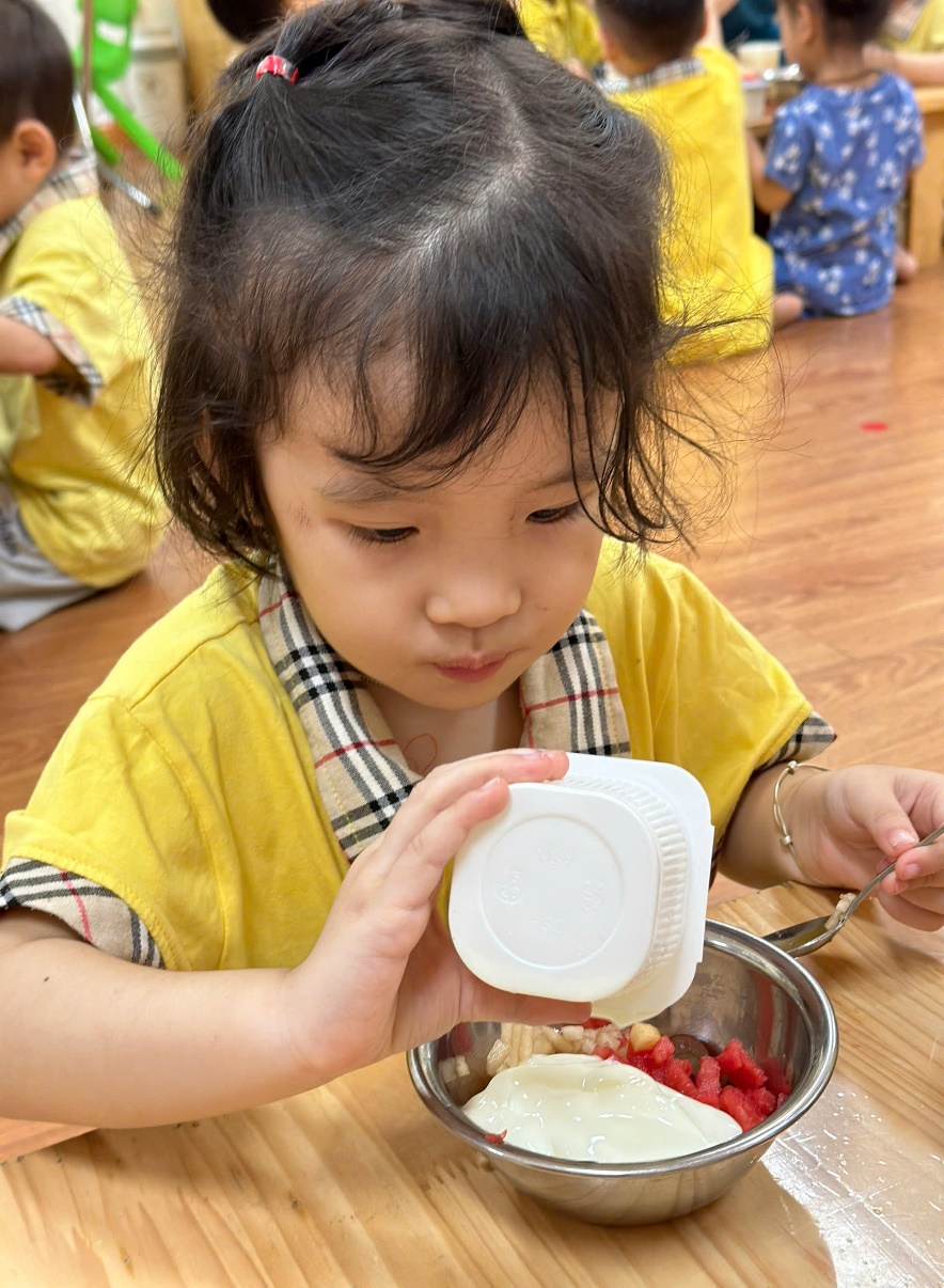 * Sau đây là một số hình ảnh của buổi Hoạt động trải nghiệm "Hoa quả dầm trộn sữa chua" của các bạn lớp 3-4 tuổi C3: