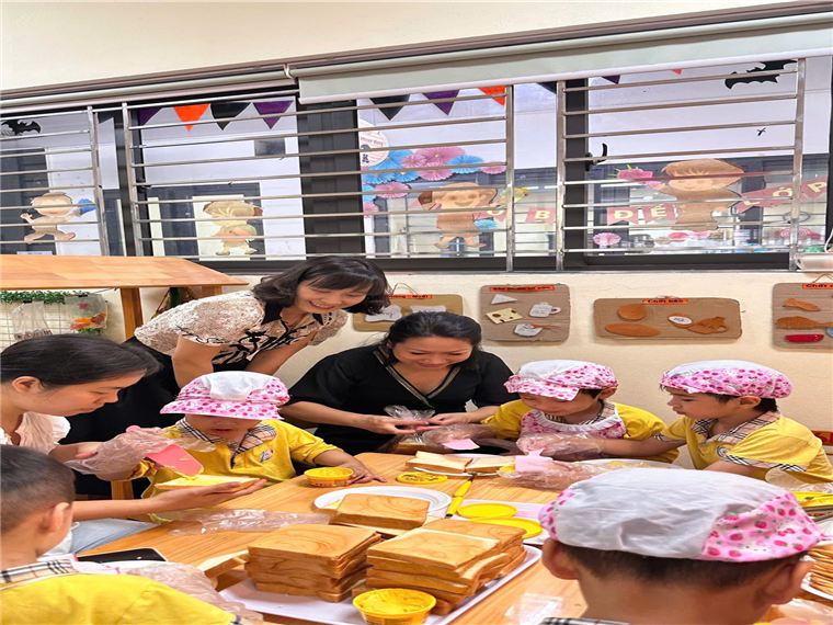 Các con cùng bố mẹ trải nghiệm làm bánh mì phết bơ.