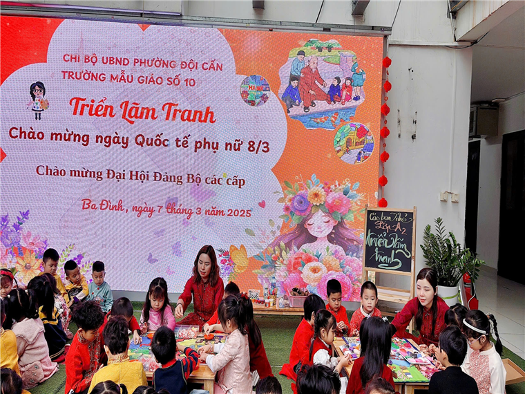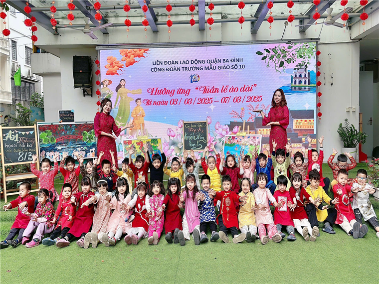 Trường MG Số 10 đã hưởng ứng tuần lễ áo dài từ ngày 03/03 đến ngày 07/03/ 2025 và tổ chức Triển lãm tranh để chào mừng ngày Quốc tế phụ nữ 08/03 và Đại hội Đảng bộ các cấp. Giáo viên và học sinh Lớp MGL A2 đã cùng nhau chuẩn bị nguyên vật liệu, ý tưởng để thiết kế tranh. Các bé rất hào hứng cùng tham gia để hoàn thành 2 tác phẩm: Hình bóng quê nhà và Việt Nam _ quê hương tôi xưa và nay. Các bạn nhỏ cũng rất phấn khởi, hào hứng tham gia màn trình diễn thời trang "Áo dài" của cô và trò trường Mẫu giáo Số 10. Buổi triển lãm tranh chào mừng 115 năm Ngày Quốc tế phụ nữ 8.3 đã thành công tốt đẹp.