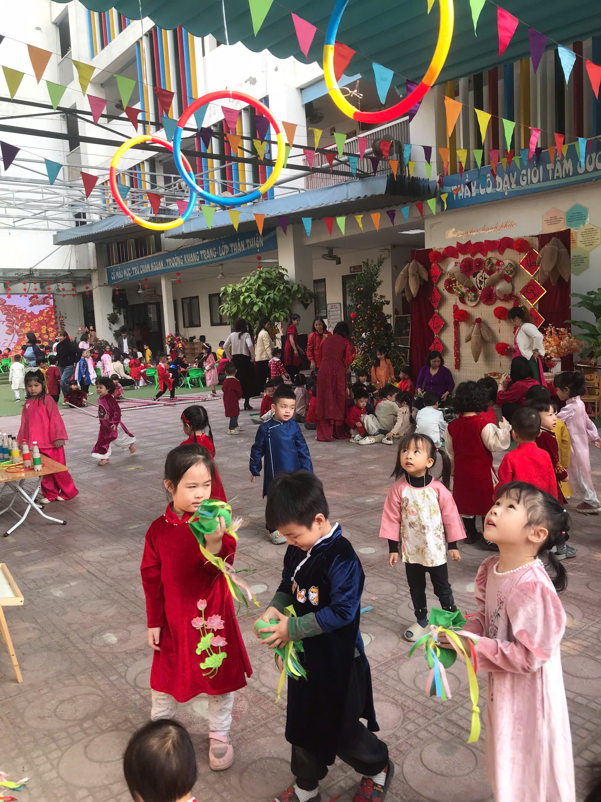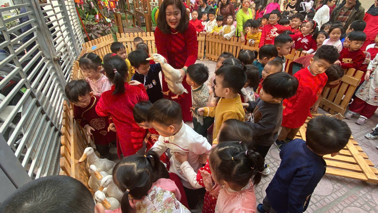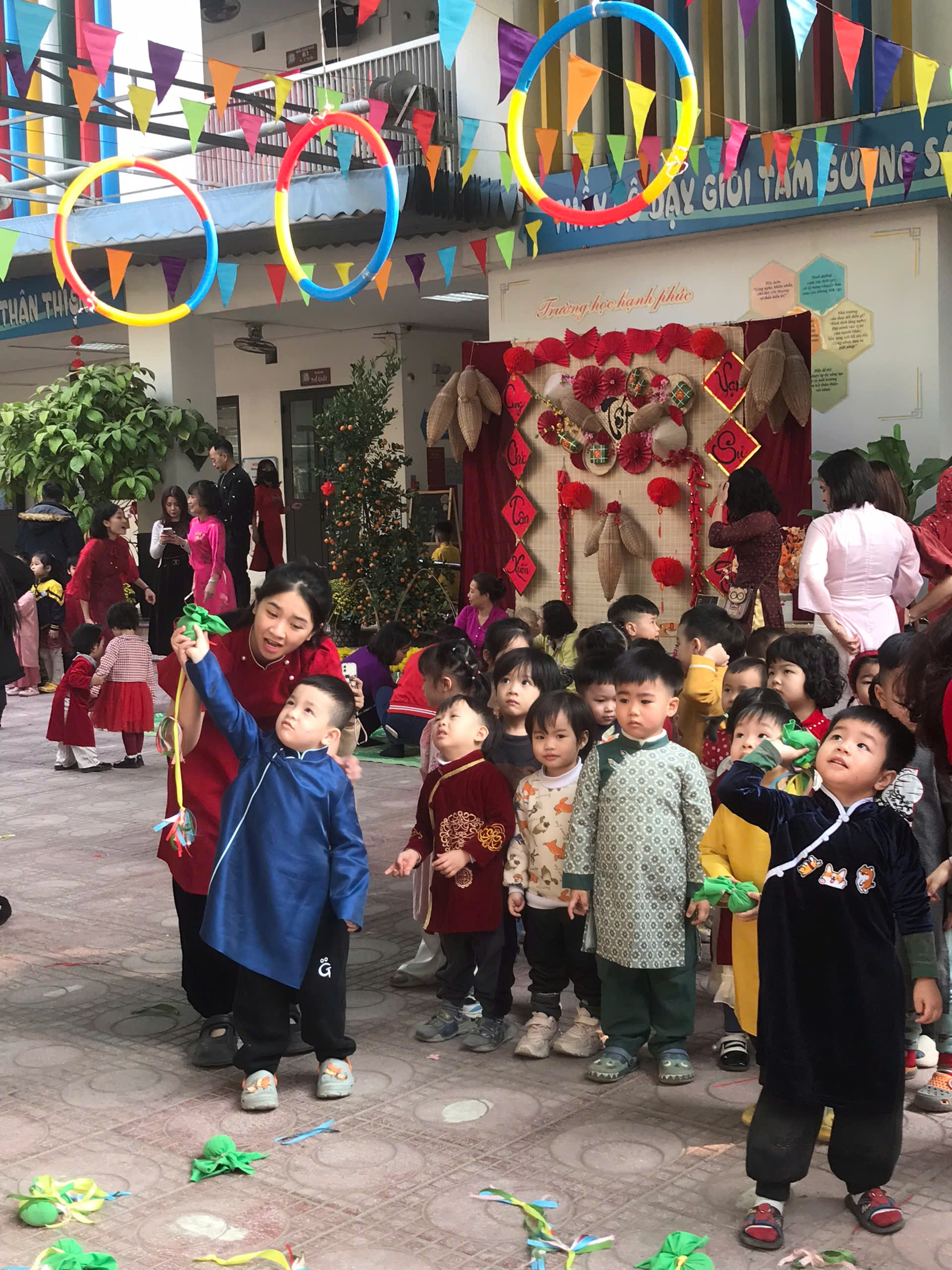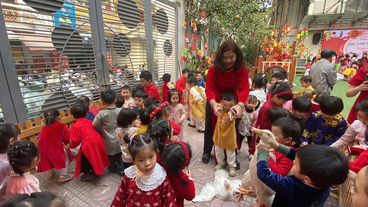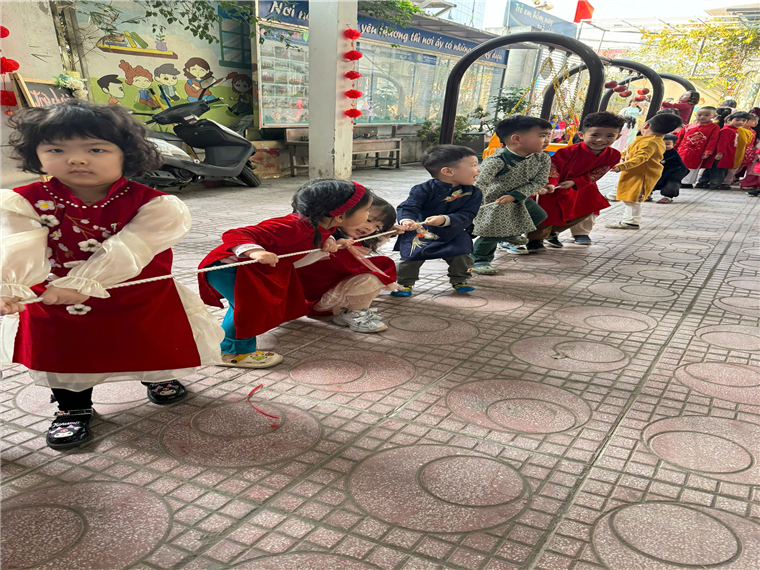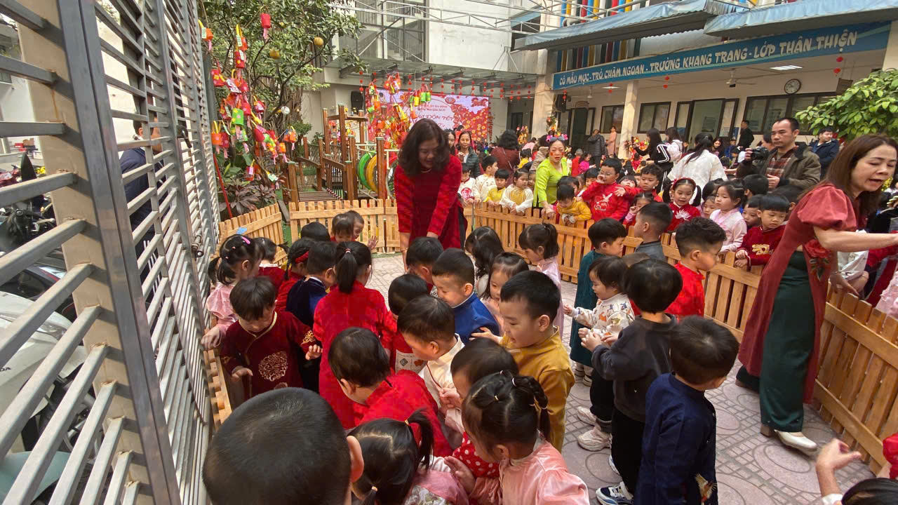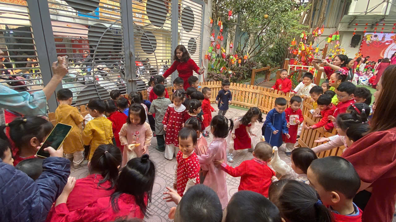 Sau lời khai mạc của cô Hiệu trưởng Lê Thi Trâm Anh, các con được tham gia rất nhiều các trò chơi dân gian như: Bắt vịt, ném còn, ném cổ chai, đi cà kheo, kéo co, múa sạp..... và 1 hoạt động hấp dẫn là : Gói bánh chưng.