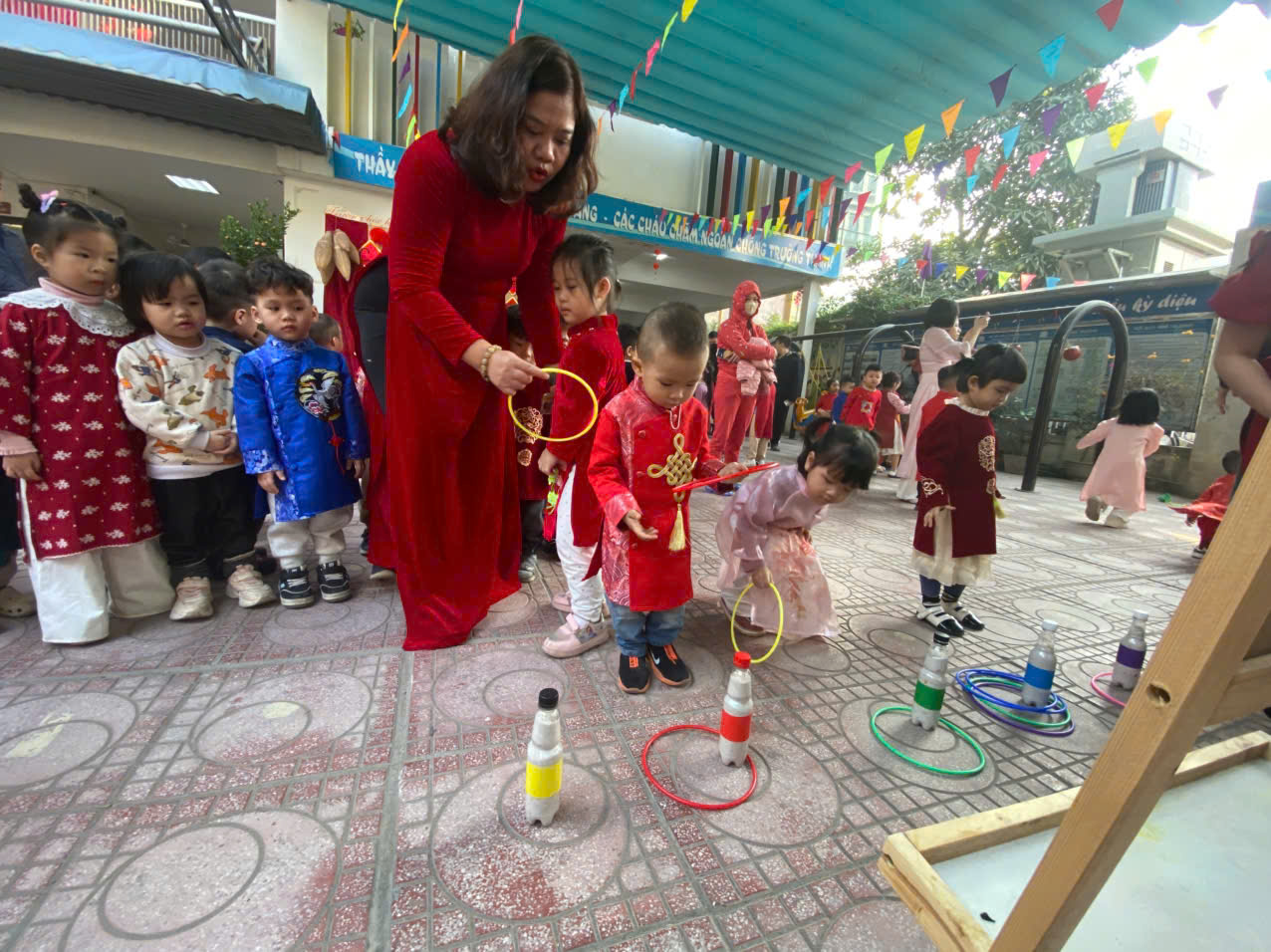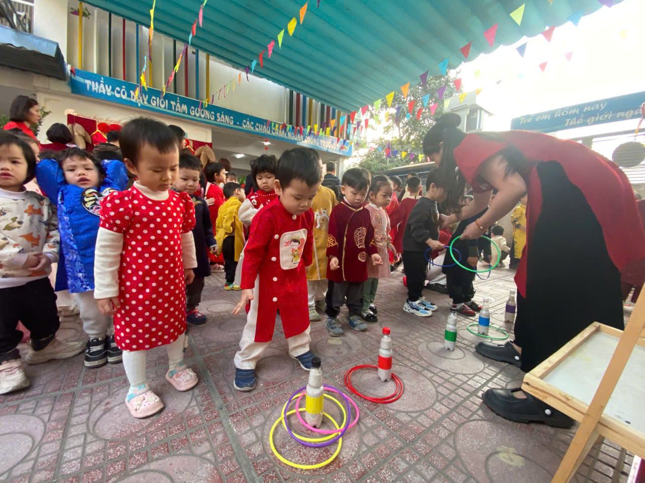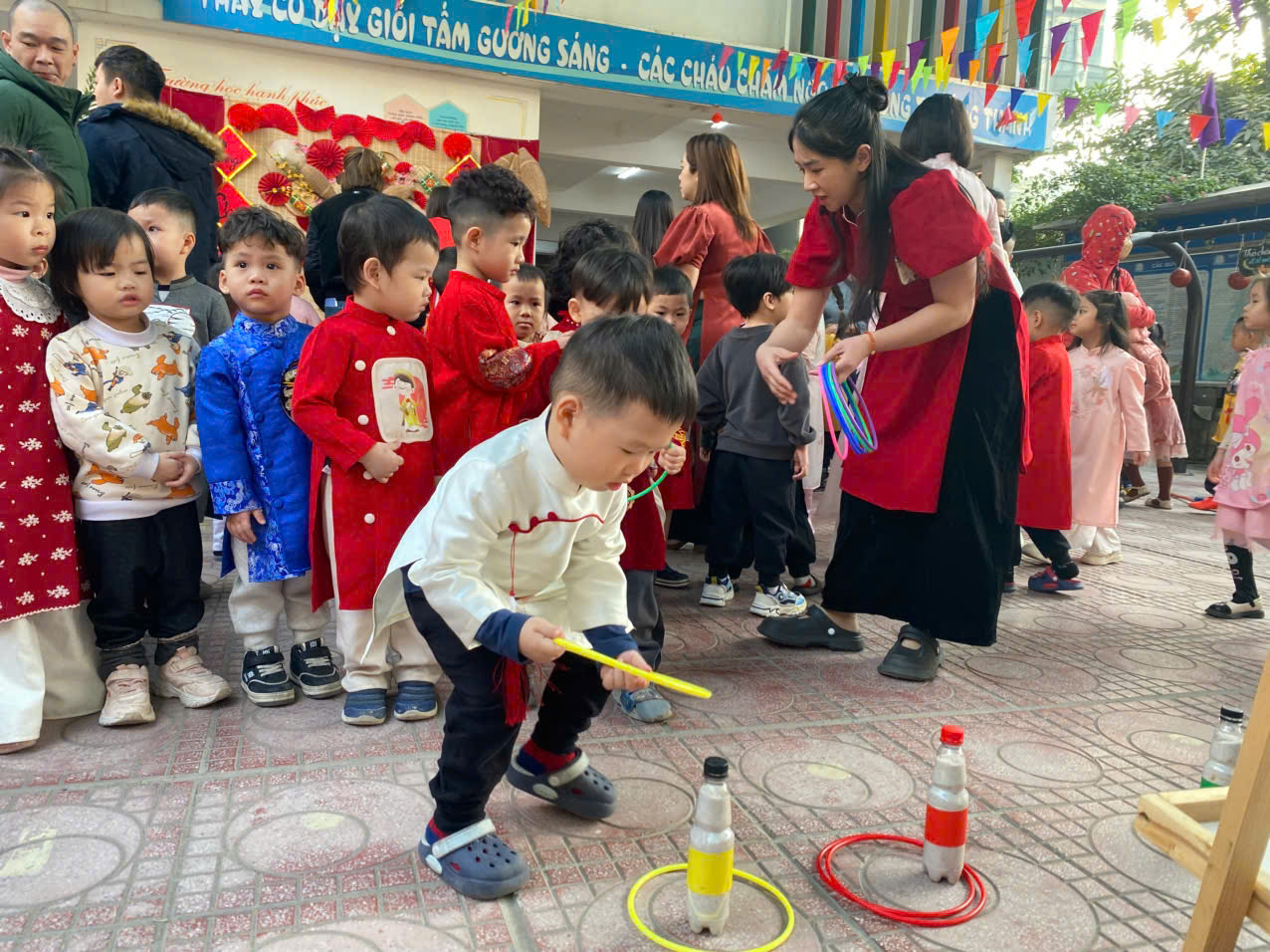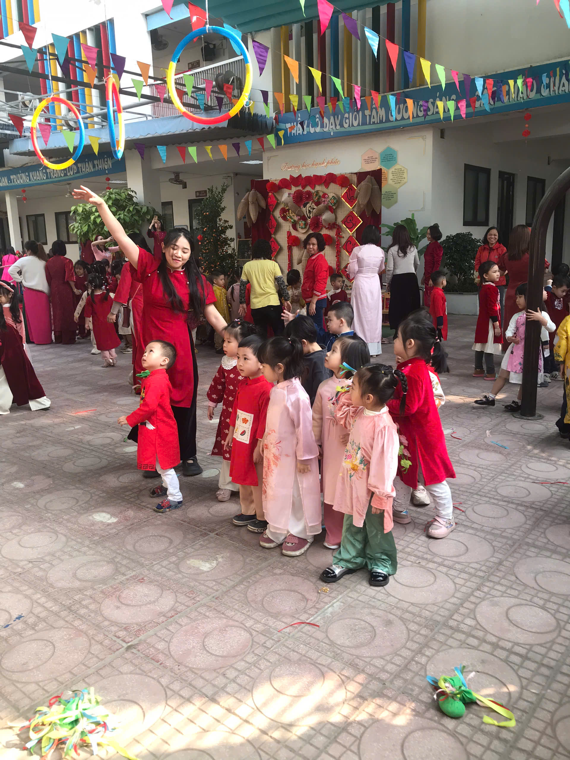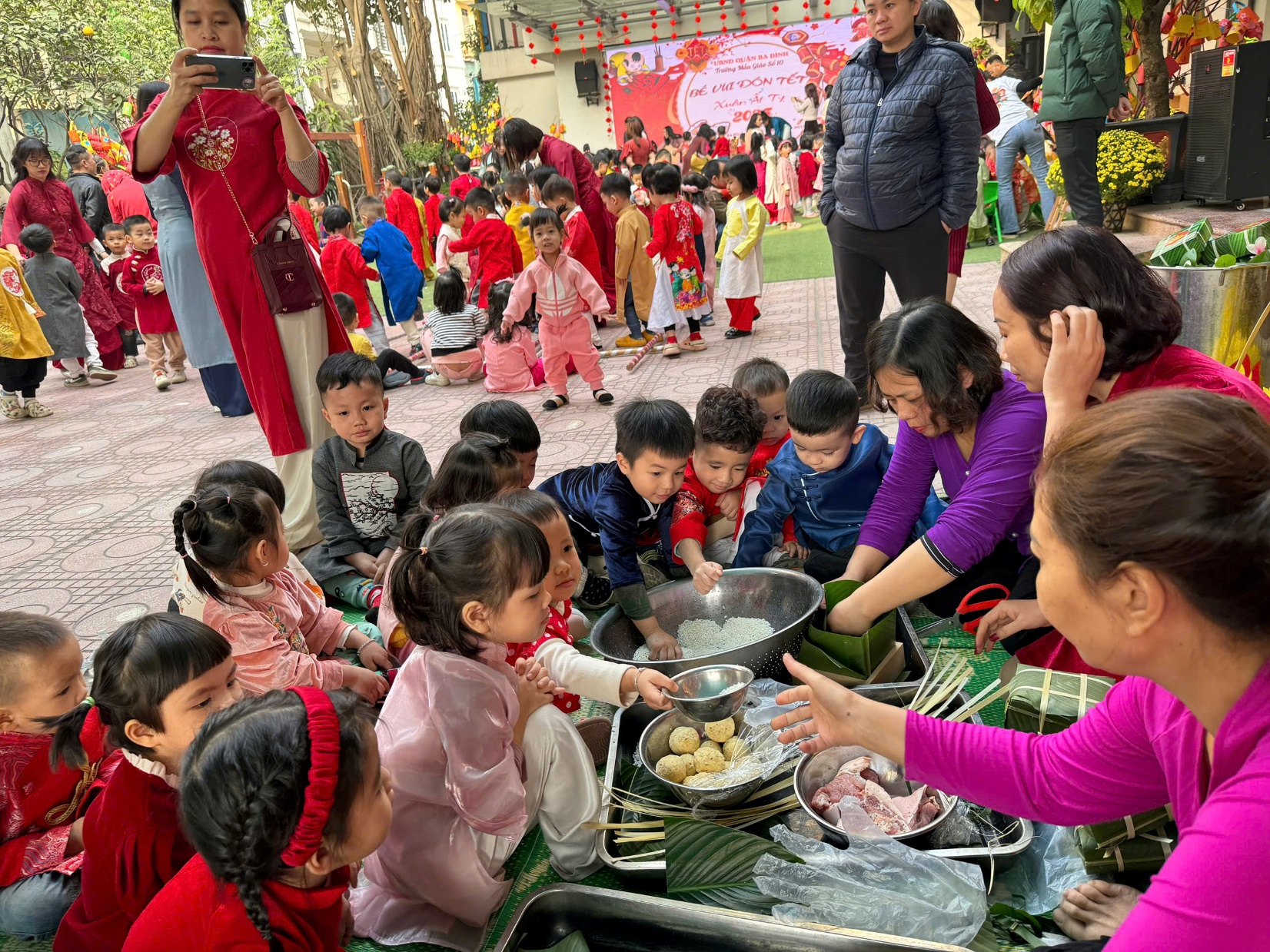 Sau lời khai mạc của cô Hiệu trưởng Lê Thi Trâm Anh, các con được tham gia rất nhiều các trò chơi dân gian như: Bắt vịt, ném còn, ném cổ chai, đi cà kheo, kéo co, múa sạp..... và 1 hoạt động hấp dẫn là : Gói bánh chưng.