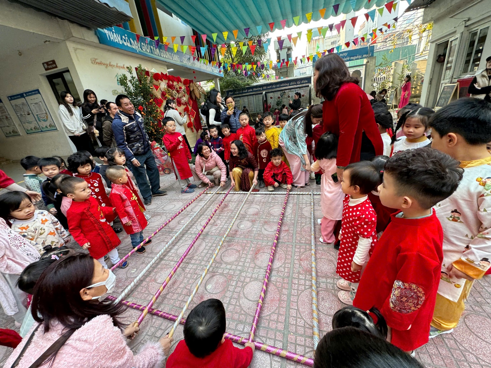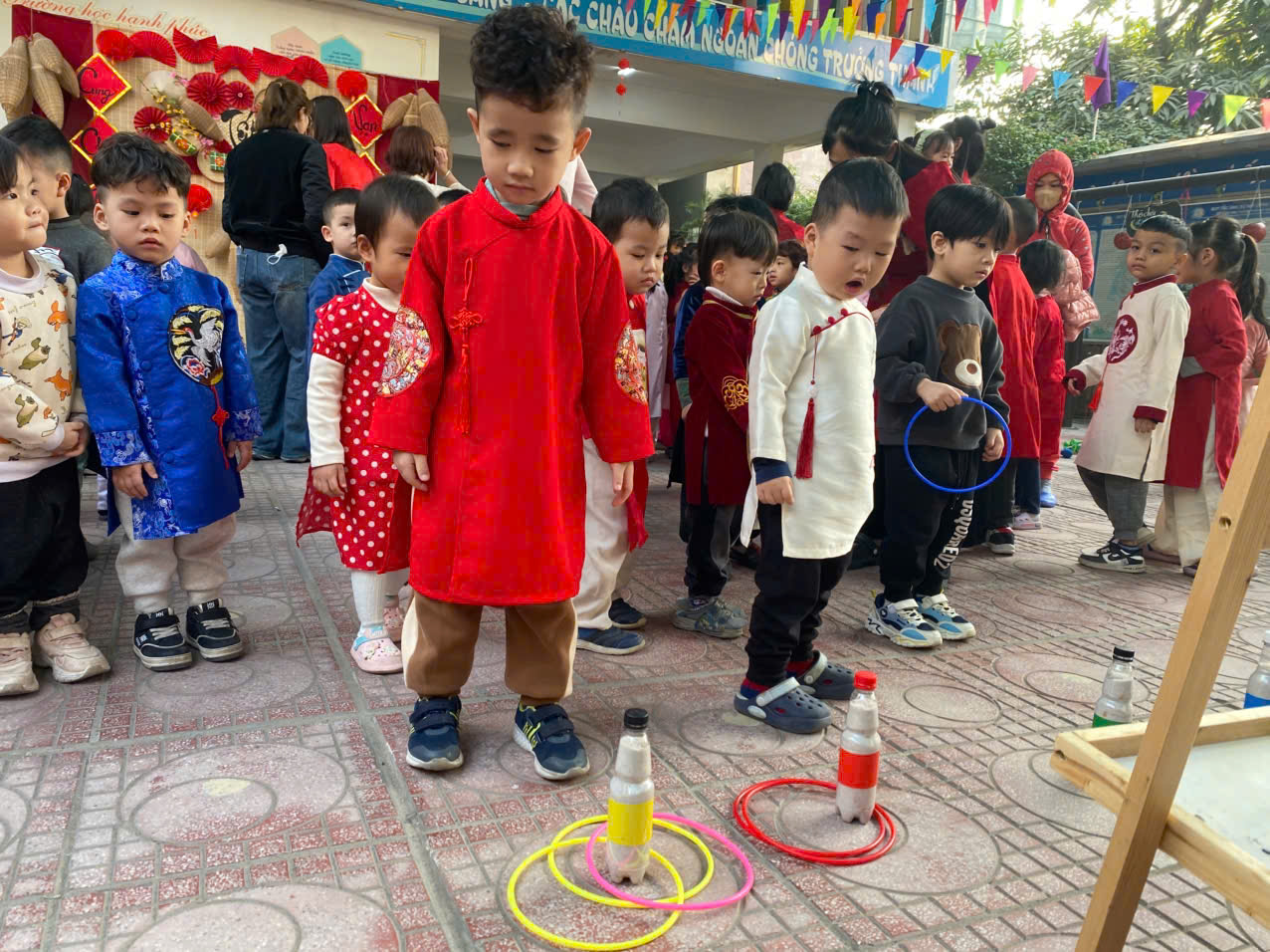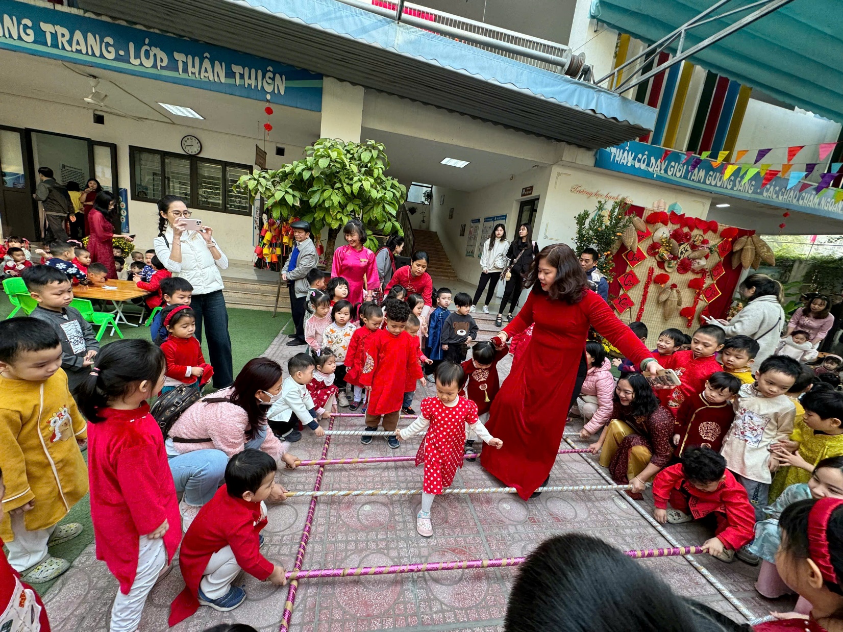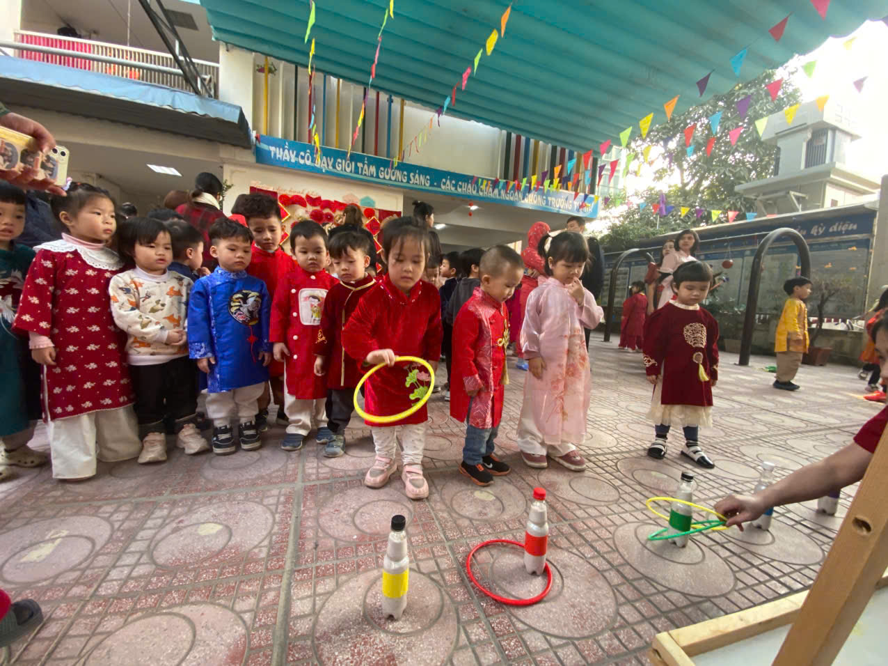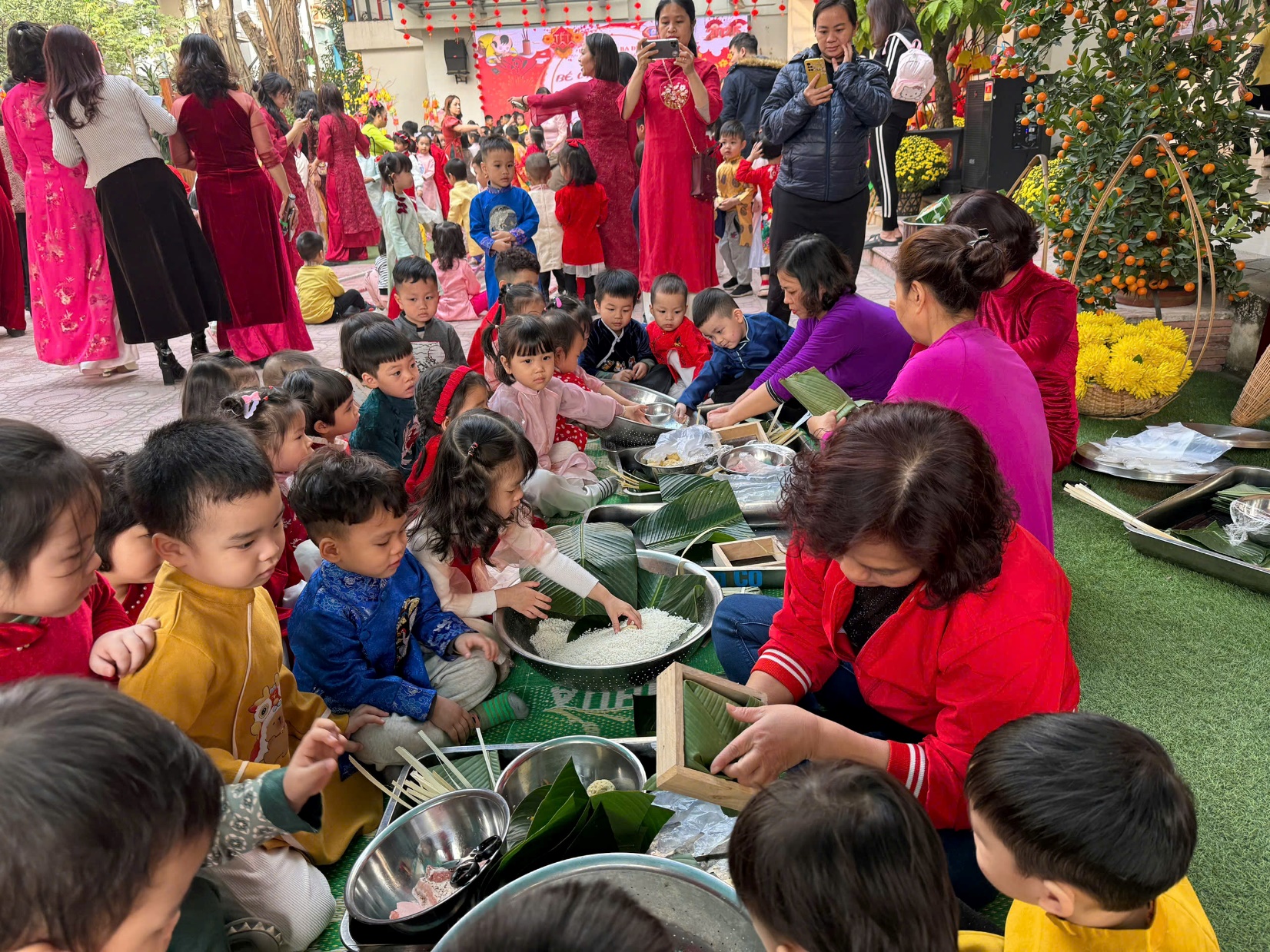 Sau lời khai mạc của cô Hiệu trưởng Lê Thi Trâm Anh, các con được tham gia rất nhiều các trò chơi dân gian như: Bắt vịt, ném còn, ném cổ chai, đi cà kheo, kéo co, múa sạp..... và 1 hoạt động hấp dẫn là : Gói bánh chưng.