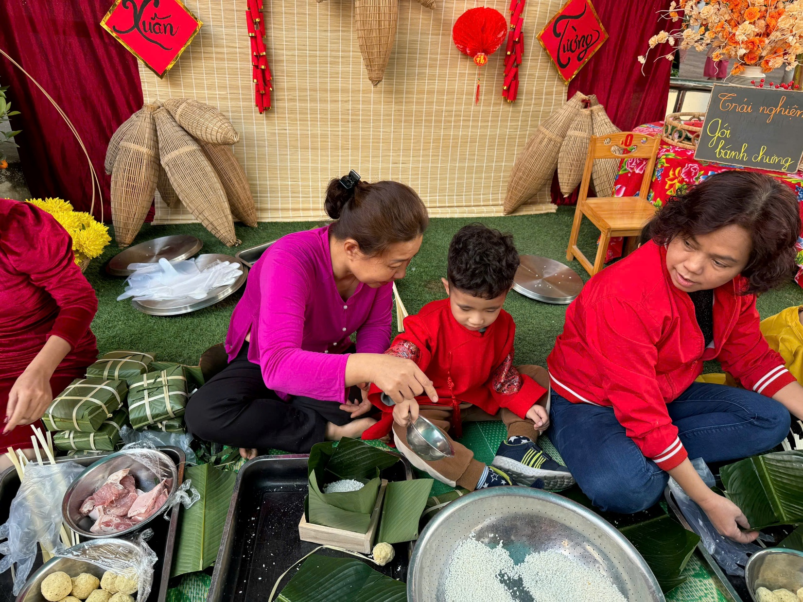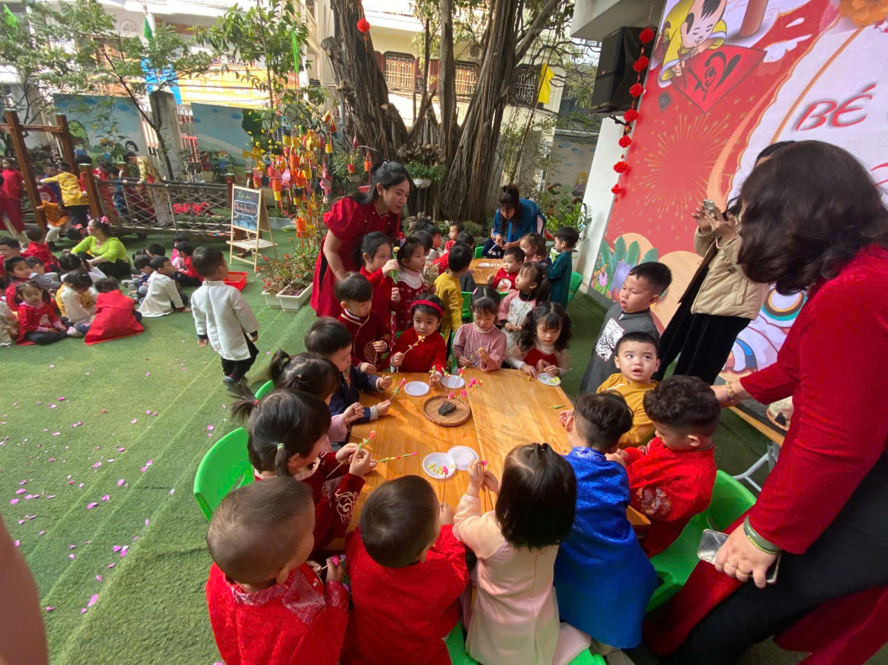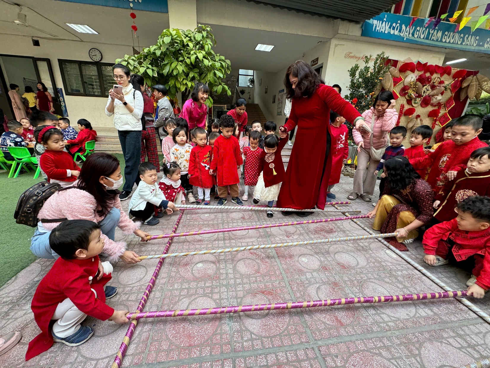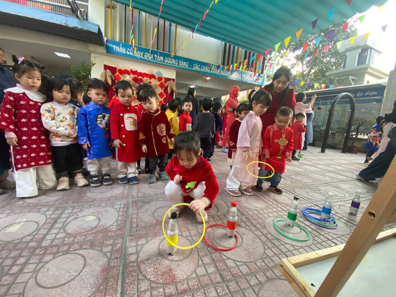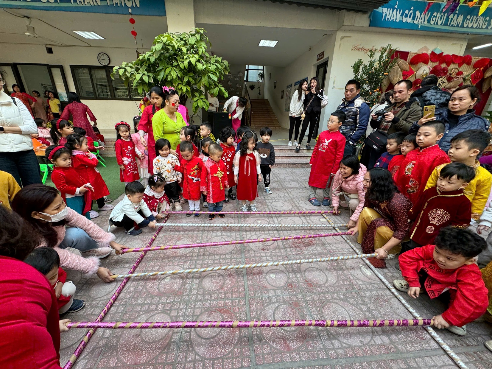 Sau lời khai mạc của cô Hiệu trưởng Lê Thi Trâm Anh, các con được tham gia rất nhiều các trò chơi dân gian như: Bắt vịt, ném còn, ném cổ chai, đi cà kheo, kéo co, múa sạp..... và 1 hoạt động hấp dẫn là : Gói bánh chưng.