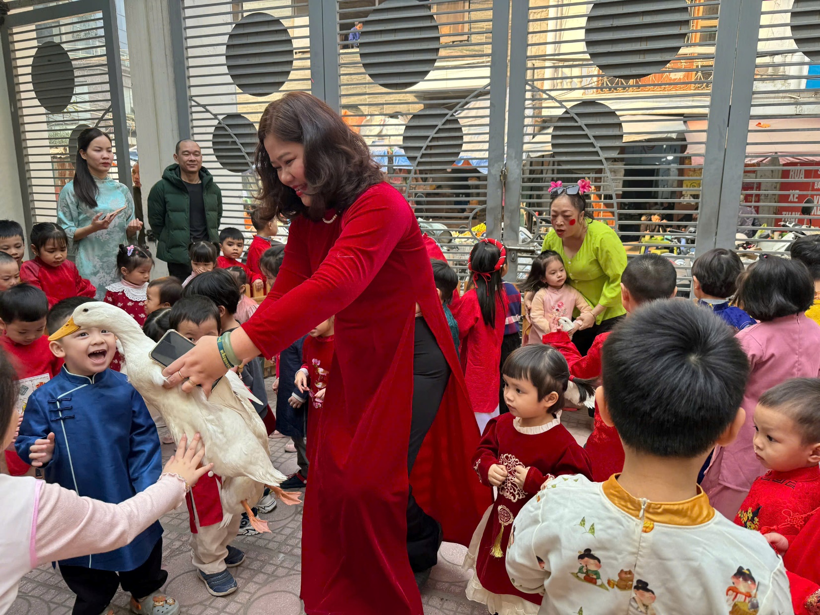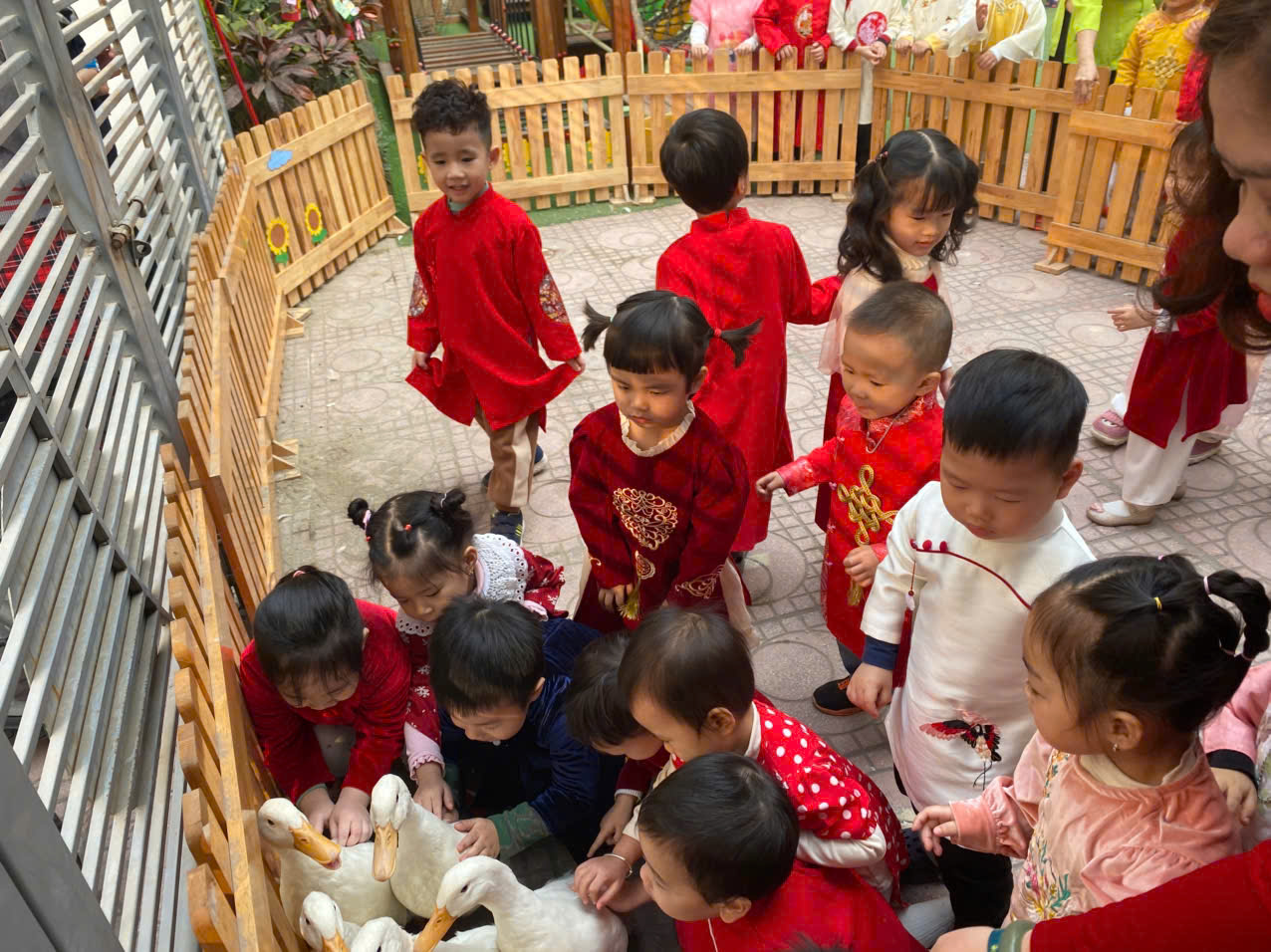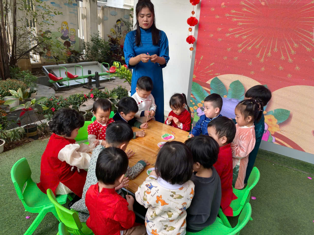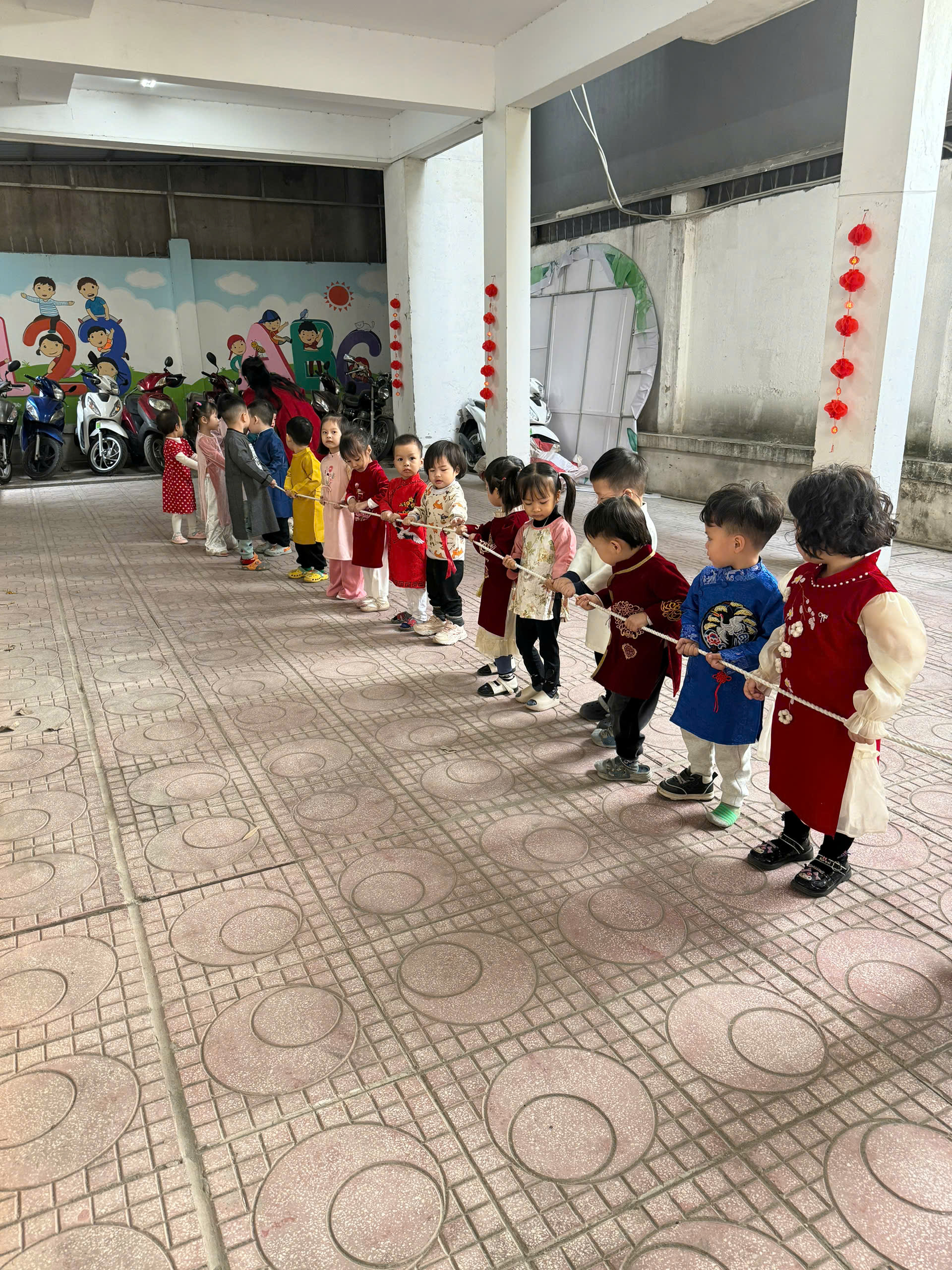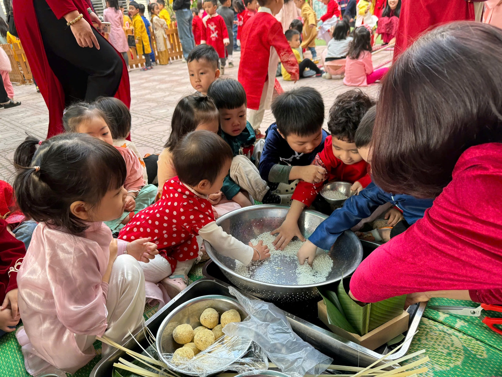 Sau lời khai mạc của cô Hiệu trưởng Lê Thi Trâm Anh, các con được tham gia rất nhiều các trò chơi dân gian như: Bắt vịt, ném còn, ném cổ chai, đi cà kheo, kéo co, múa sạp..... và 1 hoạt động hấp dẫn là : Gói bánh chưng.