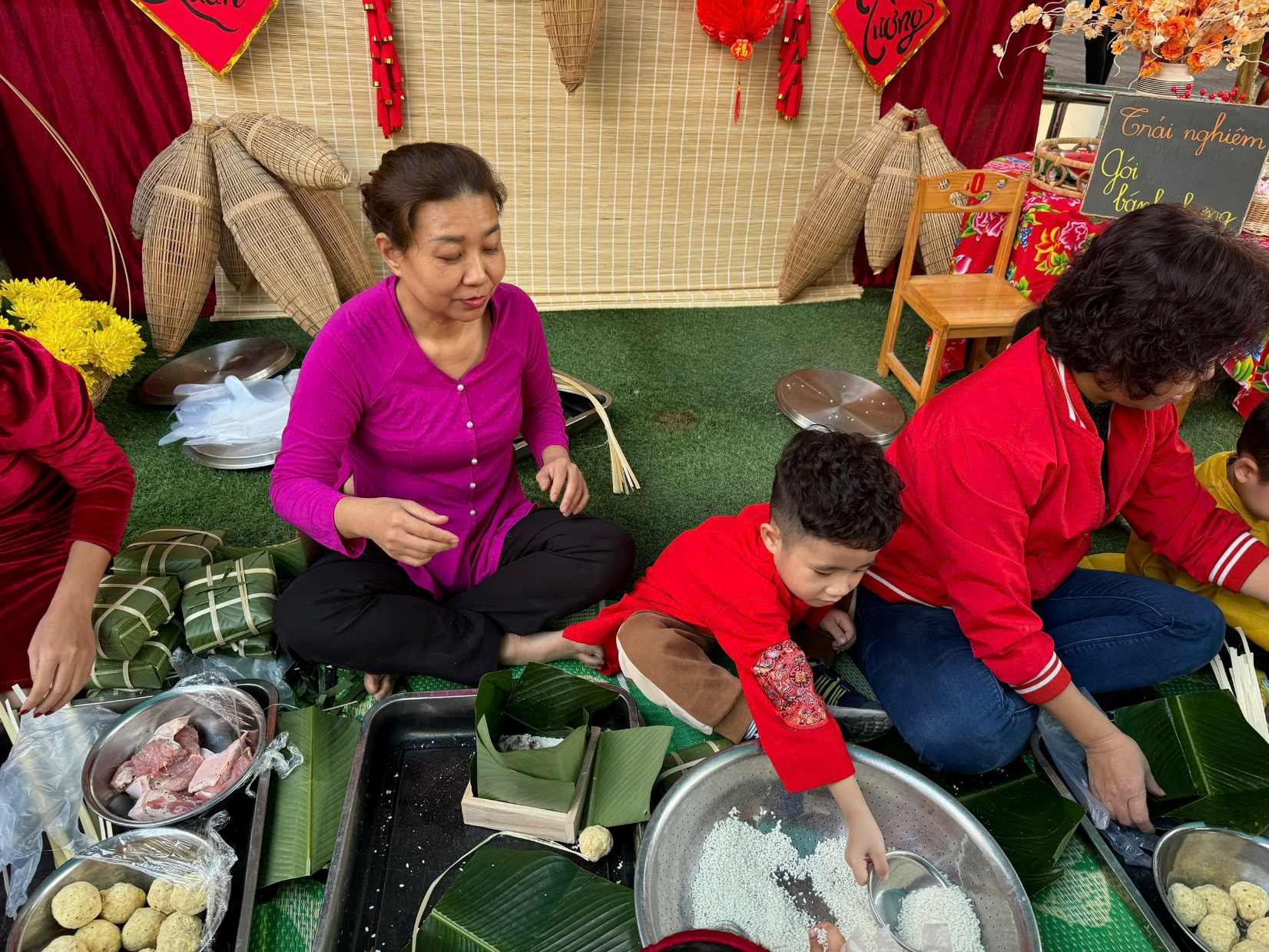 ☘️Đến phần gói bánh chưng, bé nào cũng rất thích thú và phấn khởi khi được xem các bác, các cô xếp lá, đổ gạo, cho đỗ xanh, thịt lợn ..... để làm một chiếc bánh chưng. Trong không khí rộn ràng của những ngày giáp tết, các bé sẽ được khám phá về món ăn truyền thống của dân tộc - chiếc bánh chưng xanh.
