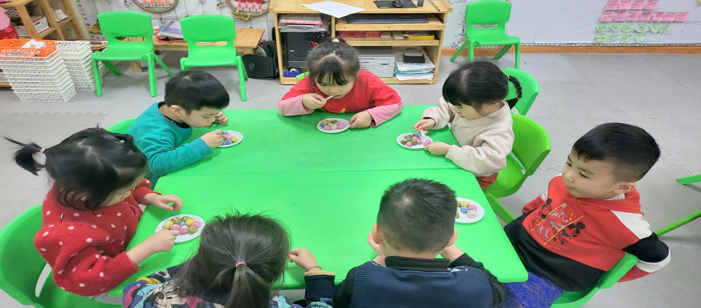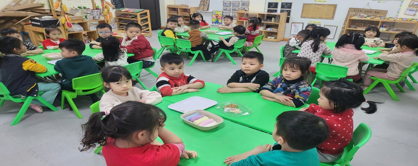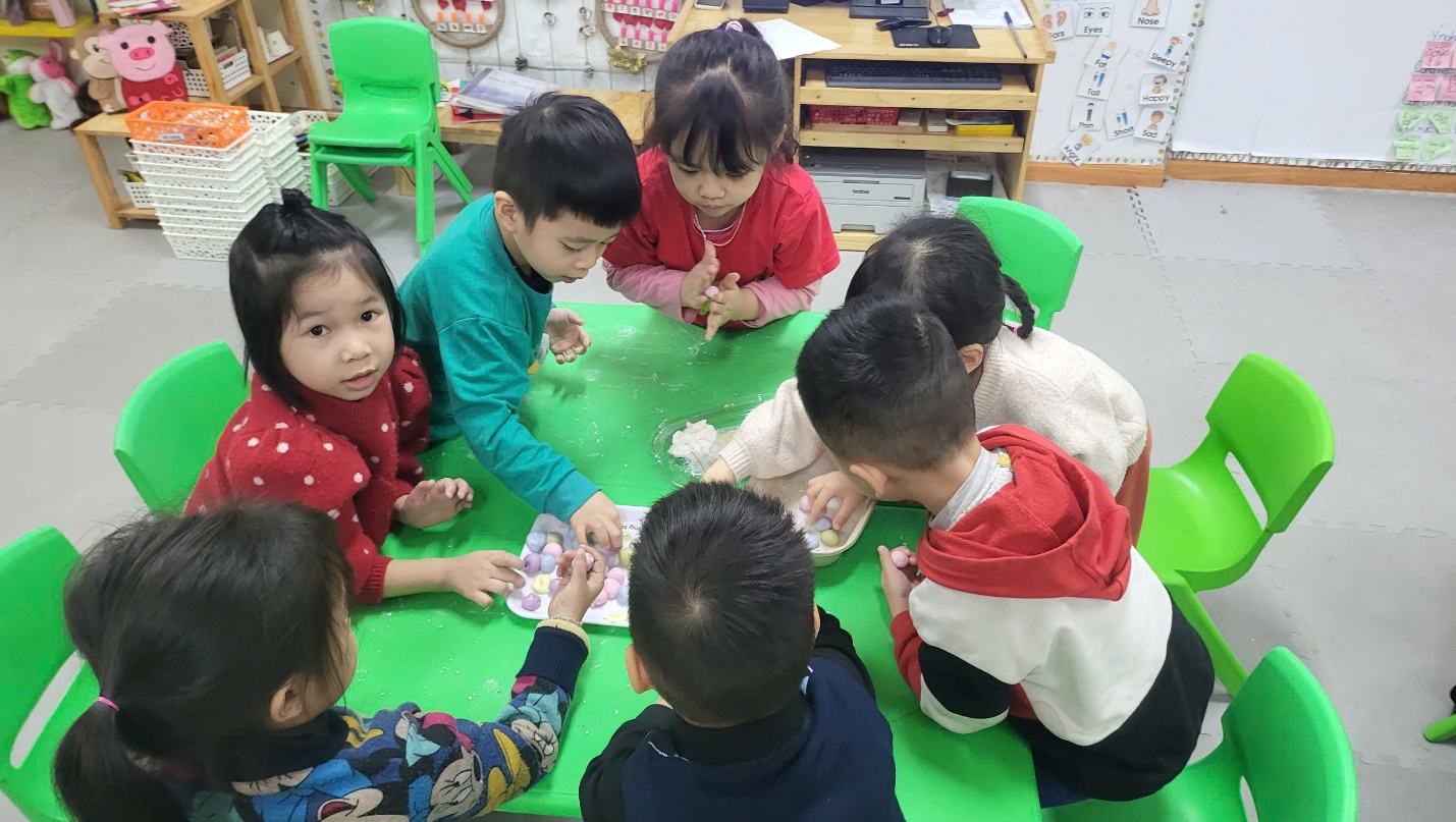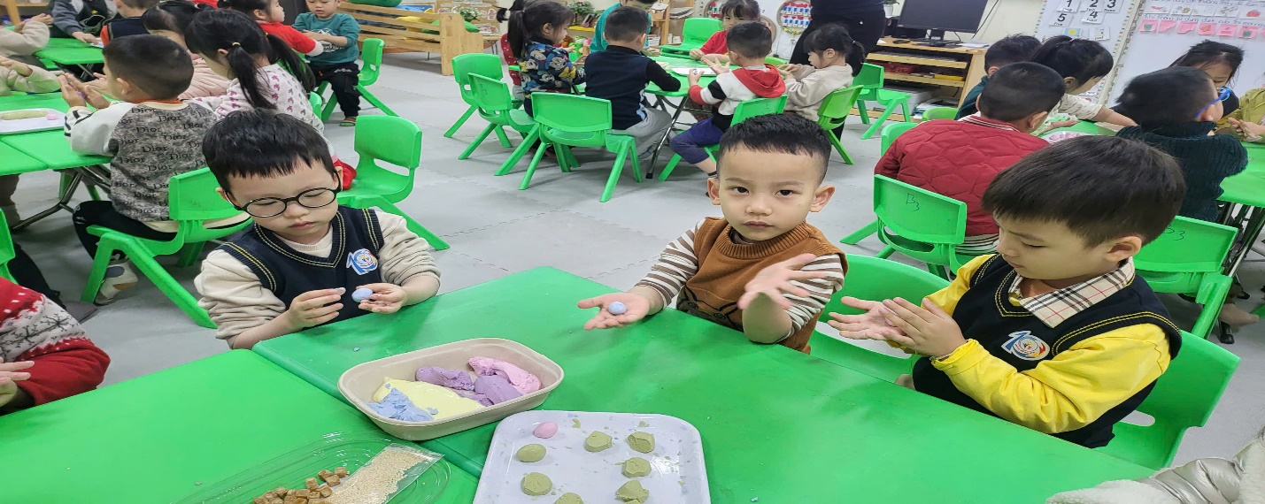 Xuất phát từ ý nghĩa đó, các bé lớp Mẫu giáo nhỡ B3 được tham gia hoạt động nặn bánh trôi ngũ sắc “Tết Hàn thực” tại trường. Các bé được rèn luyện kỹ năng xoay tròn và làm ra những viên bánh trôi tròn tròn, xinh xắn trông thật đẹp mắt. Trước khi bắt tay vào làm, các bé được nghe cô giáo kể về ý nghĩa của ngày Tết Hàn Thực.