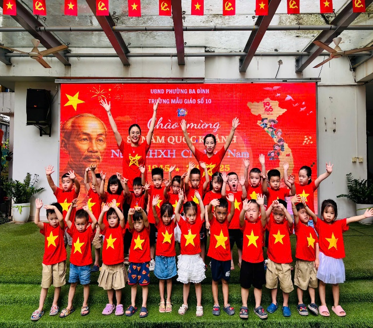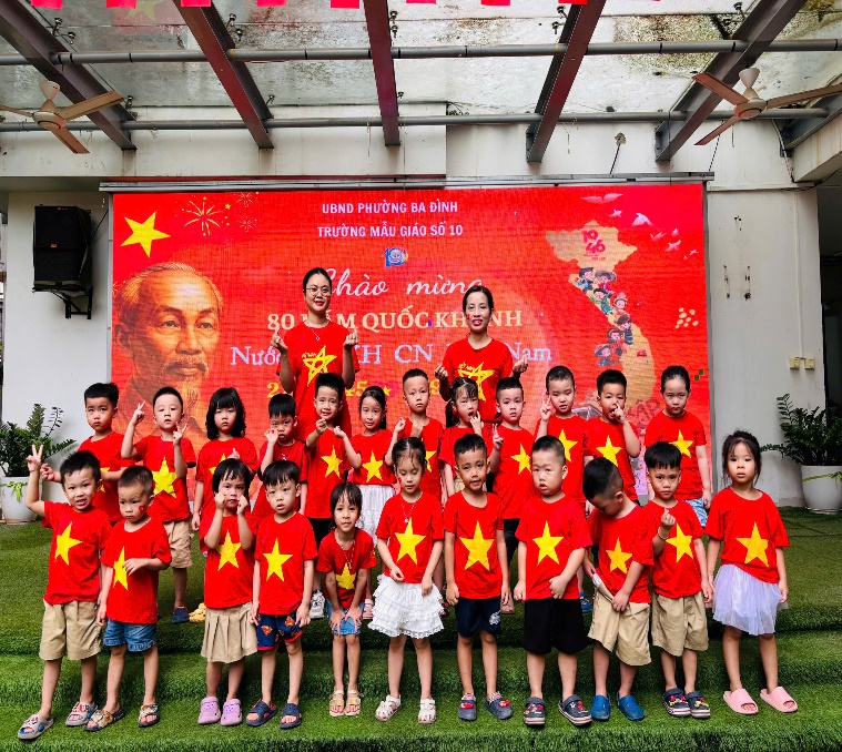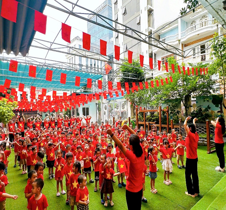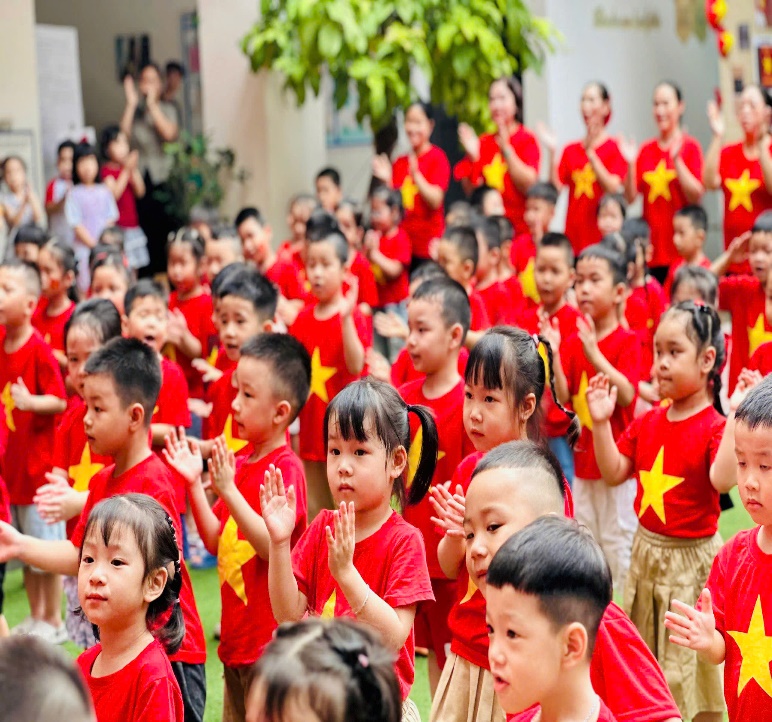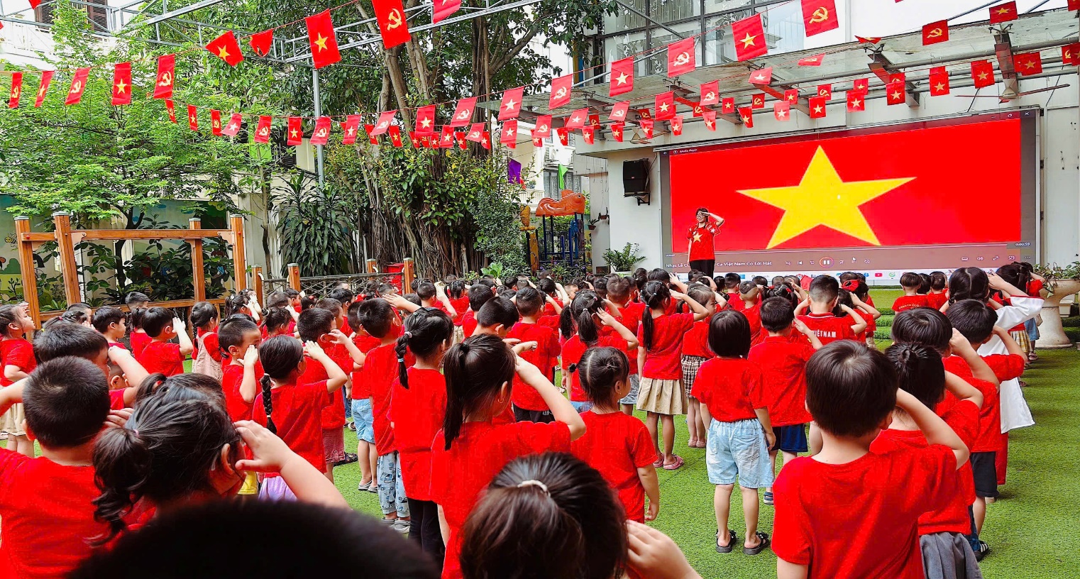 Các con đã được xuống sân trường tham gia lễ chào cờ cùng toàn trường. Trong không khí trang nghiêm và tự hào, các con đã cùng nhau hát Quốc ca thật to, thật hào hùng. Sau đó, cả trường lại cùng cất vang lời ca "Như có Bác Hồ trong ngày vui đại thắng" – một bài hát quen thuộc nhưng luôn gợi lên niềm vui và sự phấn khởi. Buổi lễ kết thúc bằng những bức ảnh tập thể đầy ắp nụ cười, lưu giữ kỷ niệm đẹp về một Ngày Quốc khánh đáng nhớ.