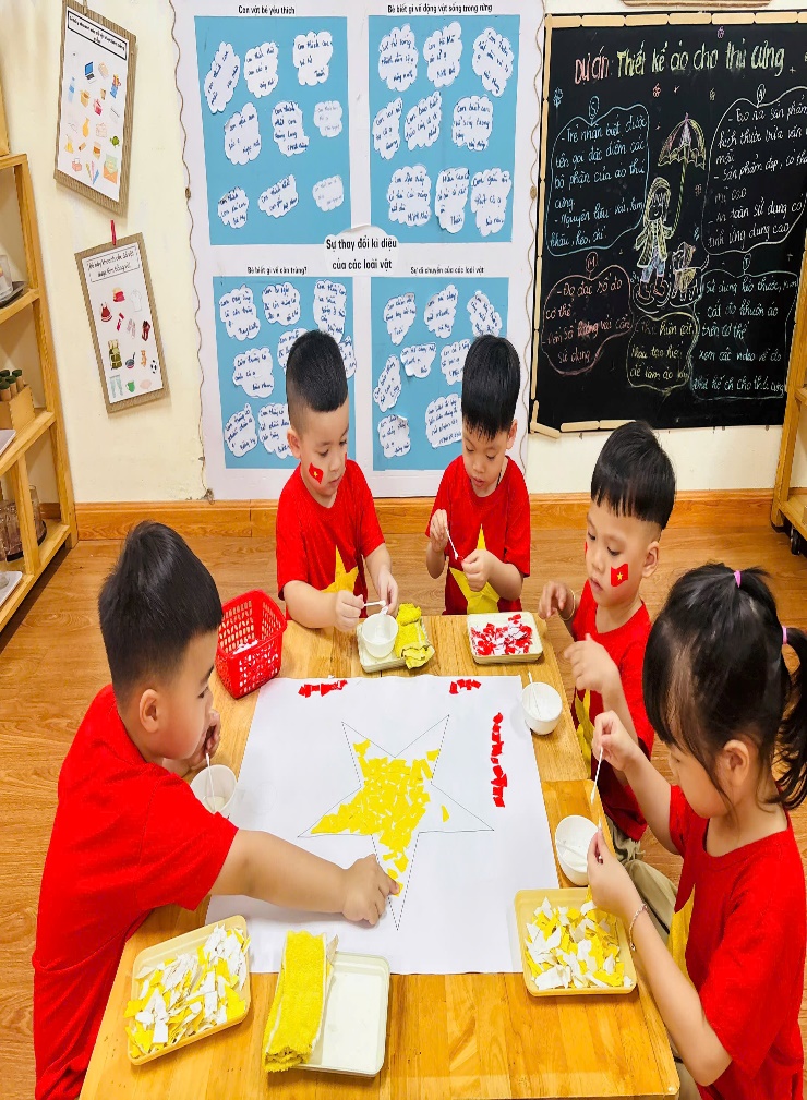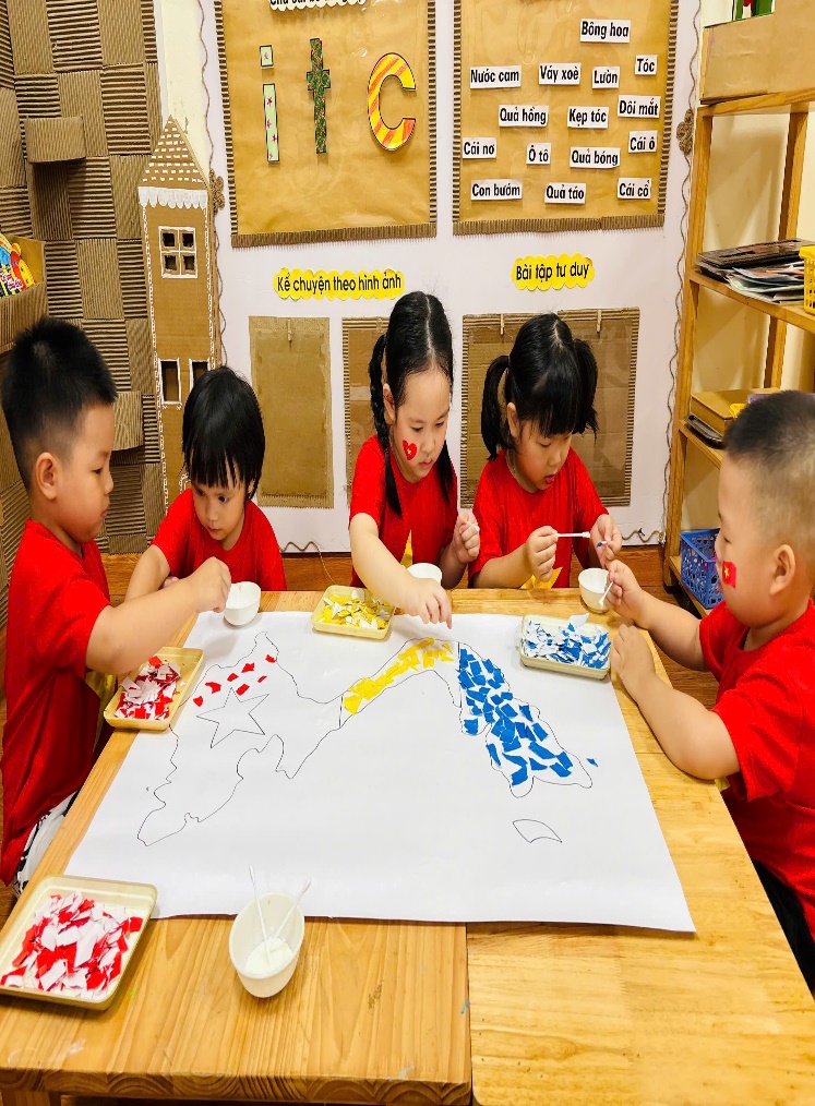 Hoạt động xé dán sáng tạo với đôi bàn tay khéo léo, các con đã cùng nhau xé dán bản đồ Việt Nam và xé dán lá cờ Tổ quốc. Từng mảnh giấy nhỏ được các con tỉ mỉ ghép lại, tạo nên hình ảnh đất nước thân thương và lá cờ đỏ sao vàng thiêng liêng. Các con còn được chụp ảnh với phông nền đặc biệt của Ngày Quốc khánh, lưu lại những khoảnh khắc đáng yêu và ý nghĩa này.