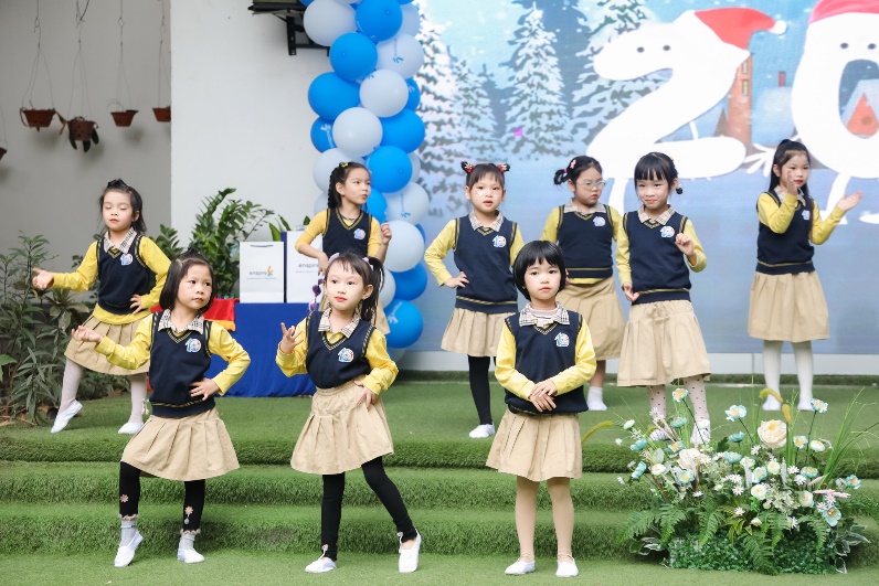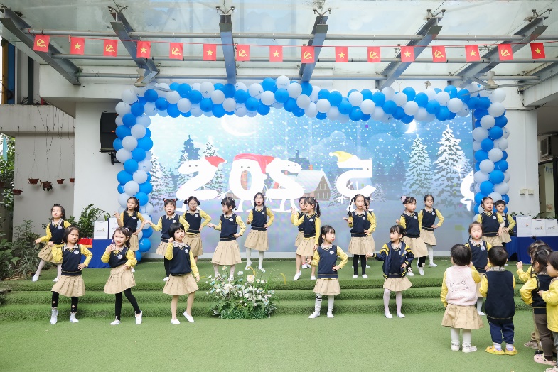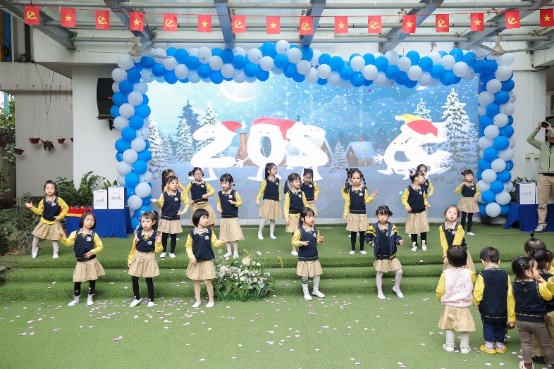 Mở đầu chương trình với các tiết mục văn nghệ chào đón năm mới của các bạn nhỏ khối Mẫu giáo lớn: “Bingo” và “Happy New Year”
