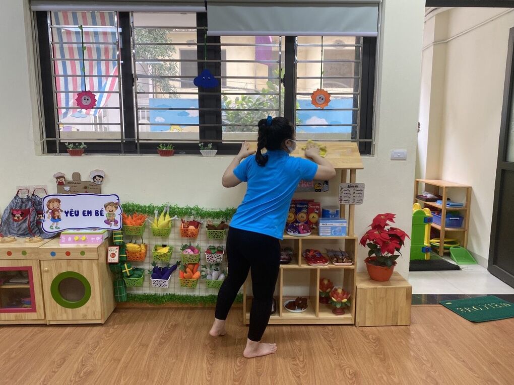 Sau buổi họp, ngay hôm sau các tổ chuyên môn đã tổ chức cho giáo viên, nhân viên tổng vệ sinh môi trường, phòng nhóm, đồ dùng, đồ chơi, đồ dùng bán trú của trẻ sạch sẽ mặc dù trước đó nhà trường vẫn còn là trạm y tế lưu động của Phường. Với sự nhiệt tình, trách nhiệm dù đang là dịp nghỉ lễ 10/3, nhưng các giáo viên và nhân viên nhà trường vẫn tích cực vệ sinh, sắp xếp, trang trí phòng nhóm, các khu vực trong nhà trường, kiểm tra rà soát các đồ dùng, thiết bị phòng chống dịch bệnh covid-19 để đảm bảo sẵn sàng đón các con học sinh tới trường.