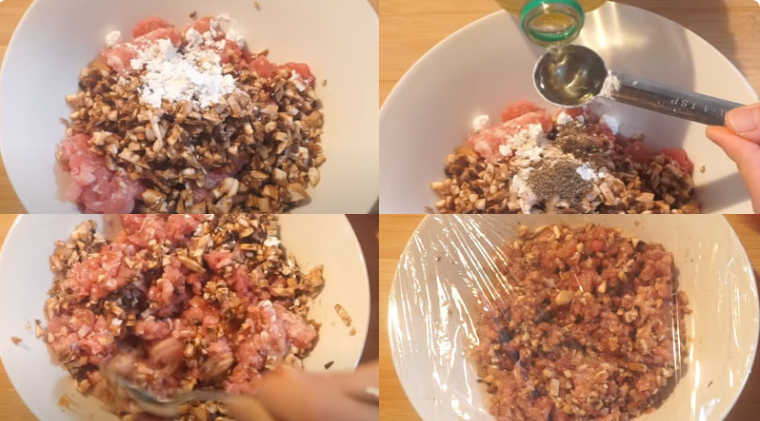 Bước 2. Làm nhân bánh: Thịt tẩm ướp, miến và mọc nhĩ sơ chế và cắt nhỏ. Hành khô phi thơm trộn đều với thịt. Trứng cút luộc chin