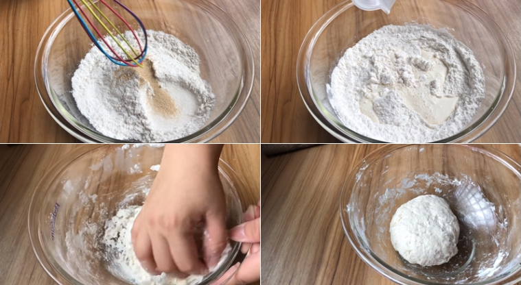 Bước 1. Nhào và ủ bột: Trộn đều hỗn hợp, đường, muối, men nở,và nước, đánh lên cho đều sau đó đổ vào bột cho vào máy đánh từ 12 đến 15 phút.