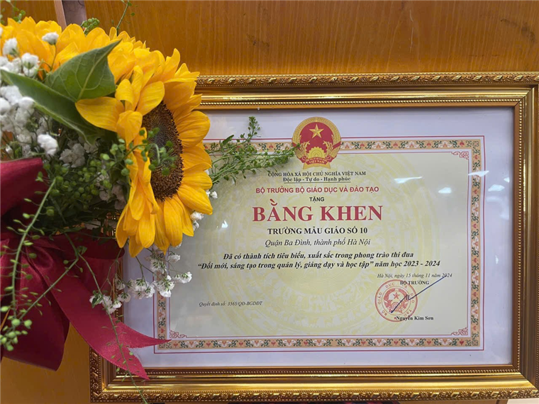 Sáng nay, 19/11/2024, tại "Lễ tuyên dương khen thưởng các điển hình tiên tiến, nhà giáo tiêu biểu năm 2023-2024, chào mừng 42 năm Ngày Nhà giáo Việt Nam 20/11" do Phòng Giáo dục và Đào tạo quận Ba Đình tổ chức, trường Mẫu Giáo Số 10 đã vinh dự được nhận Bằng khen cao quý của Bộ GDĐT vì "Đã có thành tích tiêu biểu, xuất sắc trong phong trào thi đua "Đổi mới, sáng tạo trong quản lý, giảng dạy và học tập " năm học 2023 - 2024.