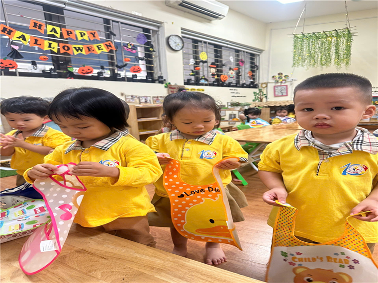 Ảnh: Các con tự lấy yếm đeo trước khi ăn cơm