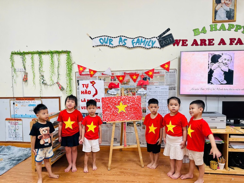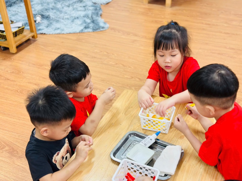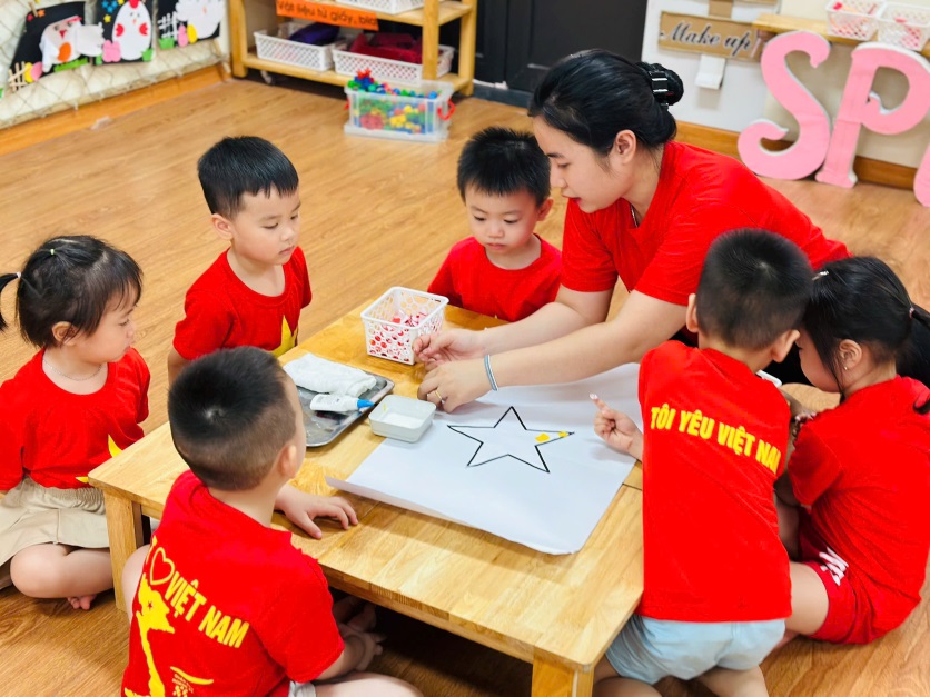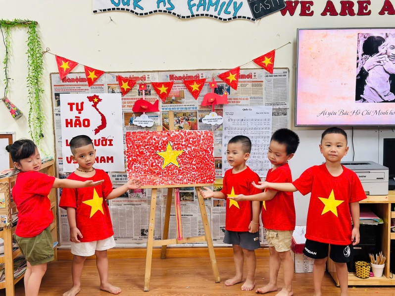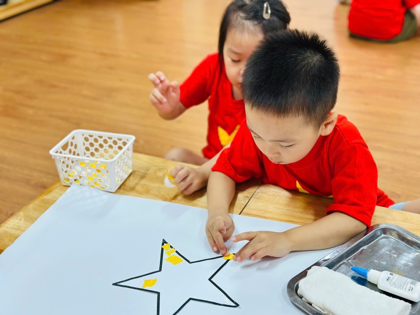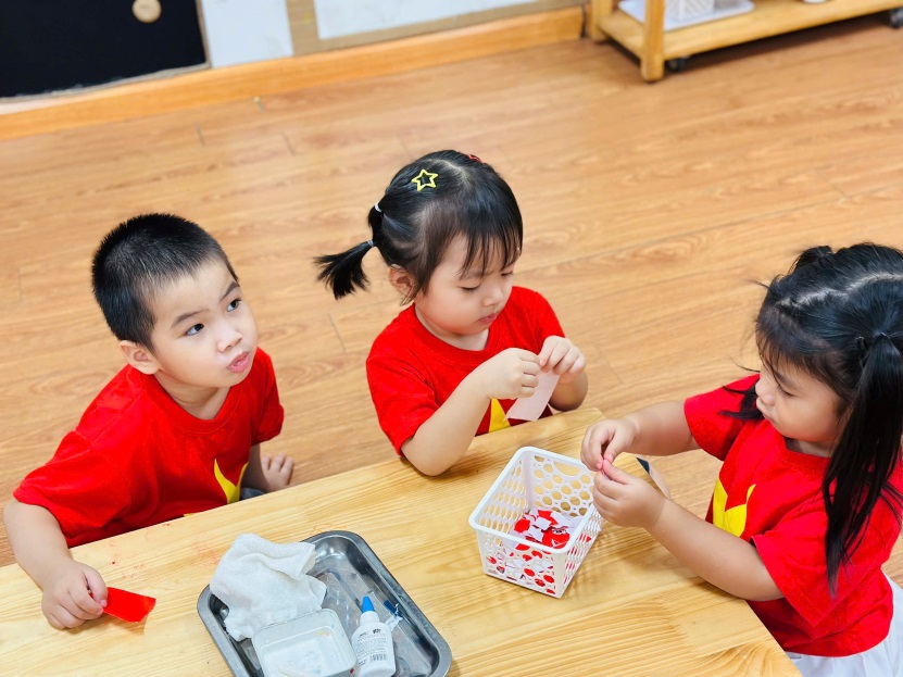 Dưới bàn tay khéo léo và sự sáng tạo hồn nhiên, những mảnh giấy đỏ, giấy vàng được các bé tỉ mỉ xé dán, ghép lại thành hình “Lá cờ đỏ sao vàng” quen thuộc. Hoạt động không chỉ mang đến cho các con niềm vui khi được trải nghiệm nghệ thuật thủ công, mà còn giúp nuôi dưỡng trong tâm hồn trẻ tình yêu đất nước, niềm tự hào dân tộc và sự kính trọng với Bác Hồ kính yêu.