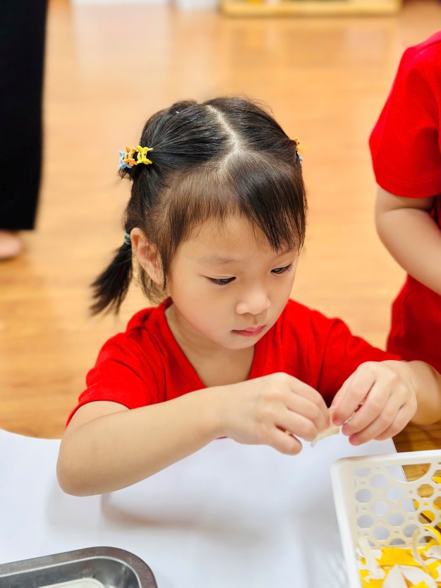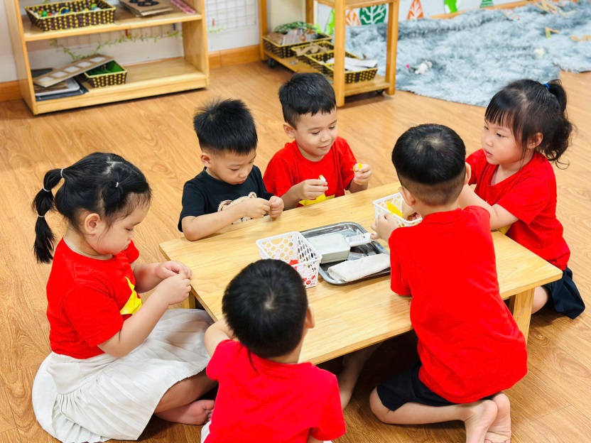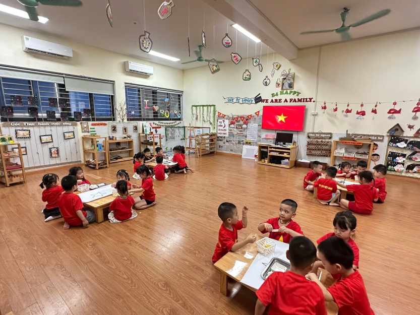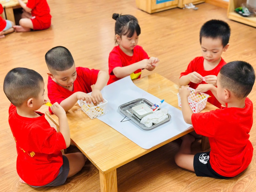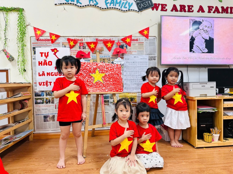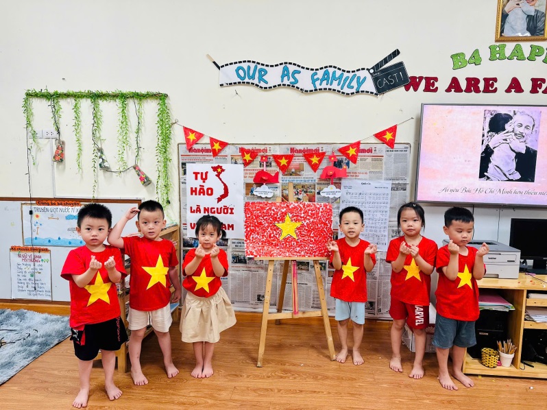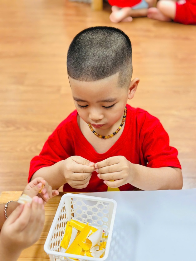 Dưới bàn tay khéo léo và sự sáng tạo hồn nhiên, những mảnh giấy đỏ, giấy vàng được các bé tỉ mỉ xé dán, ghép lại thành hình “Lá cờ đỏ sao vàng” quen thuộc. Hoạt động không chỉ mang đến cho các con niềm vui khi được trải nghiệm nghệ thuật thủ công, mà còn giúp nuôi dưỡng trong tâm hồn trẻ tình yêu đất nước, niềm tự hào dân tộc và sự kính trọng với Bác Hồ kính yêu.