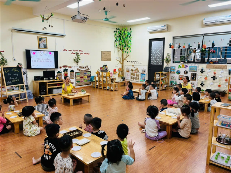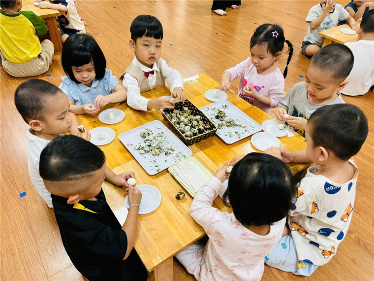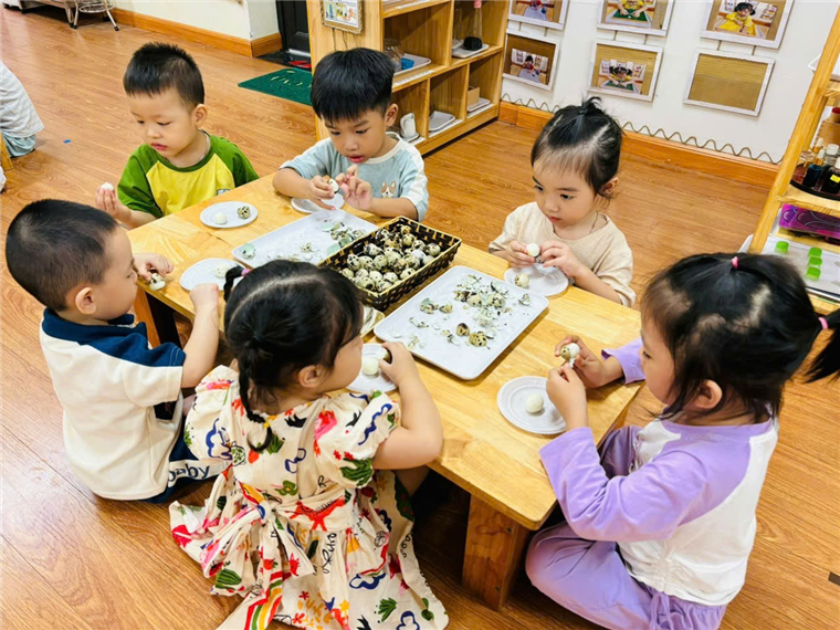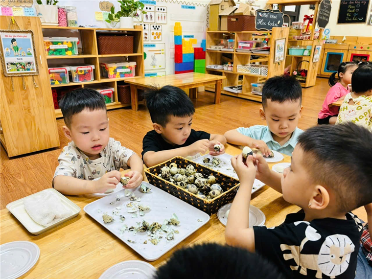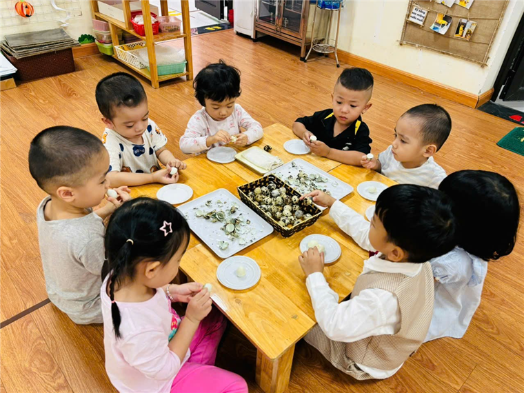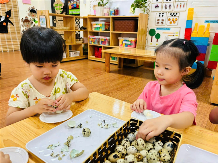 Các bé lớp MGB C2 thực hành trải nghiệm: Bóc trứng chim cút