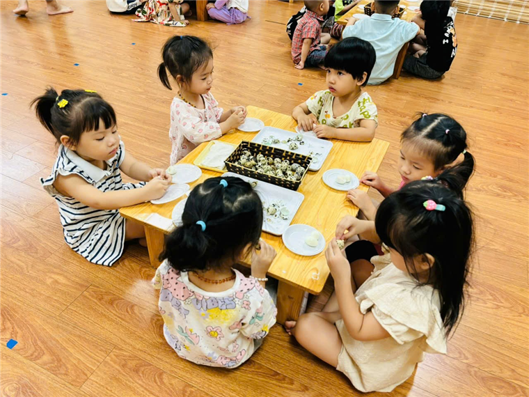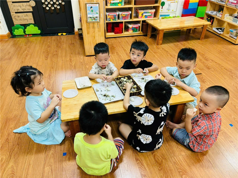 Ảnh các bé lớp C2 đang tập bóc trứng chim cút.