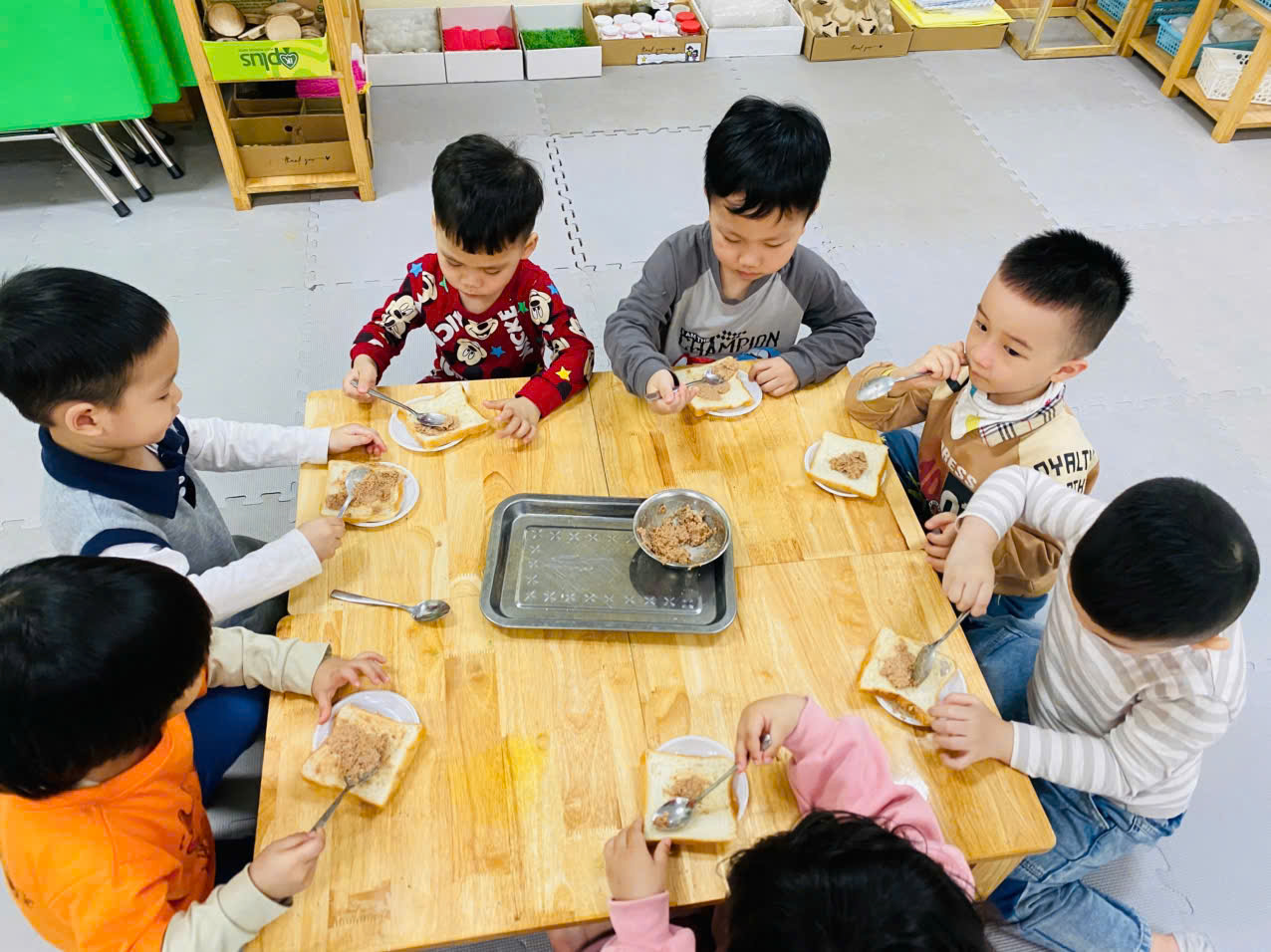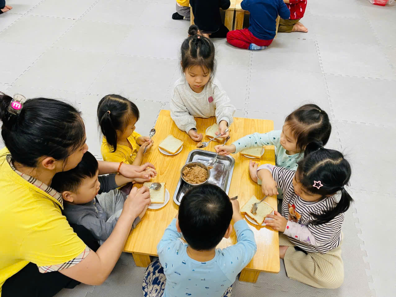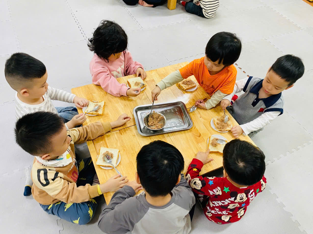 Tiếp đến là hoạt động " Bé tập làm nội trợ: Bánh mỳ kẹp pate" để góp thêm trong bữa tiệc liên hoan nhân ngày 8/3.