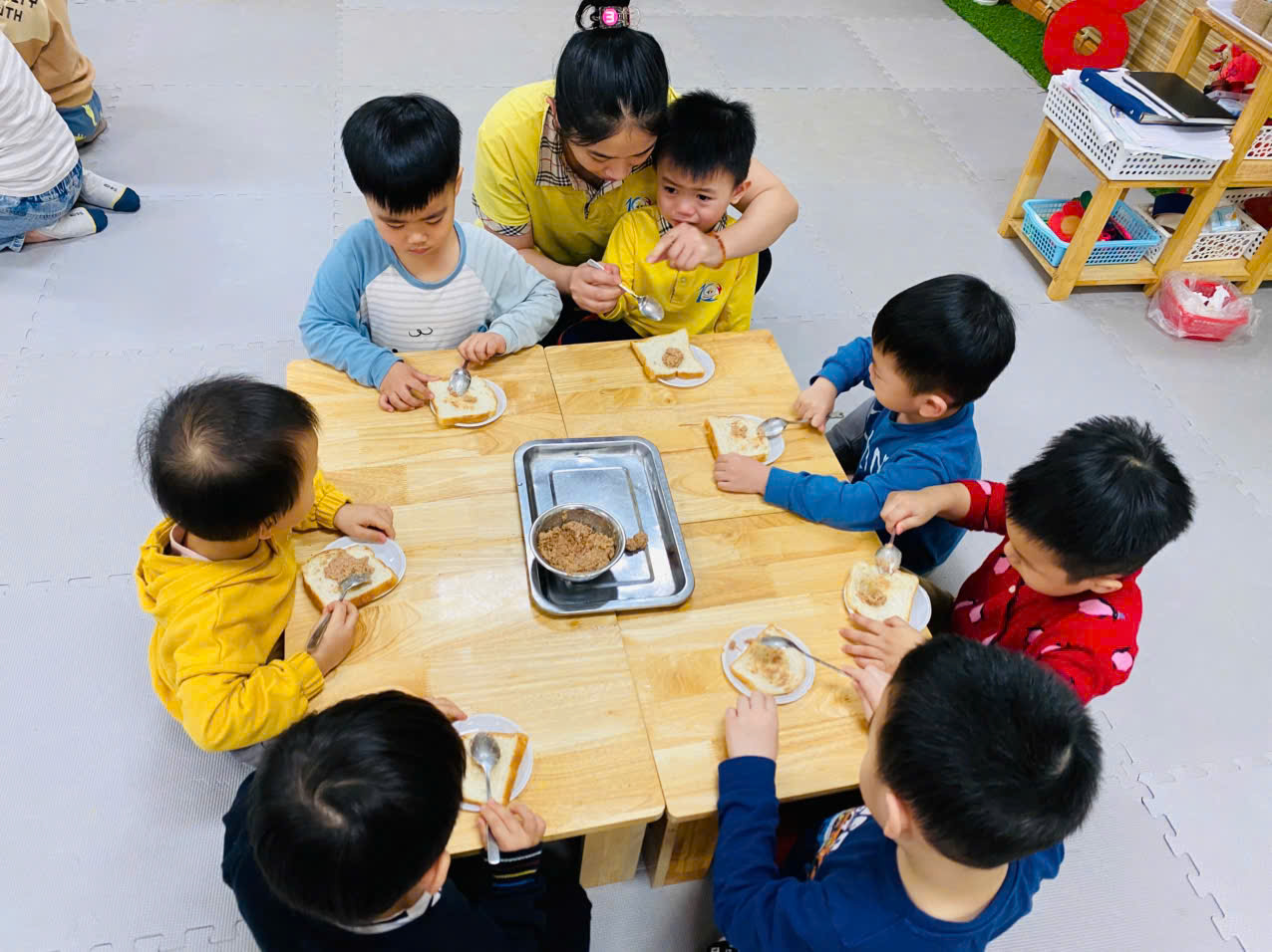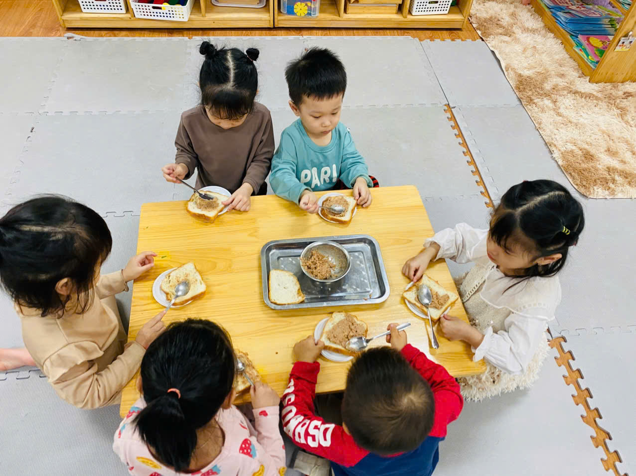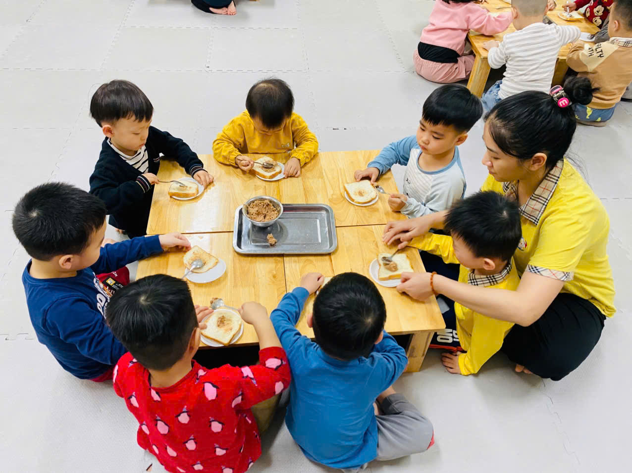 Tiếp đến là hoạt động " Bé tập làm nội trợ: Bánh mỳ kẹp pate" để góp thêm trong bữa tiệc liên hoan nhân ngày 8/3.