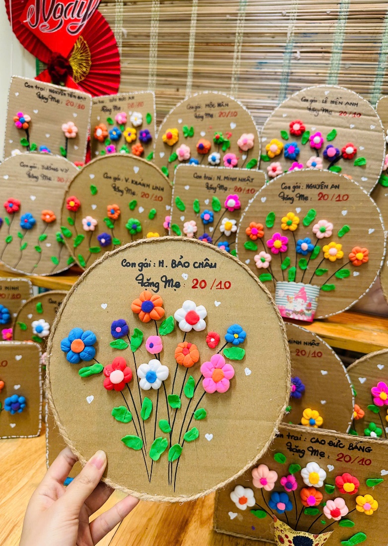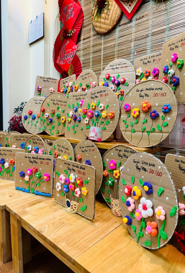 Hoà chung không khí vui tươi rộn ràng, các bé đã tự tay làm những bức tranh xinh xắn. Hoạt động này có ý nghĩa giúp các con biết trân trọng, yêu thương, những người phụ nữ xung quanh mình. Dù đôi tay bé nhỏ còn chút vụng về, những bằng tất cả nỗ lực và tình yêu dành cho bà, cho mẹ các con đã tạo lên những bức tranh thật xinh đẹp và đáng yêu.