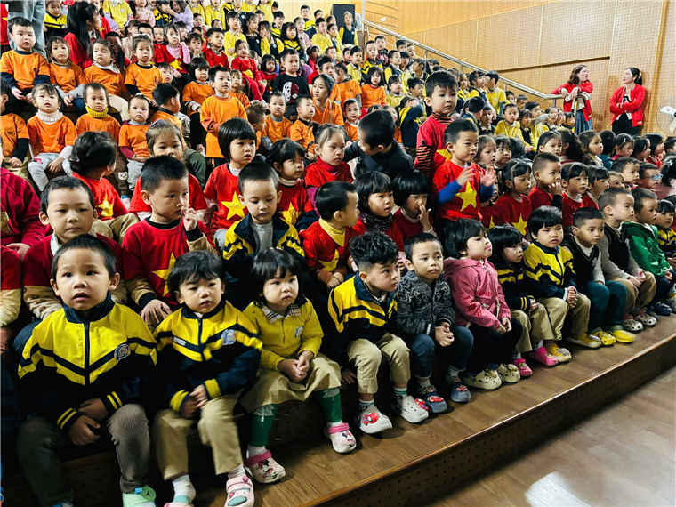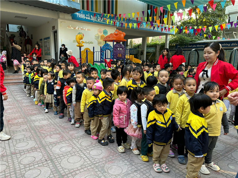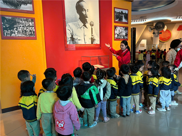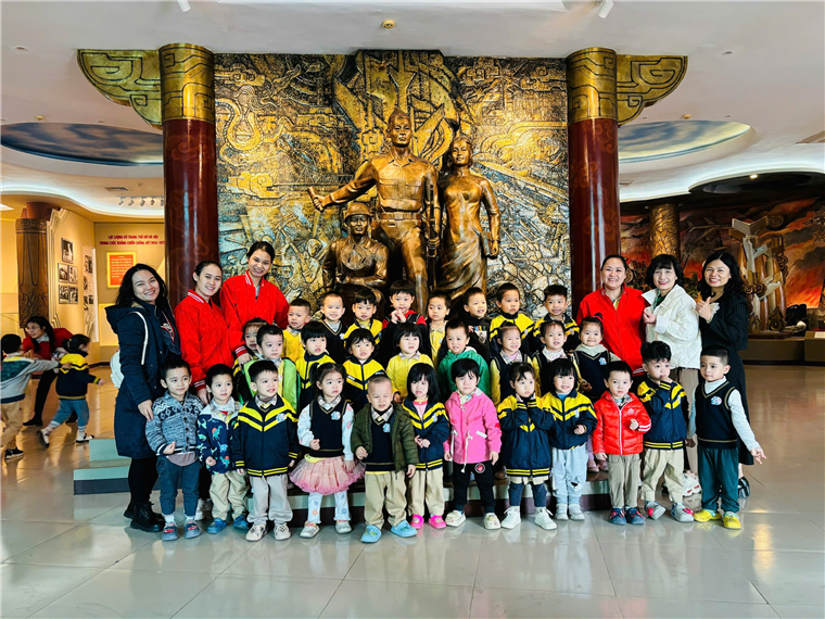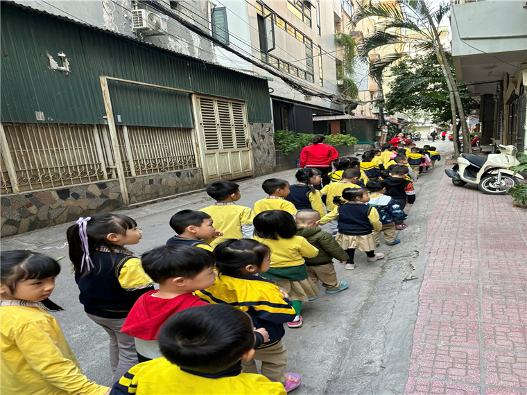 Hình ảnh các con lớp MGL A2 cùng các em lớp MGB C2 dắt tay nhau đi sang bảo tàng B52.