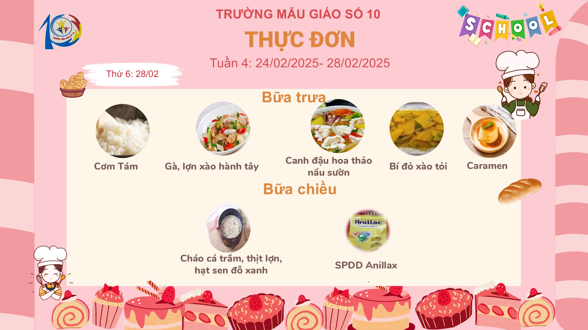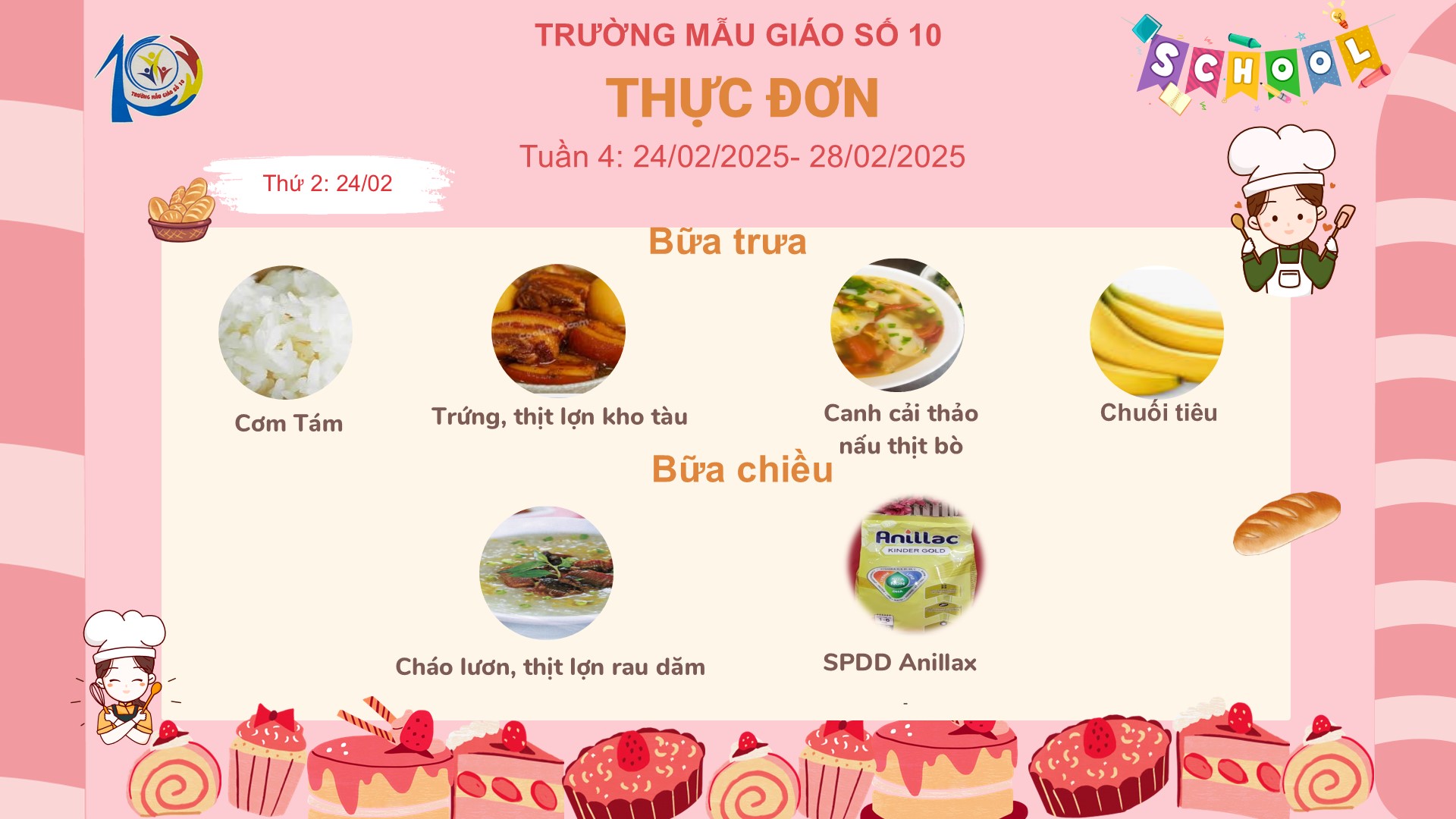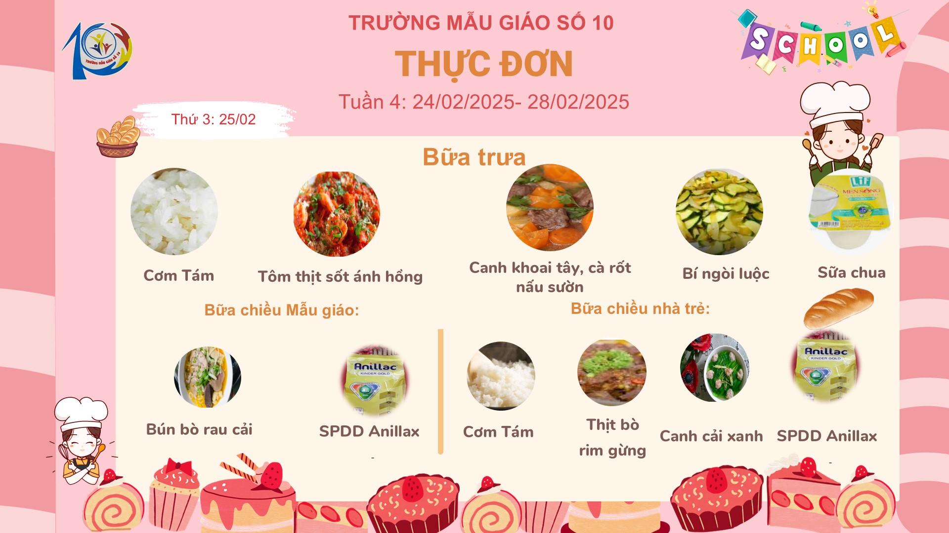 Trường Mẫu giáo Số 10 kính gửi đến quý phụ huynh thực đơn của bé tuần 4 tháng 02/2025 (từ ngày 24/02/2025 đến ngày 28/02/2025)