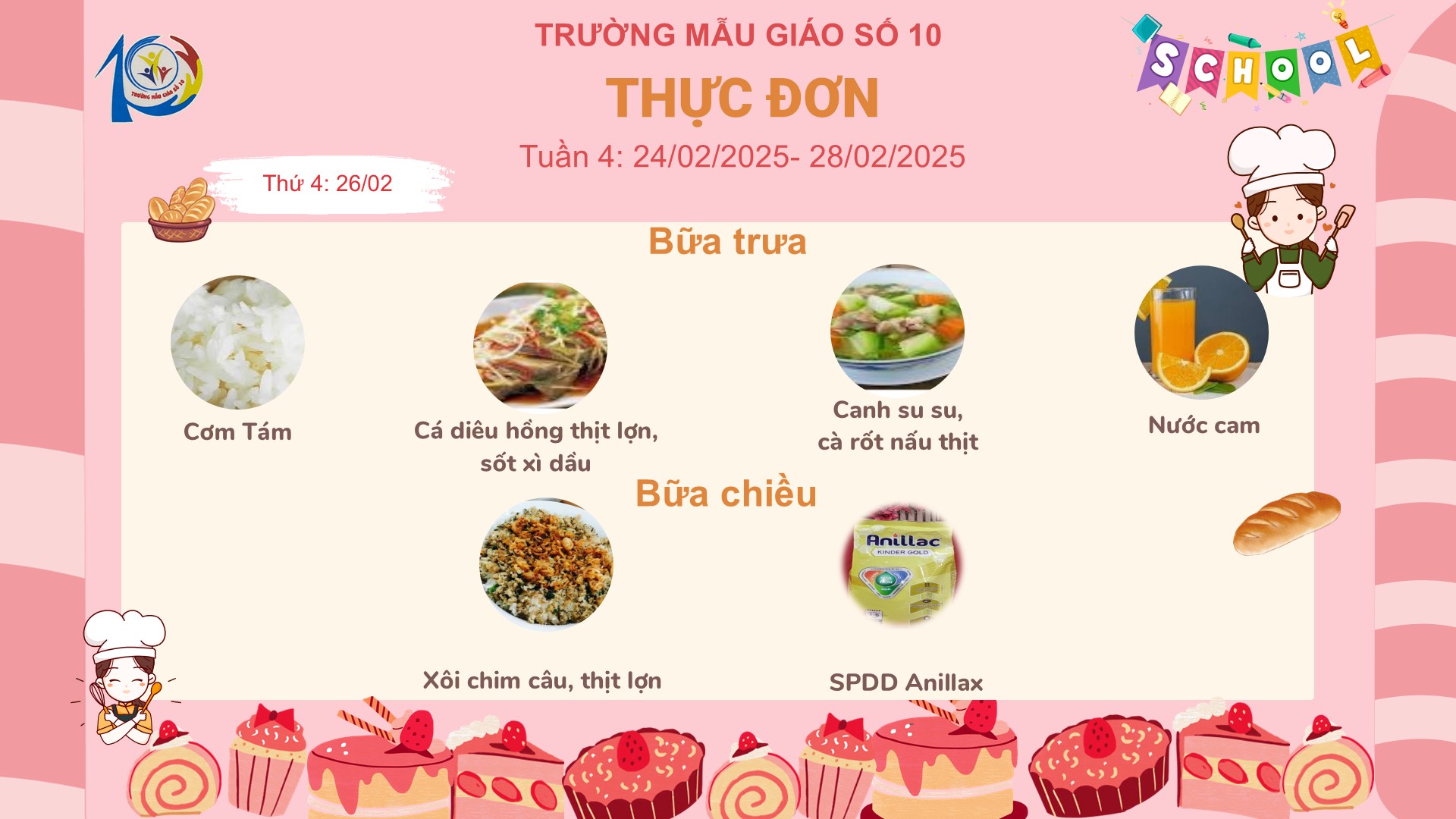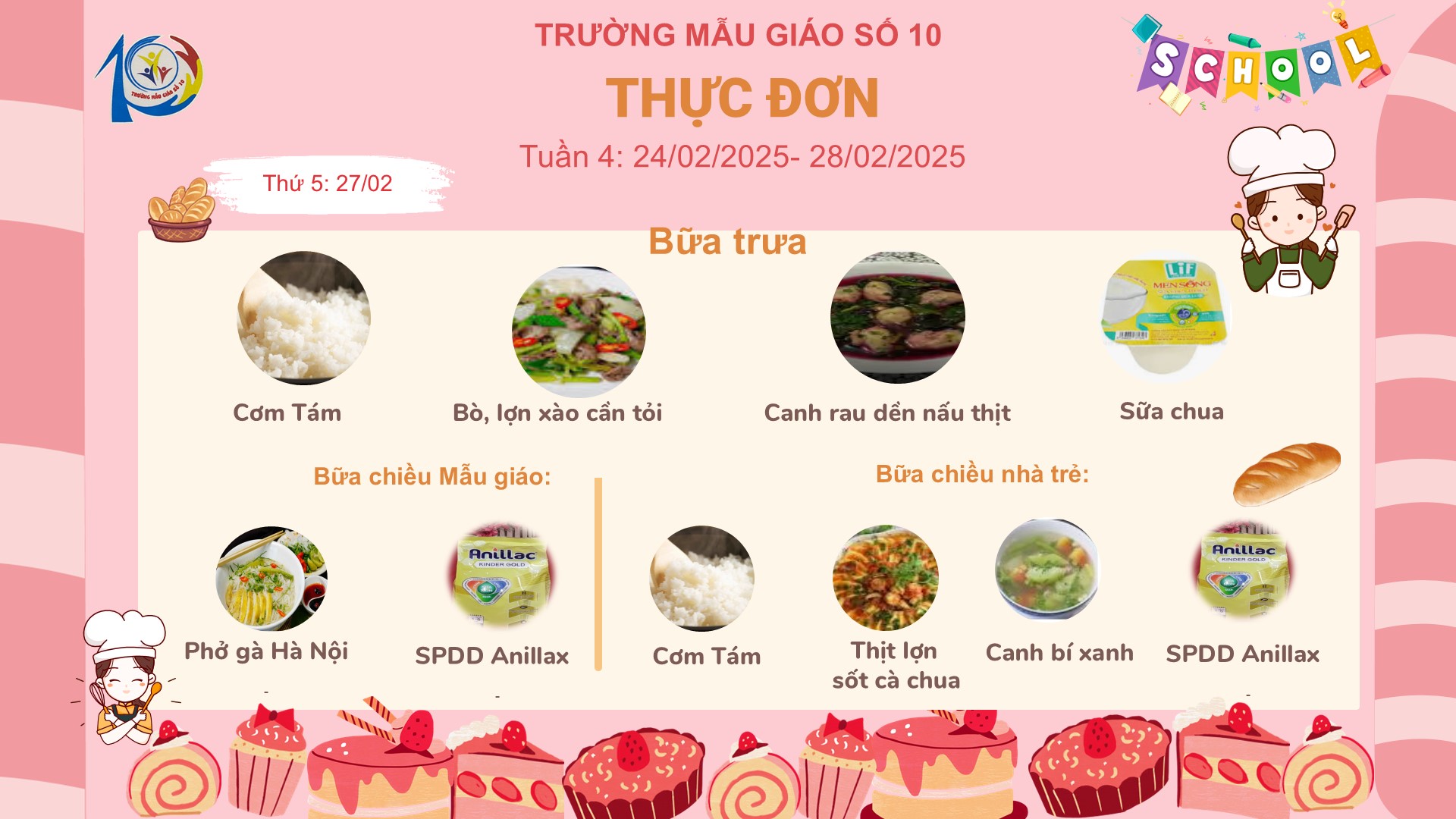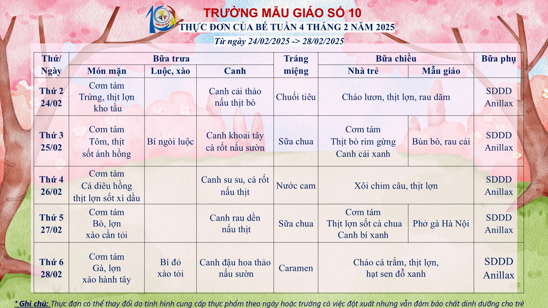 Trường Mẫu giáo Số 10 kính gửi đến quý phụ huynh thực đơn của bé tuần 4 tháng 02/2025 (từ ngày 24/02/2025 đến ngày 28/02/2025)